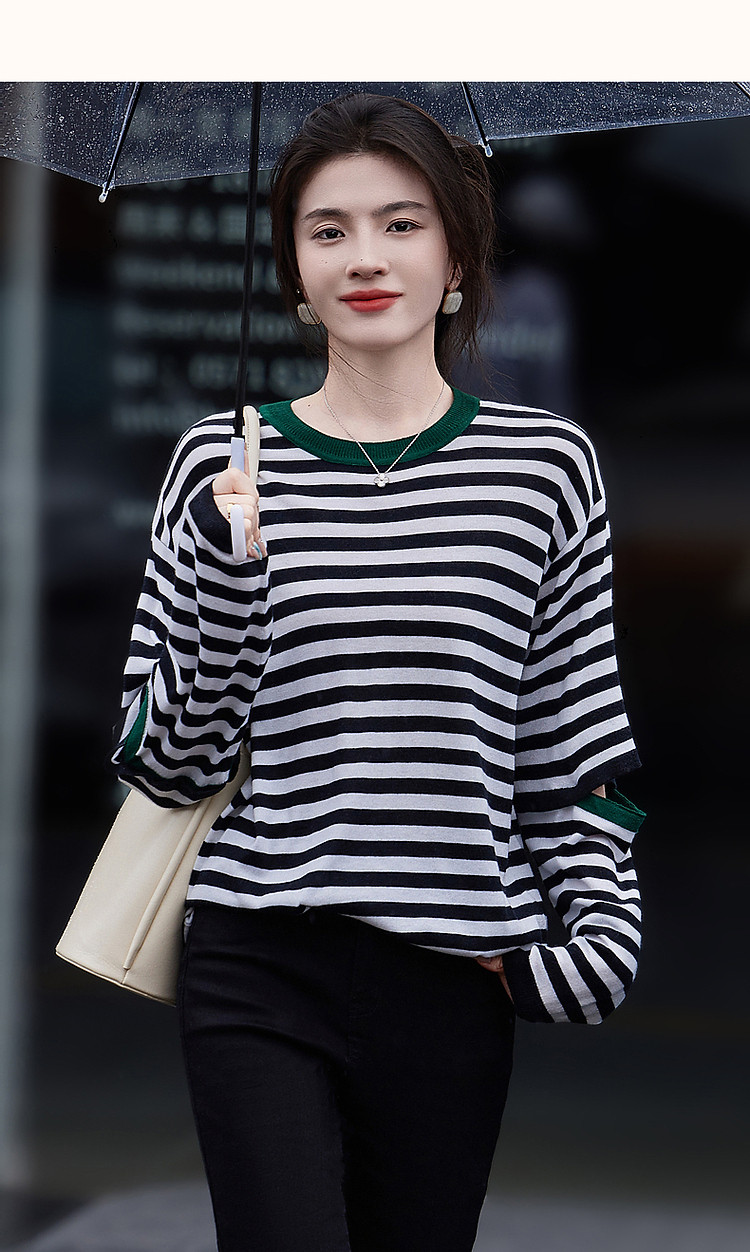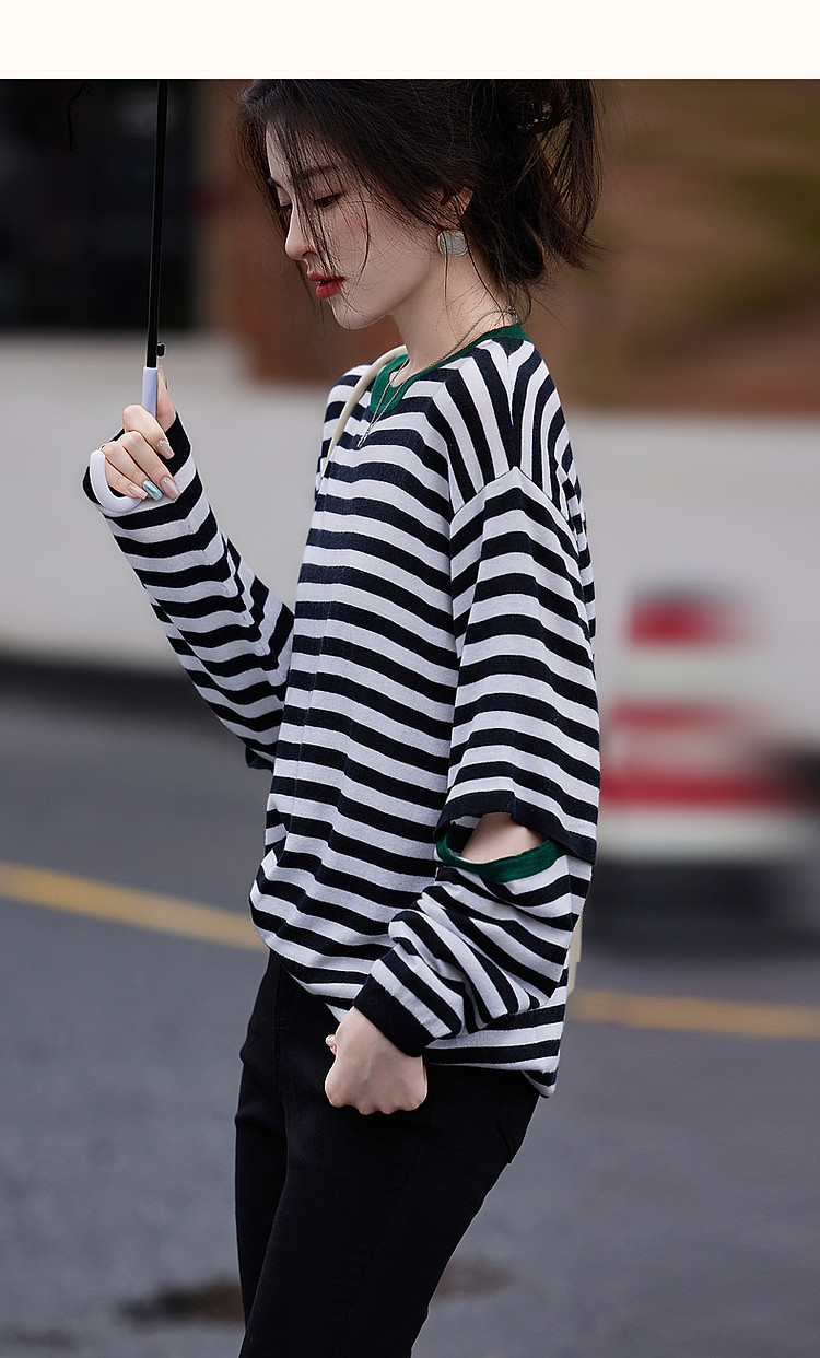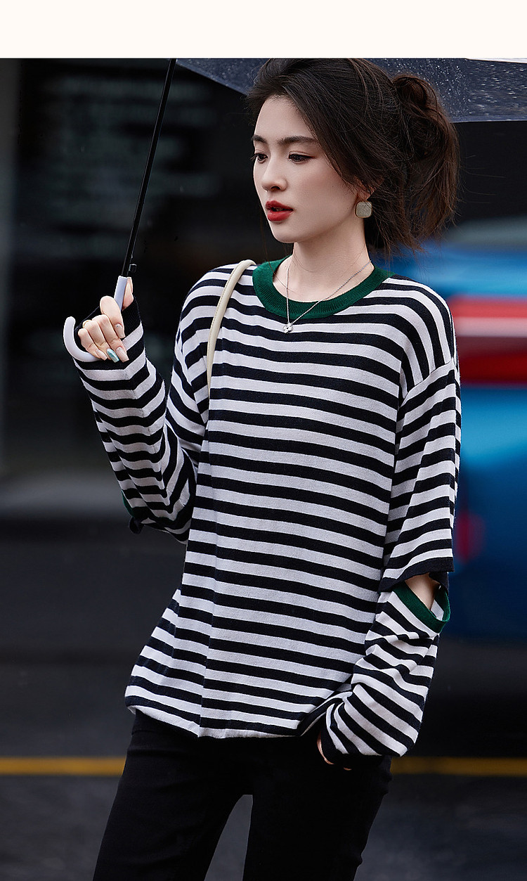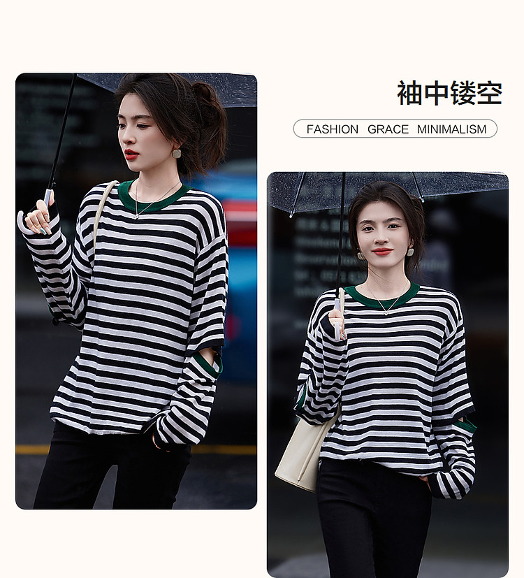 【韩风穿搭示范】春设计感袖中镂空条纹线衫撞色针织衫女上衣 396225