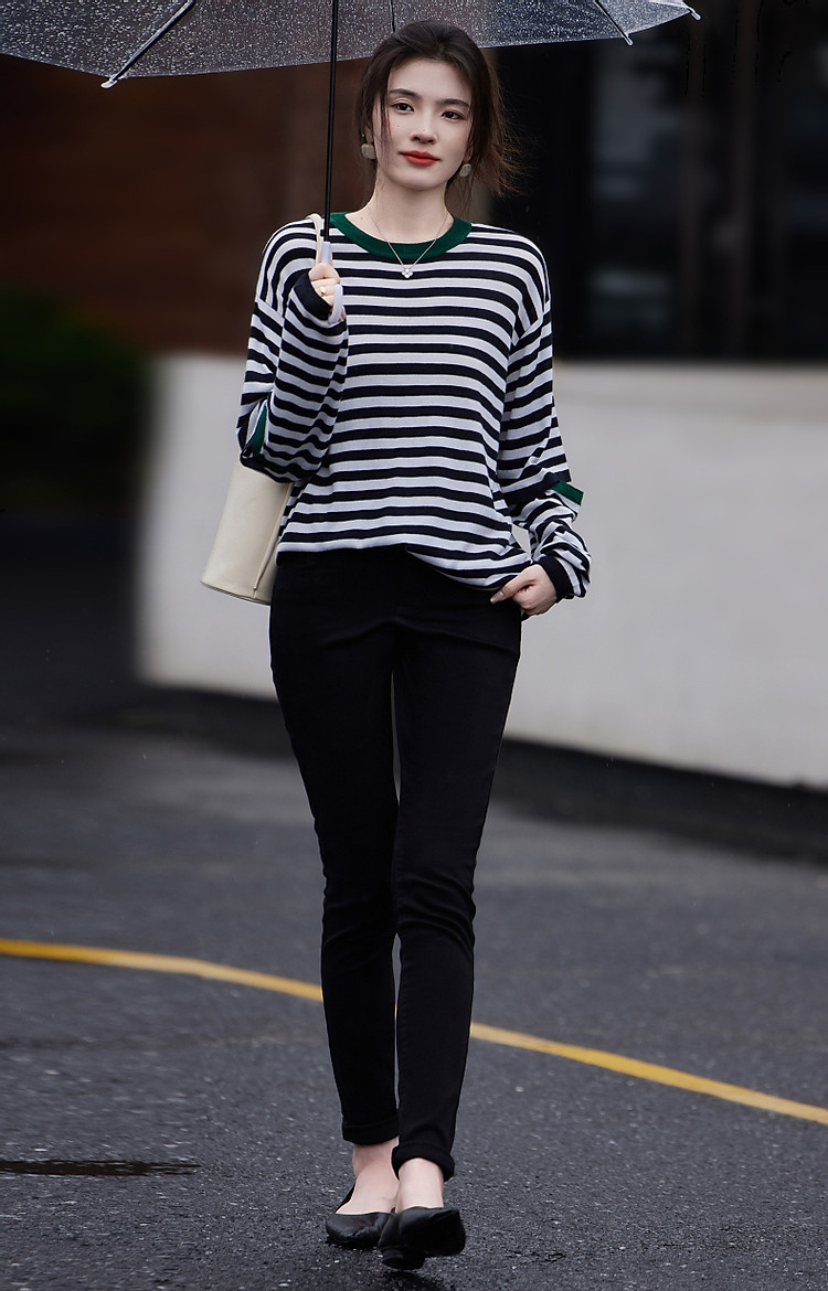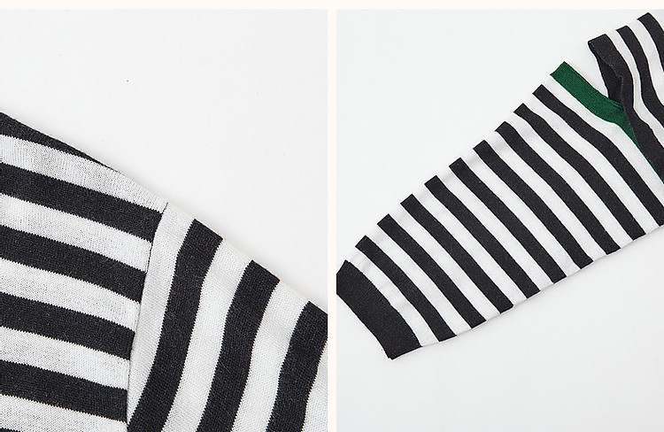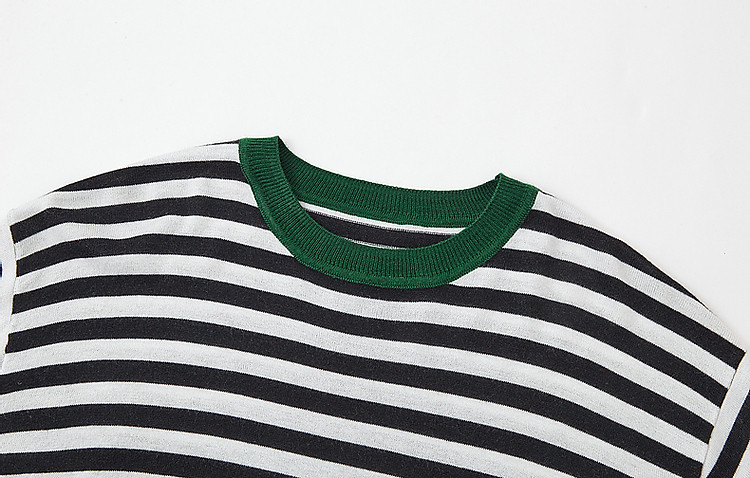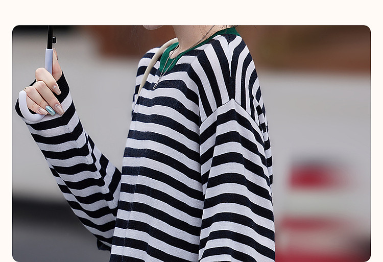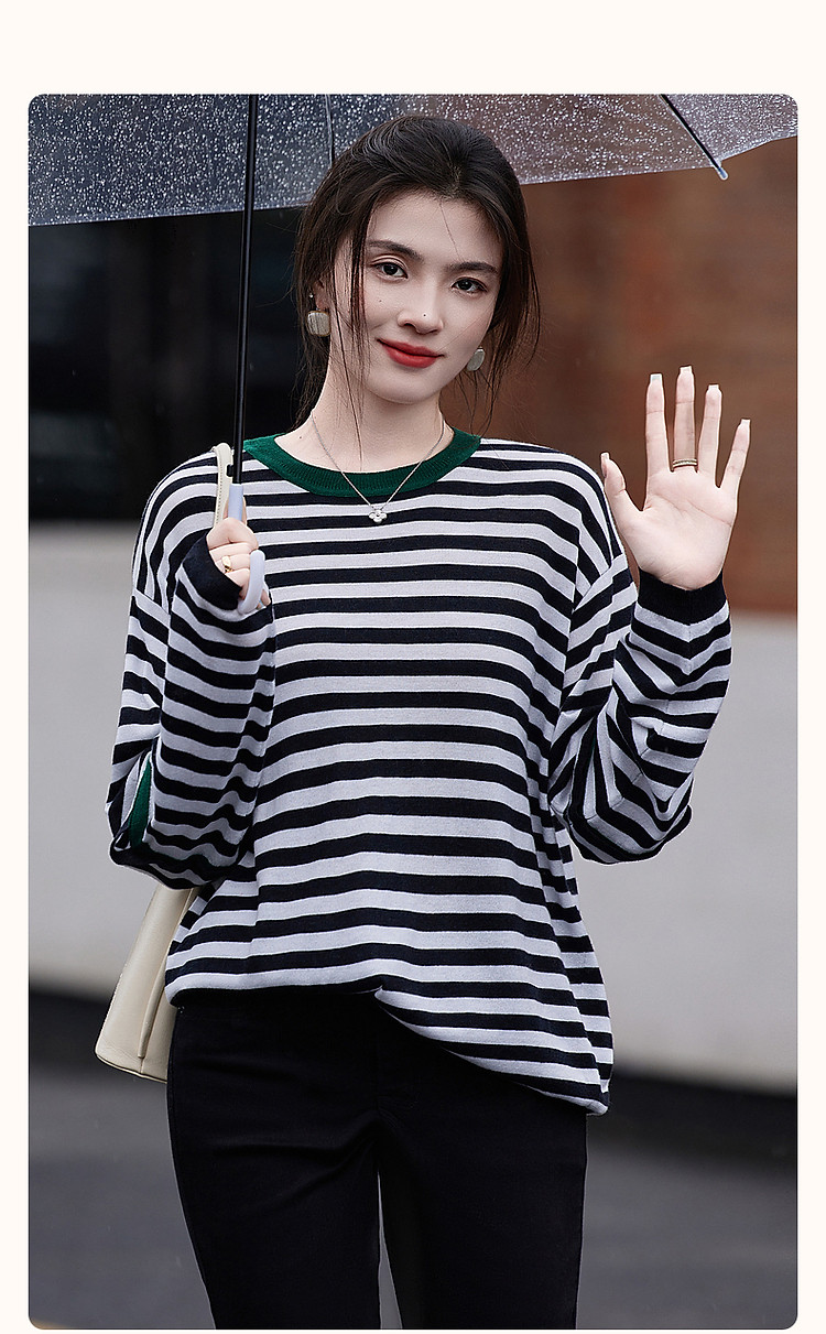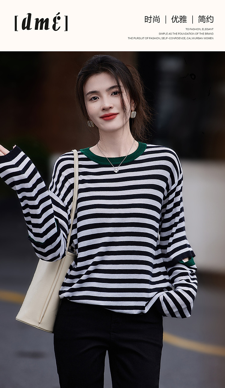 【韩风穿搭示范】春设计感袖中镂空条纹线衫撞色针织衫女上衣 396225