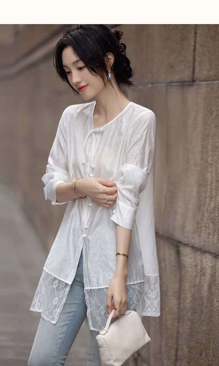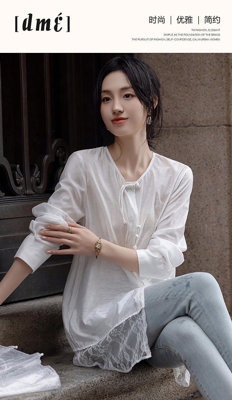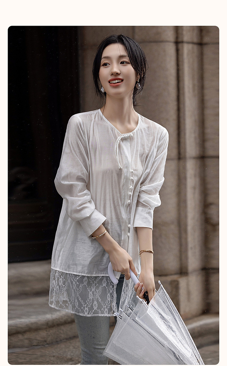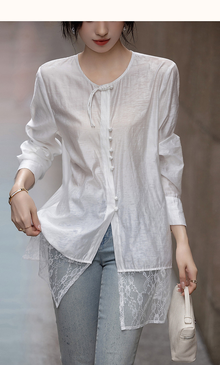 商品名称:【告白讯息】秋国风新中式小圆领盘扣衬衫拼接蕾丝衬衣女式上衣 383937