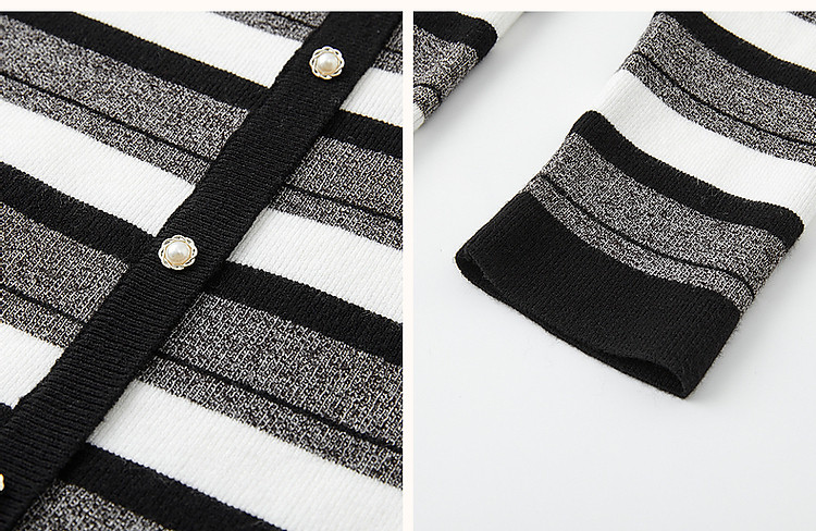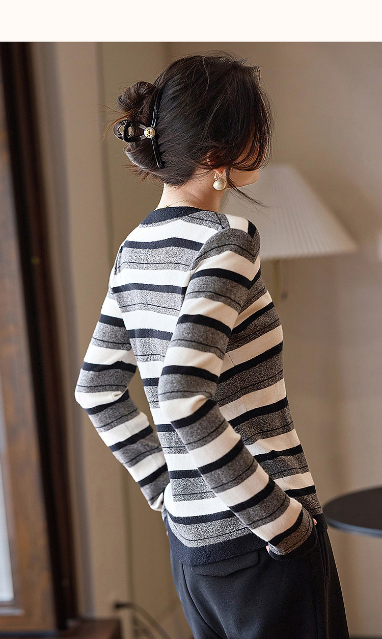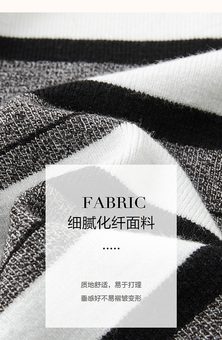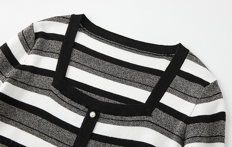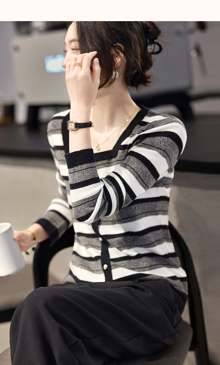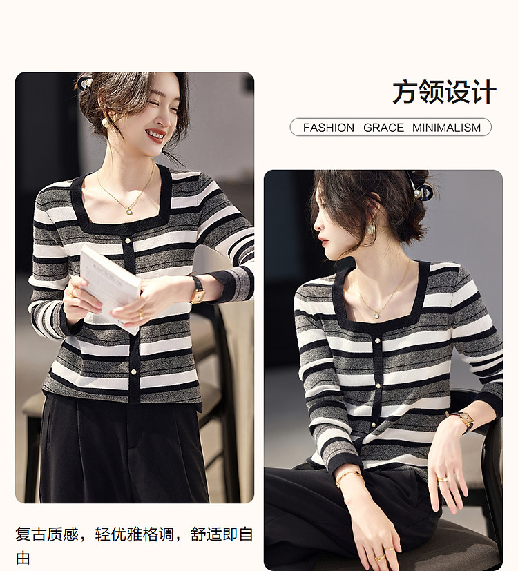 商品名称:【条纹物语】春法式简约风方领长袖线衫落肩微弹针织衫女上衣 408513