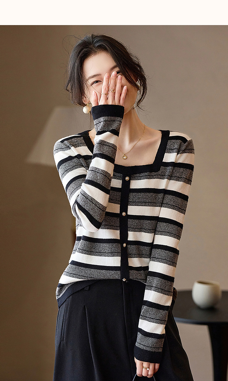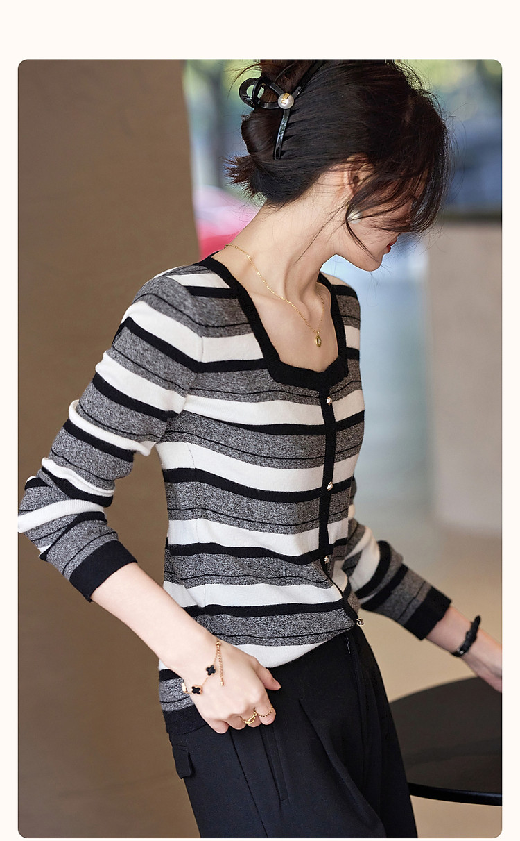 【条纹物语】春法式简约风方领长袖线衫落肩微弹针织衫女上衣 408513