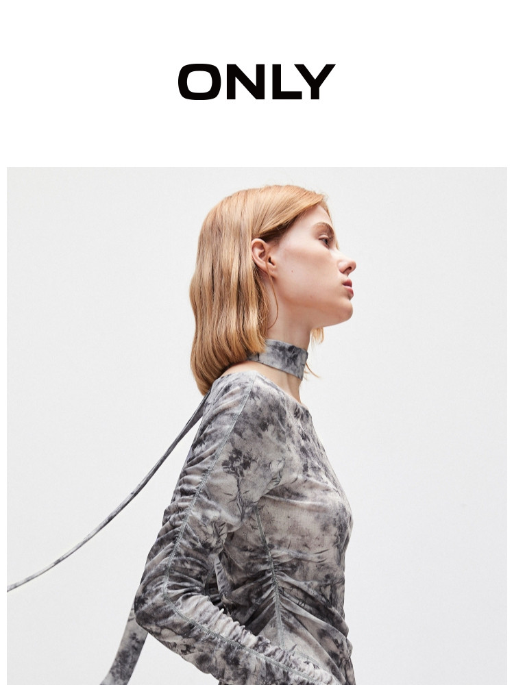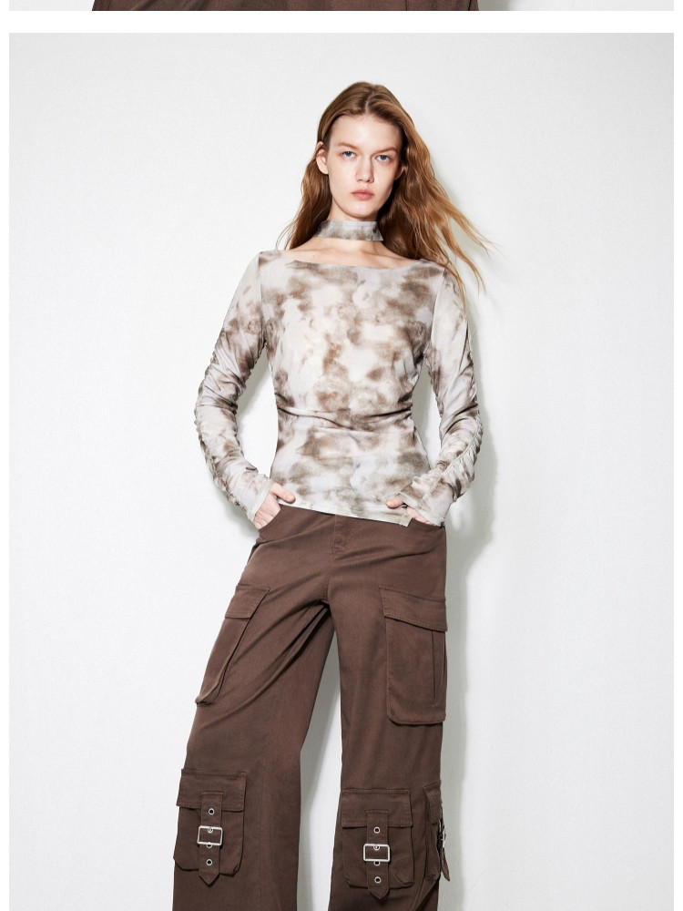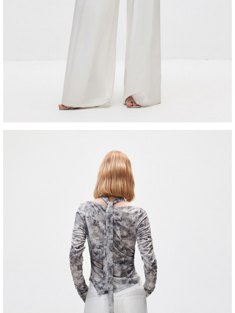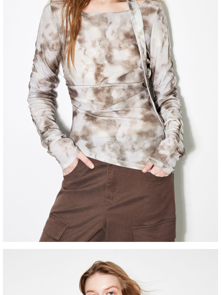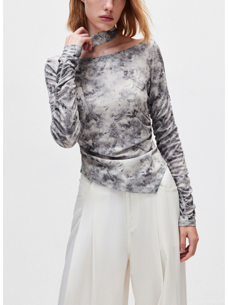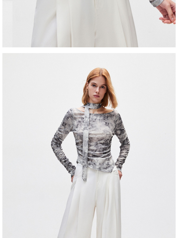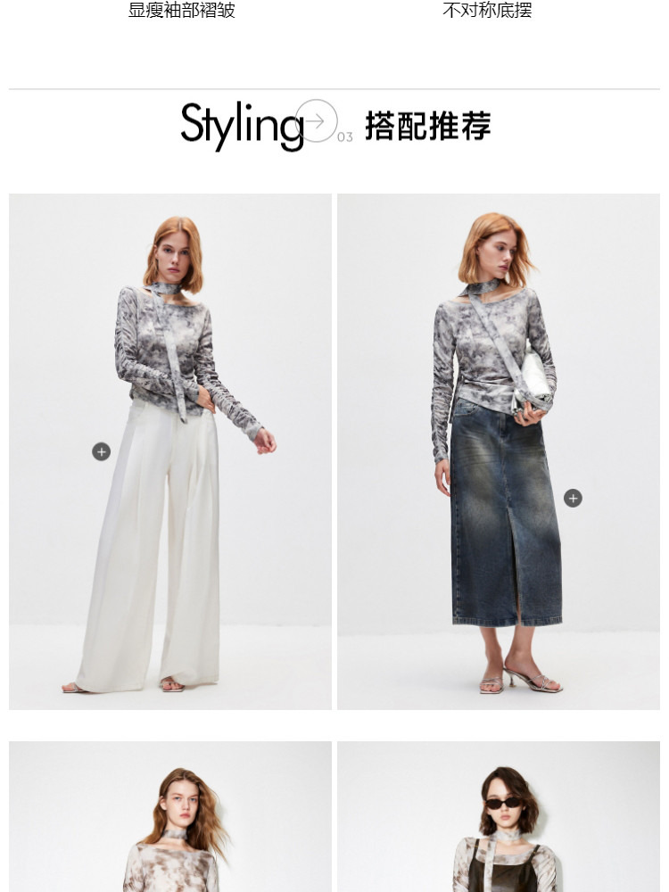 【修身短款】夏季印花飘带不对称轻薄长袖T恤女 445466