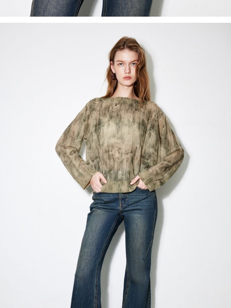 【螺纹扎染】春季复古宽松螺纹扎染一字领针织衫女 001242
