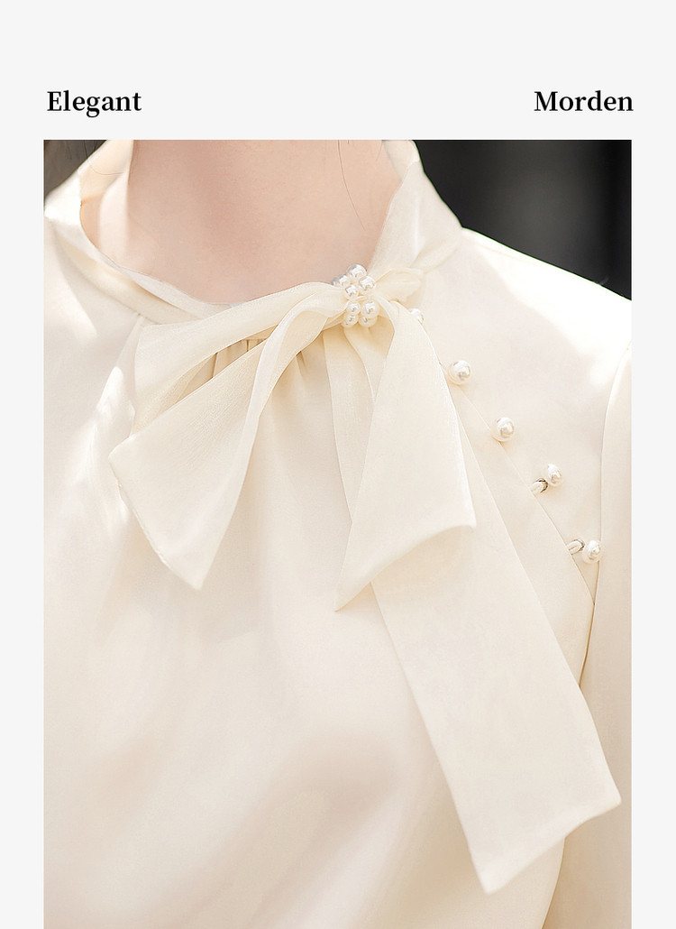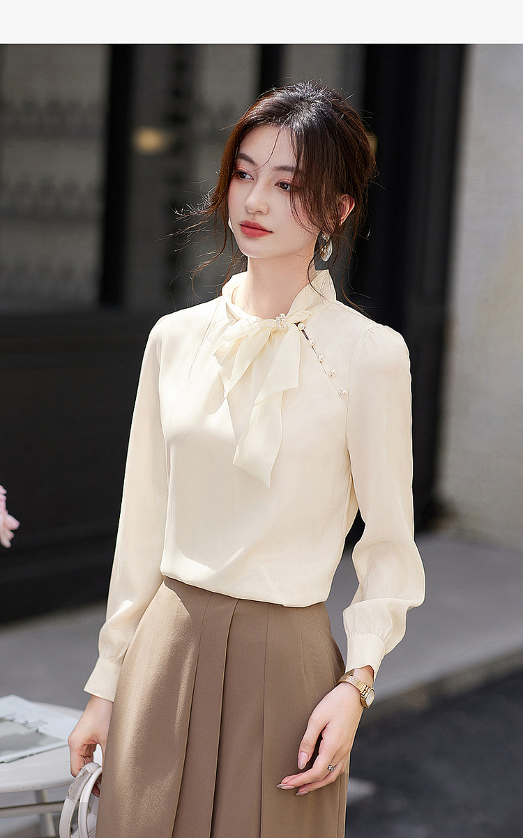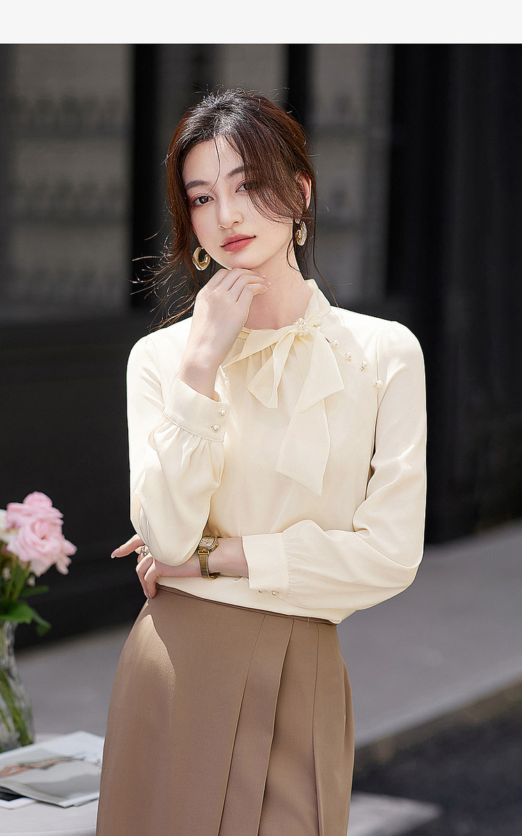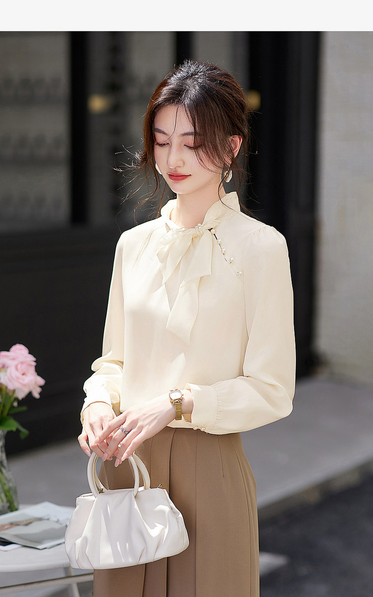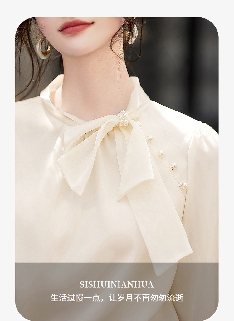 商品名称:法式高级感立领缎面长袖衬衫女春垂感气质钉珠蝴蝶结上衣 306584