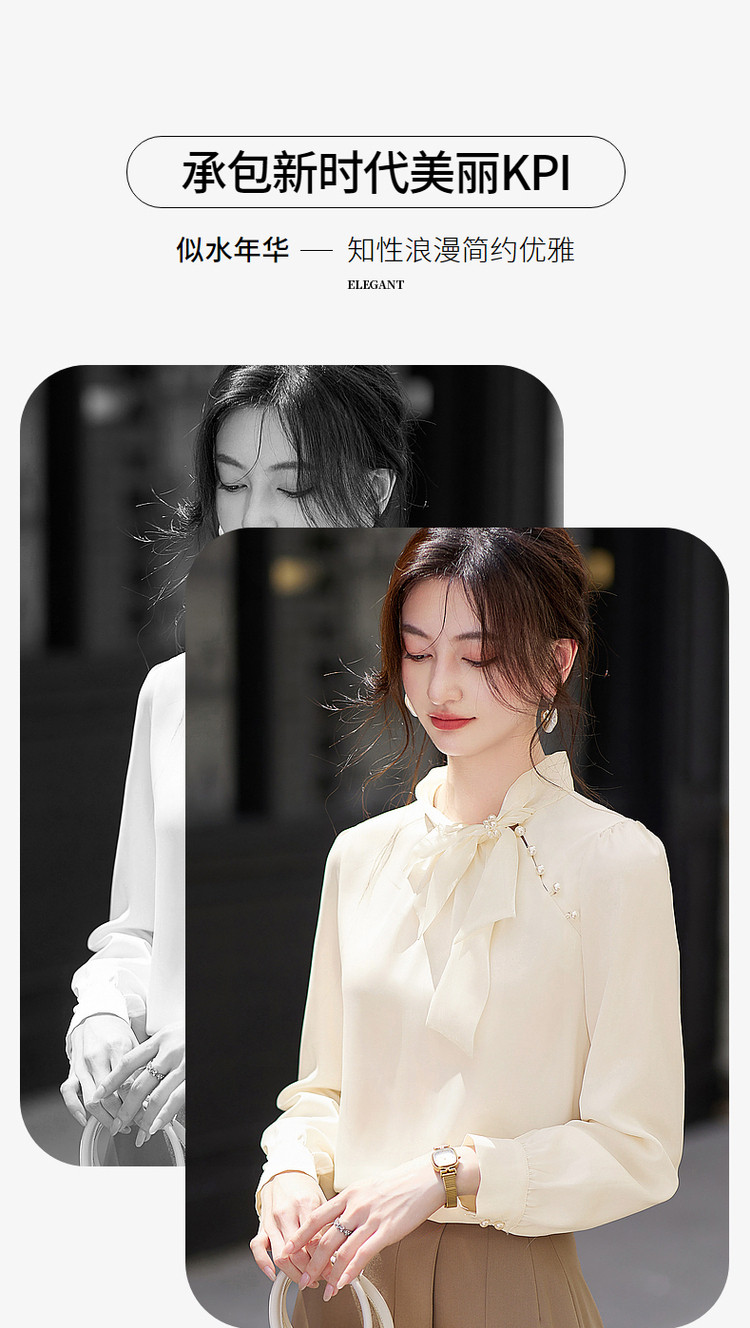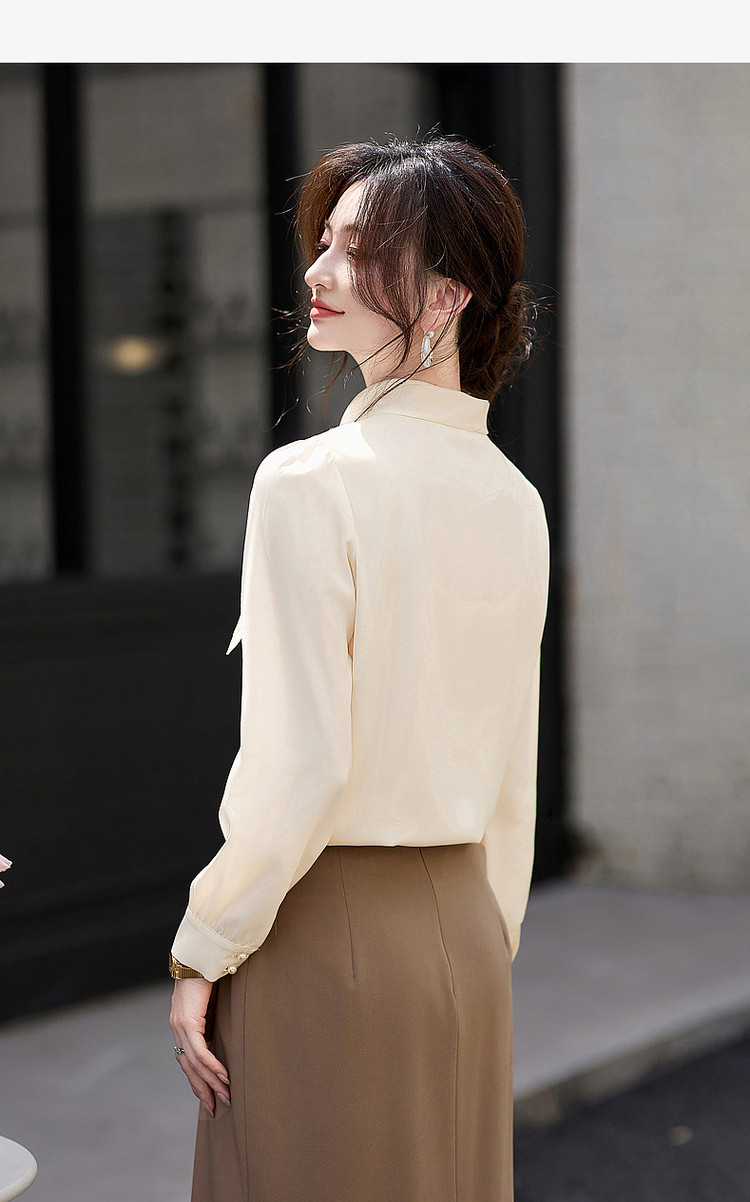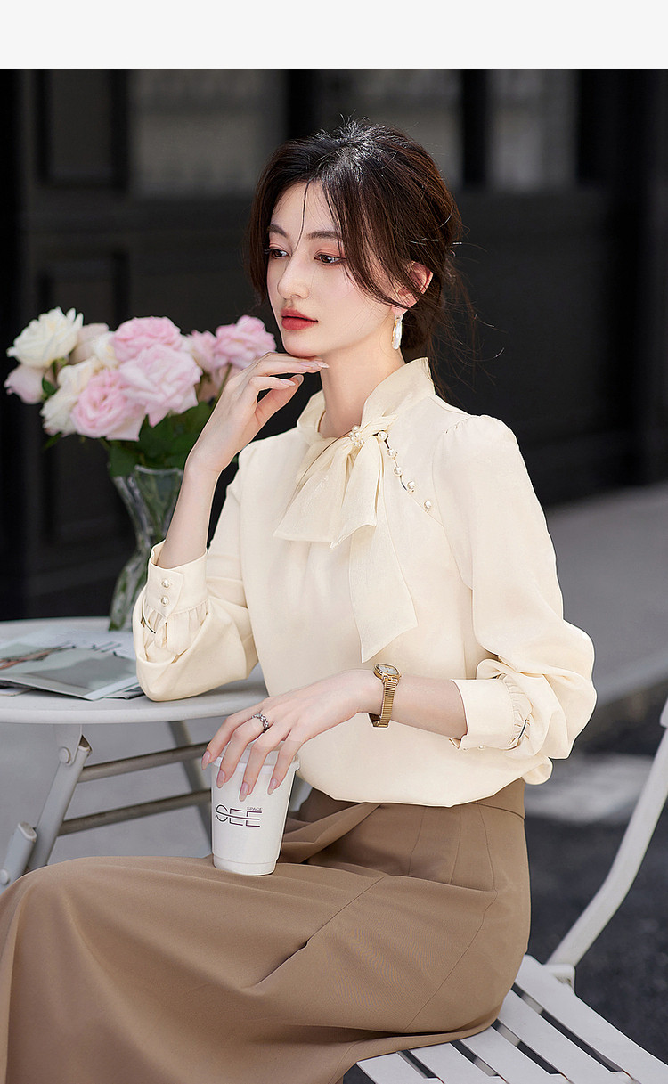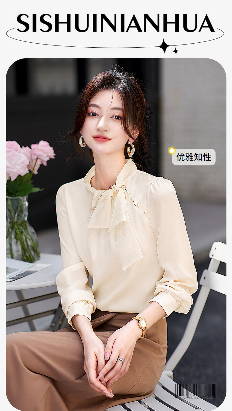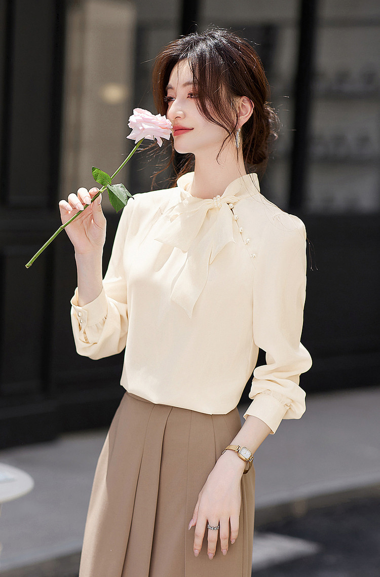 商品名称:法式高级感立领缎面长袖衬衫女春垂感气质钉珠蝴蝶结上衣 306584