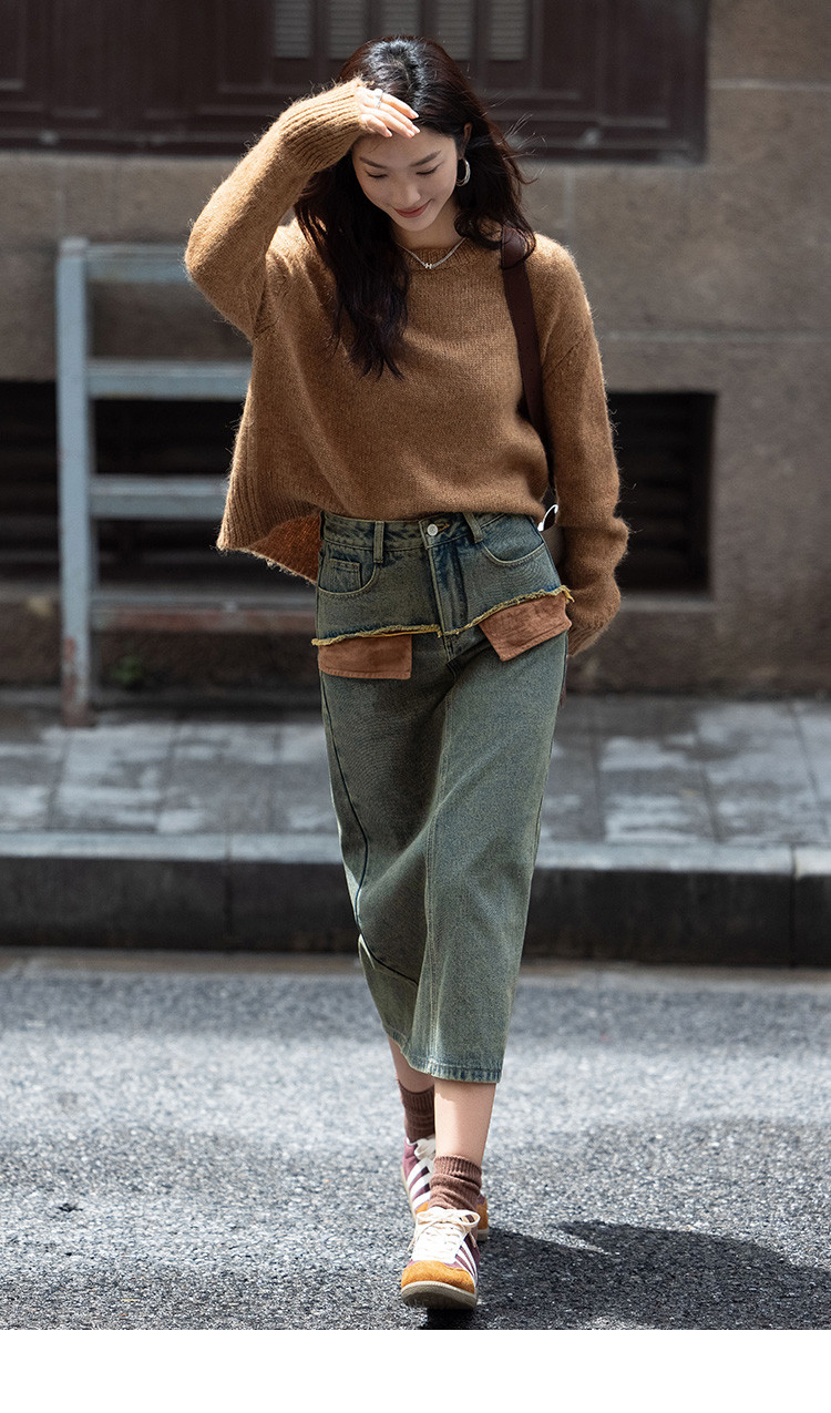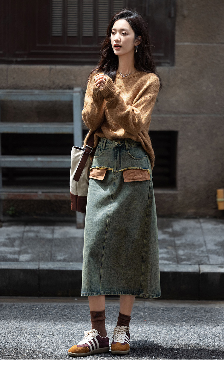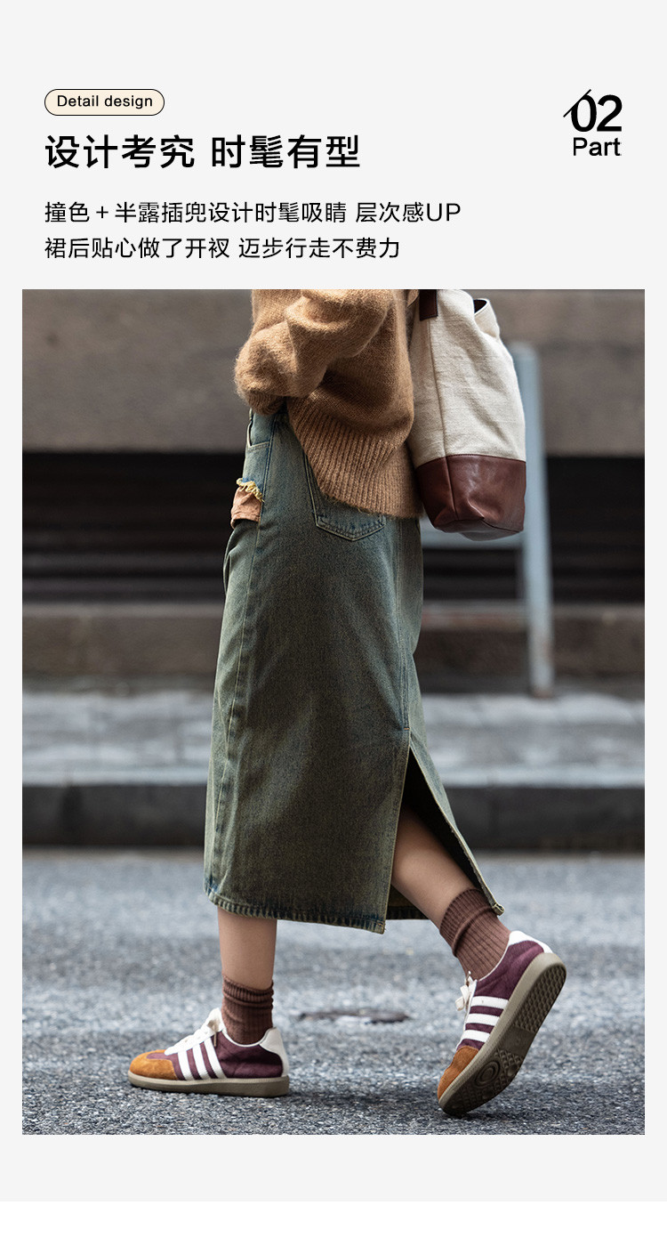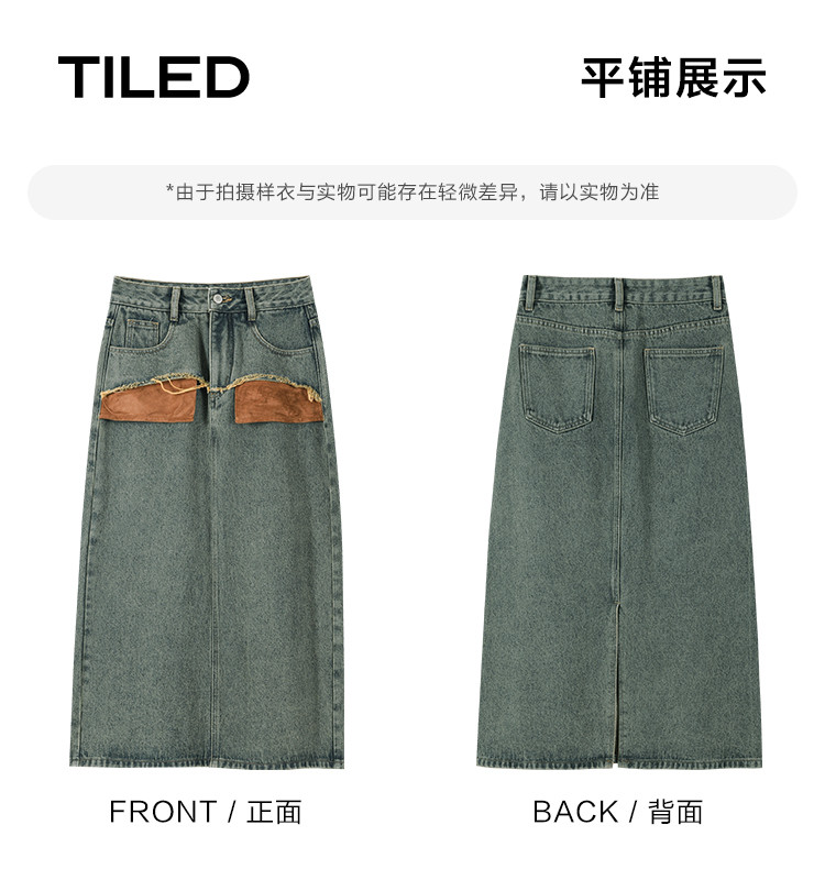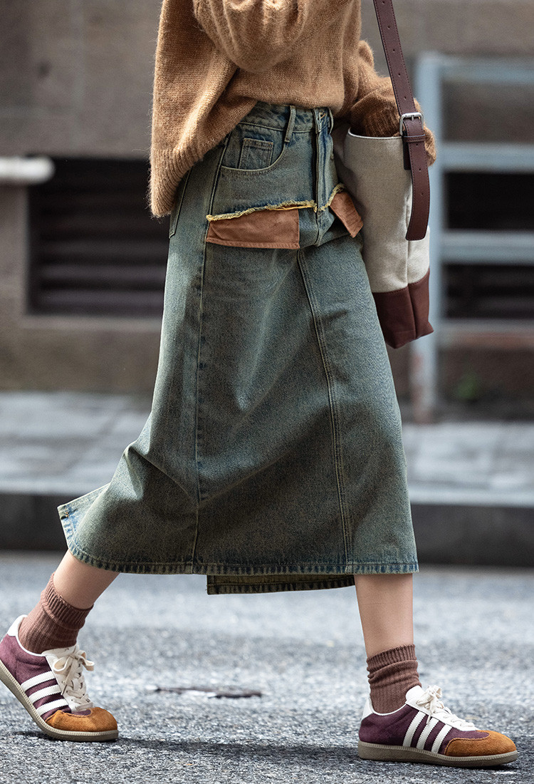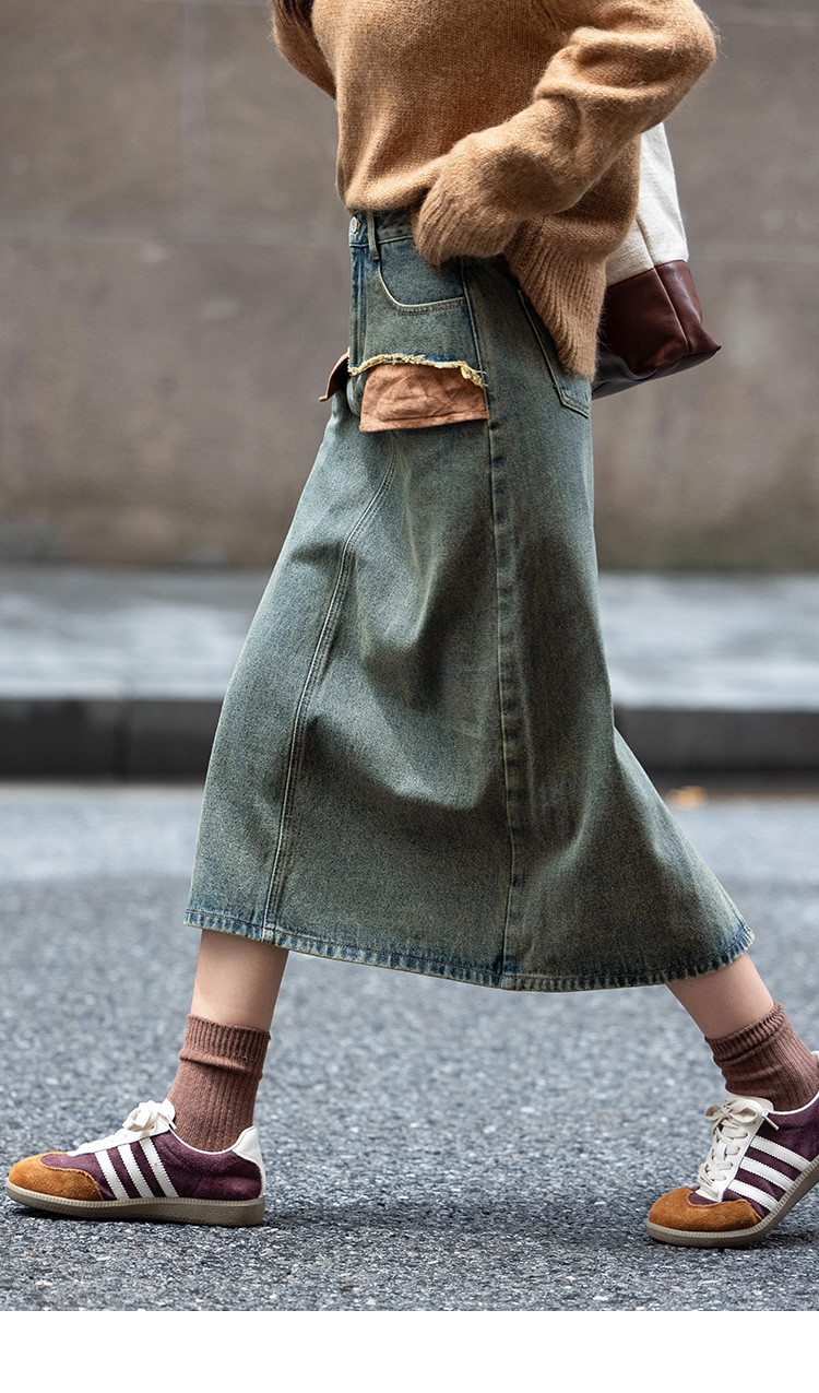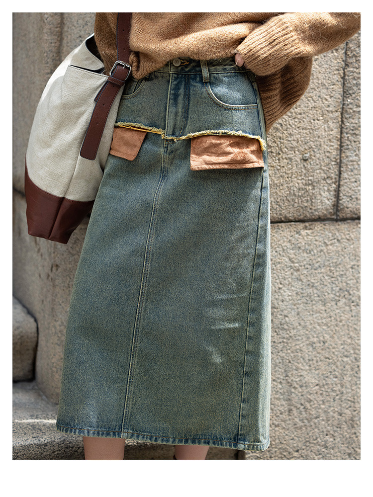 商品名称:【复古蓝水洗做旧半身裙】秋面料拼接设计中长款牛仔半裙 792322