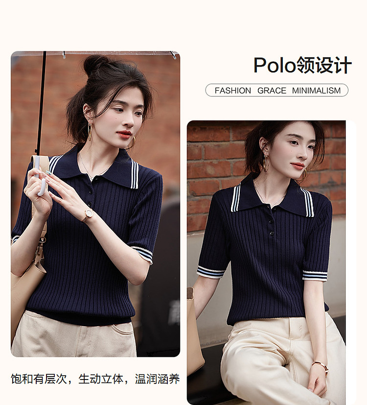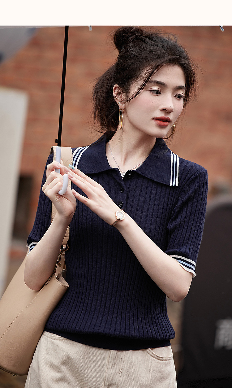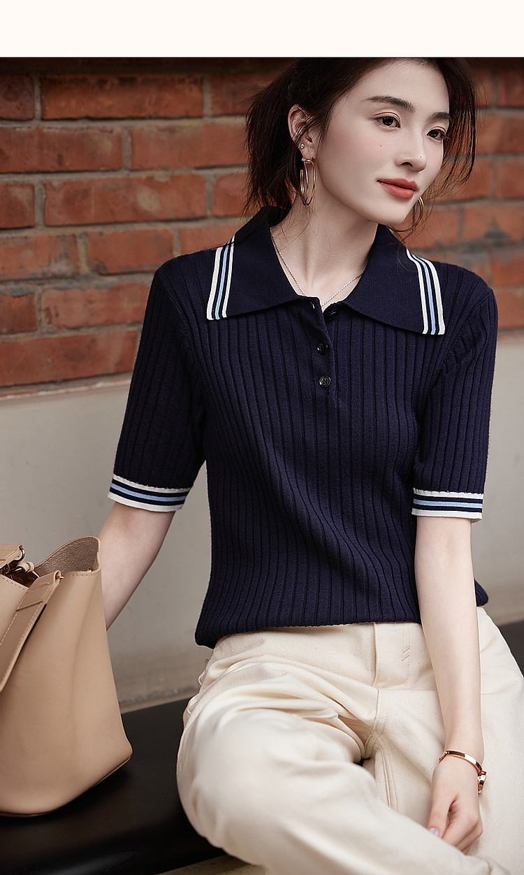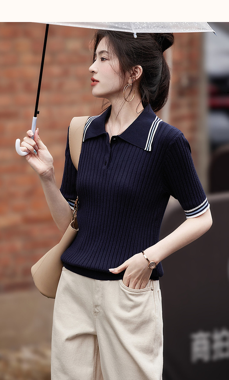【高智感通勤线衫】春撞色Polo领藏肉弹力小个子针织衫女上衣 180737