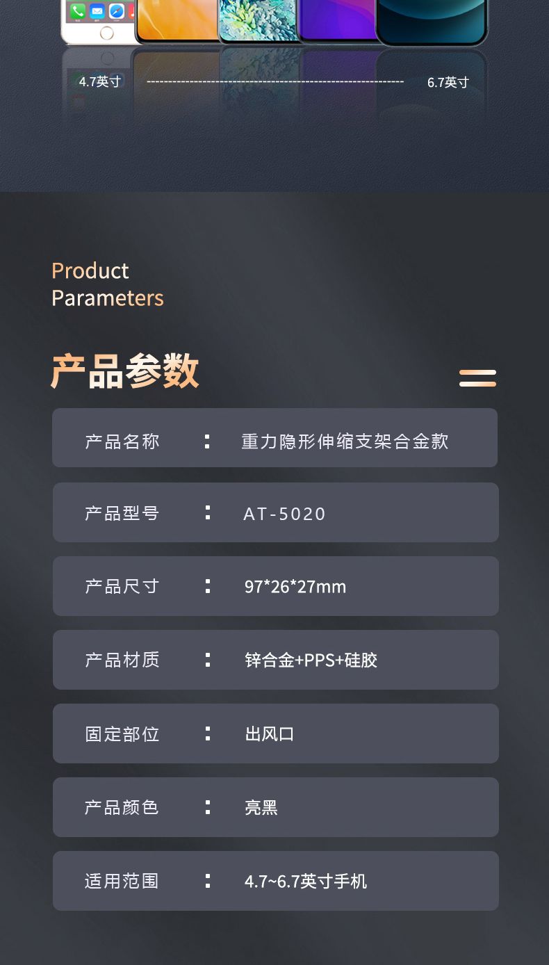 商品名称:Auto Travel美旅 重力隐形伸缩支架合金款AT-5020