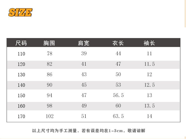 尺码 衣长(cm) 肩宽(cm) 身高(cm) 袖长(cm) 适合年龄 胸围(cm) 号型