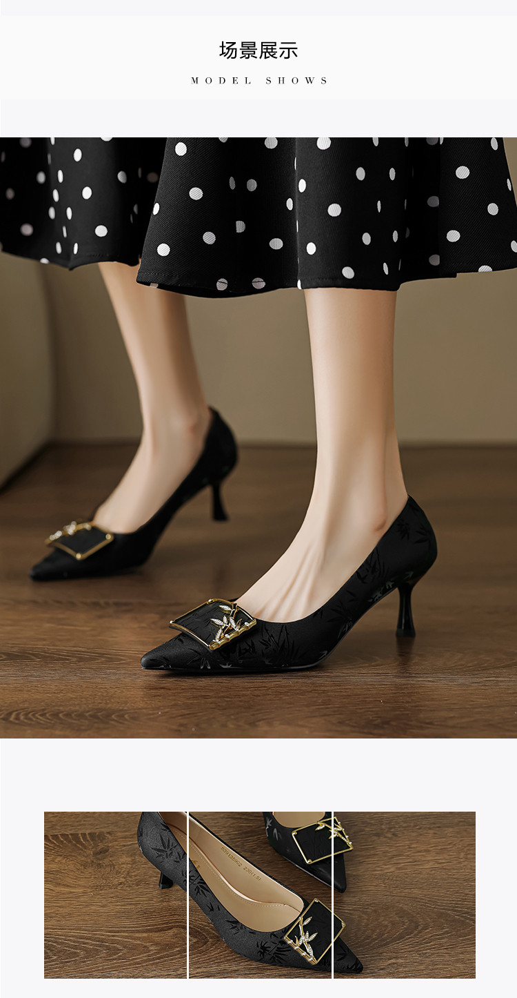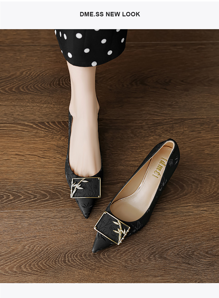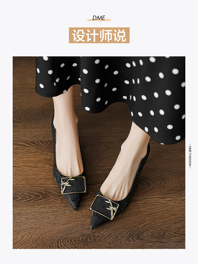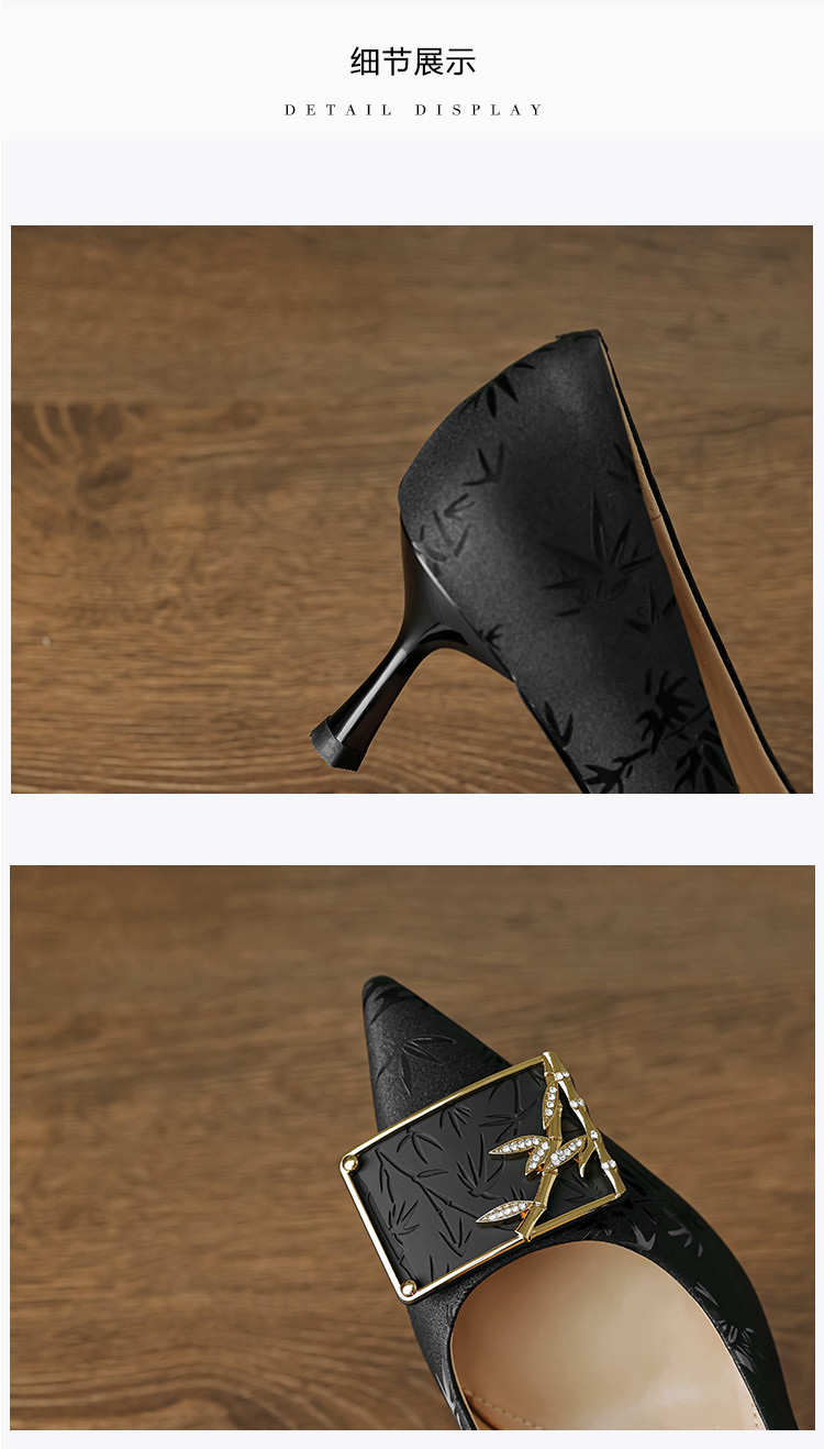 商品名称:时尚简约国风水墨竹叶方扣尖头细跟女单鞋 353985