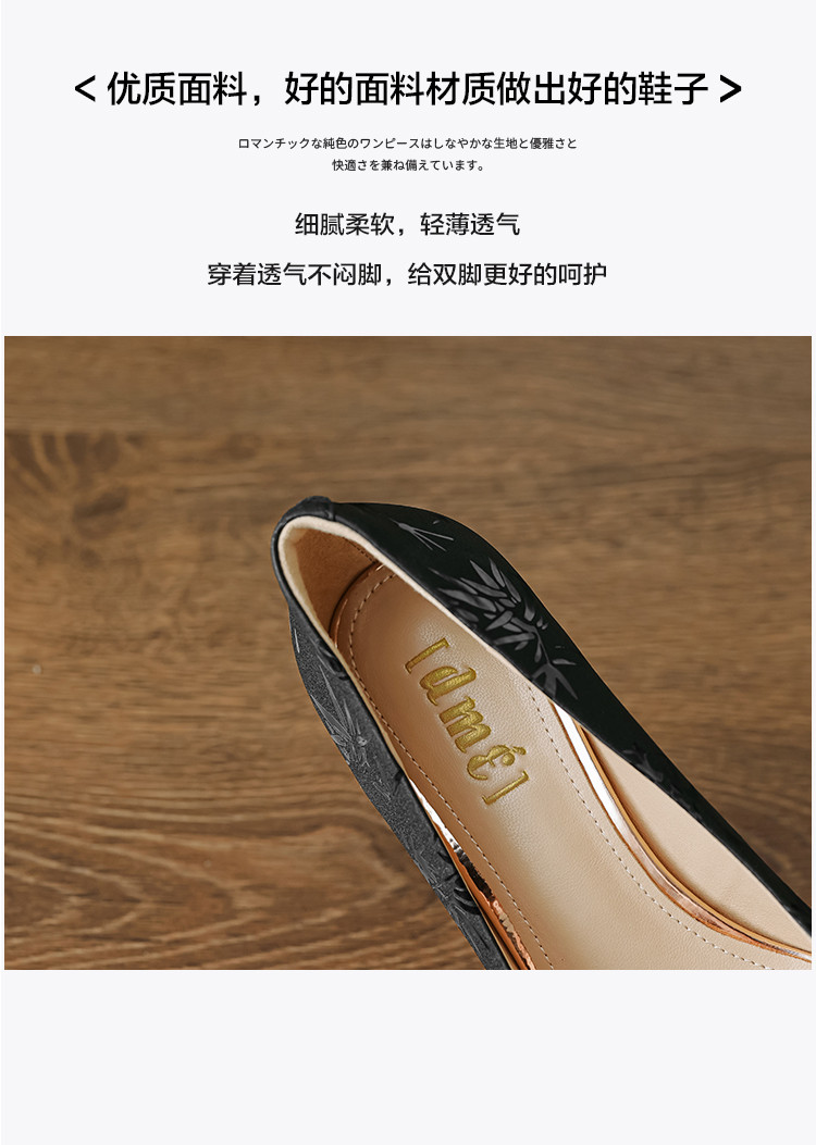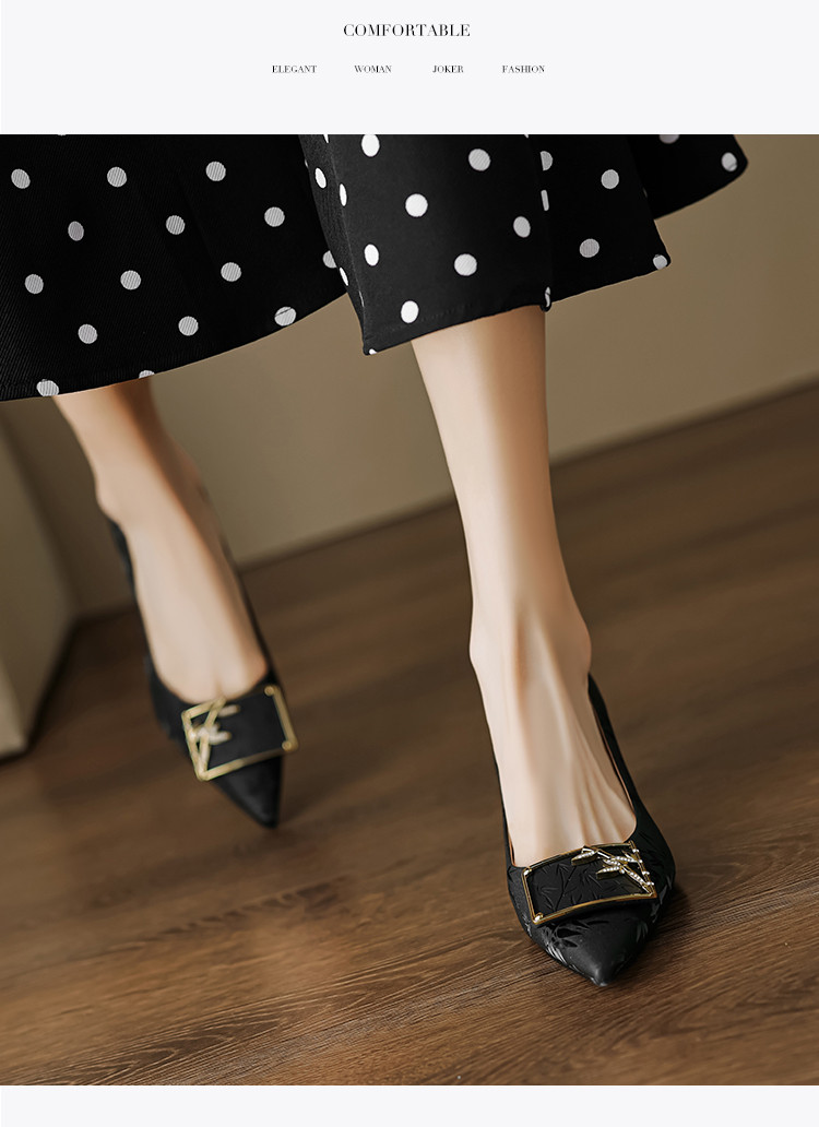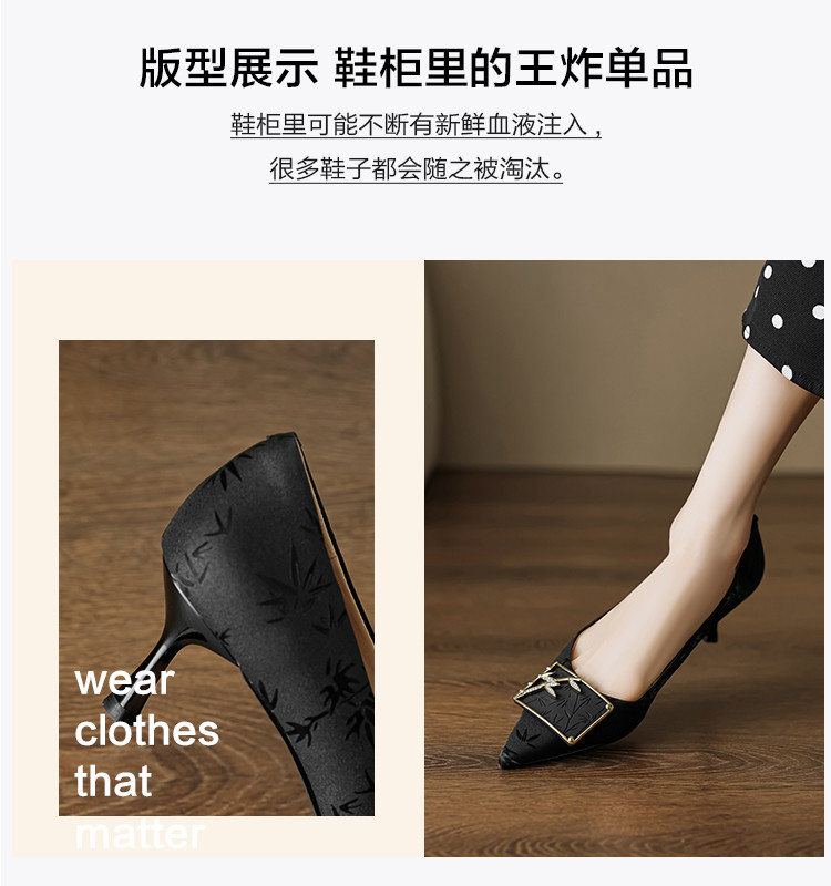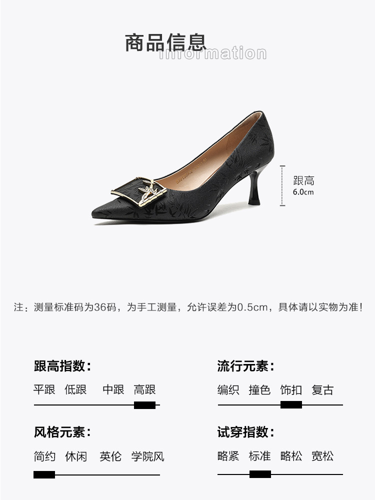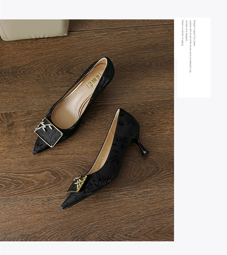 商品名称:时尚简约国风水墨竹叶方扣尖头细跟女单鞋 353985