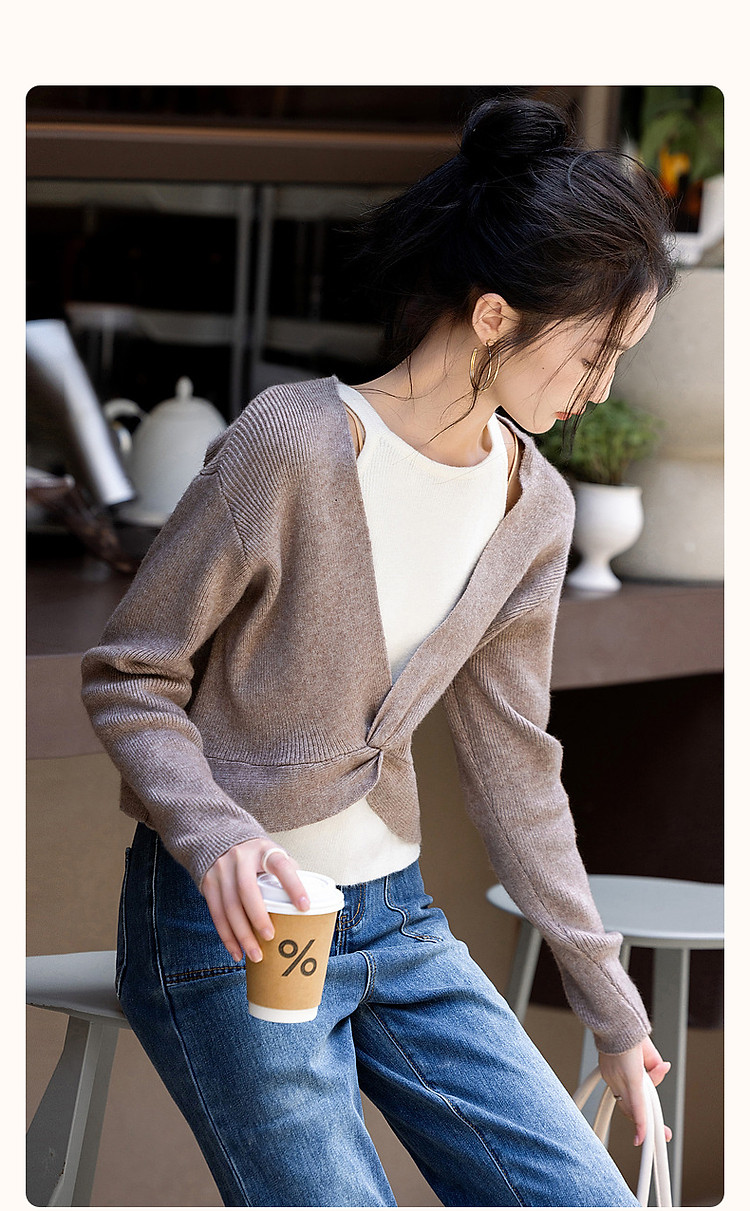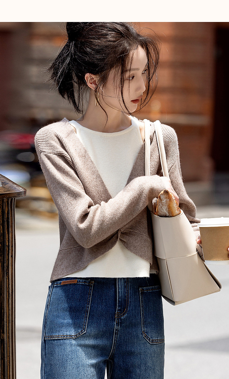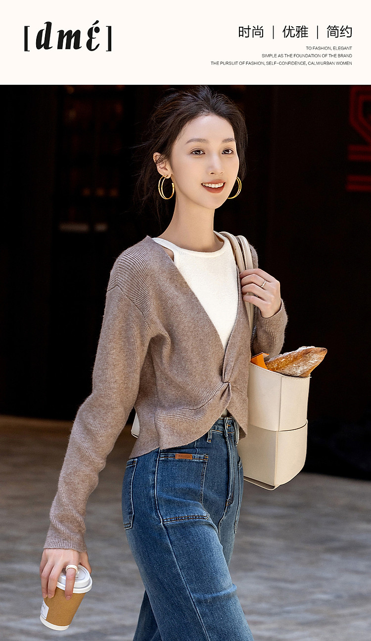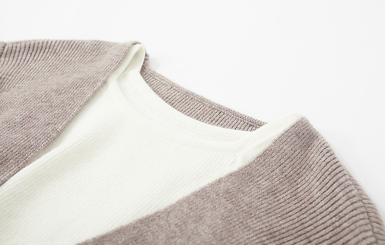 商品名称:【落日玫瑰】春优雅风露肩假两件撞色线衫设计感扭结针织衫女上衣 106753