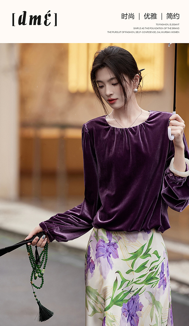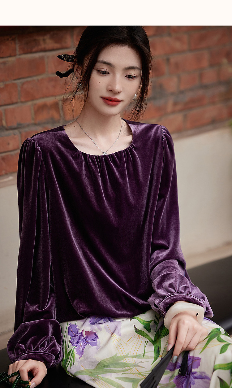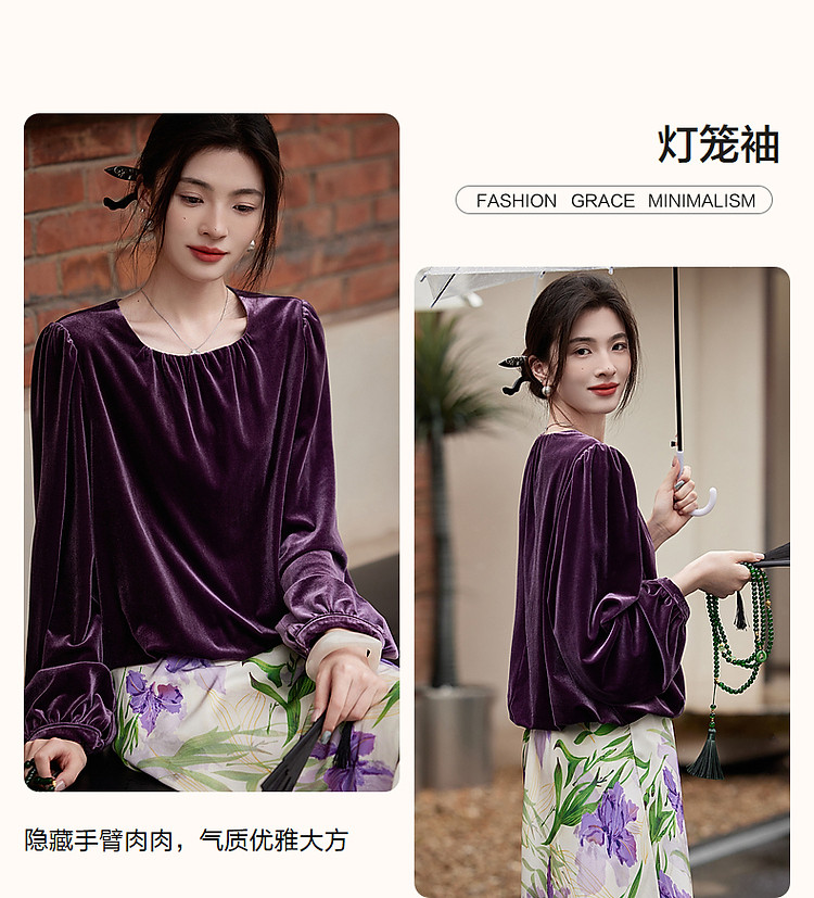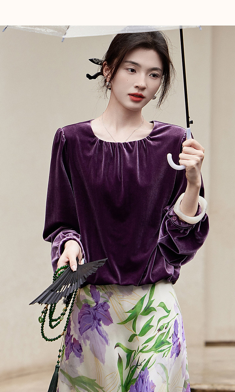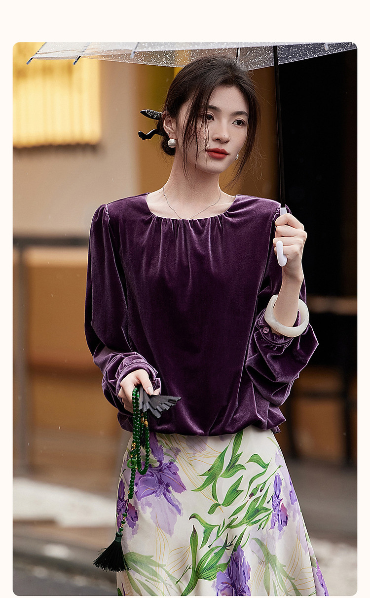 【一如初见】春复古灯笼袖衬衫兜量下摆弹力平绒丝绒衬衣女装上衣 139841