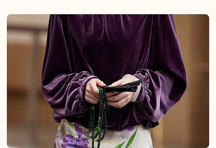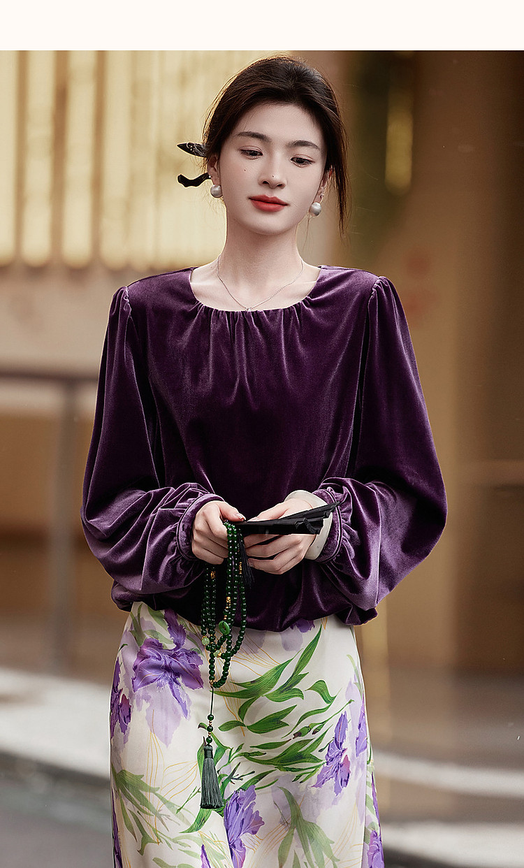 商品名称:【一如初见】春复古灯笼袖衬衫兜量下摆弹力平绒丝绒衬衣女装上衣 139841