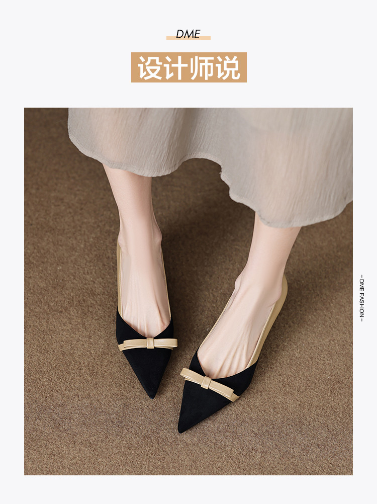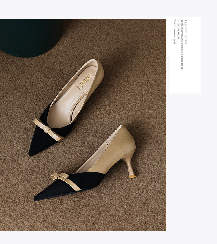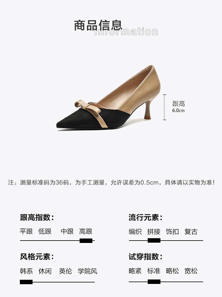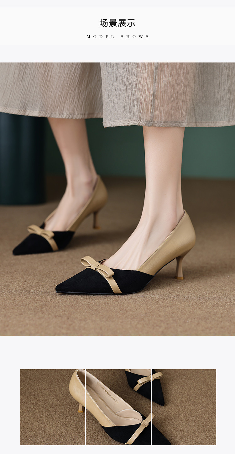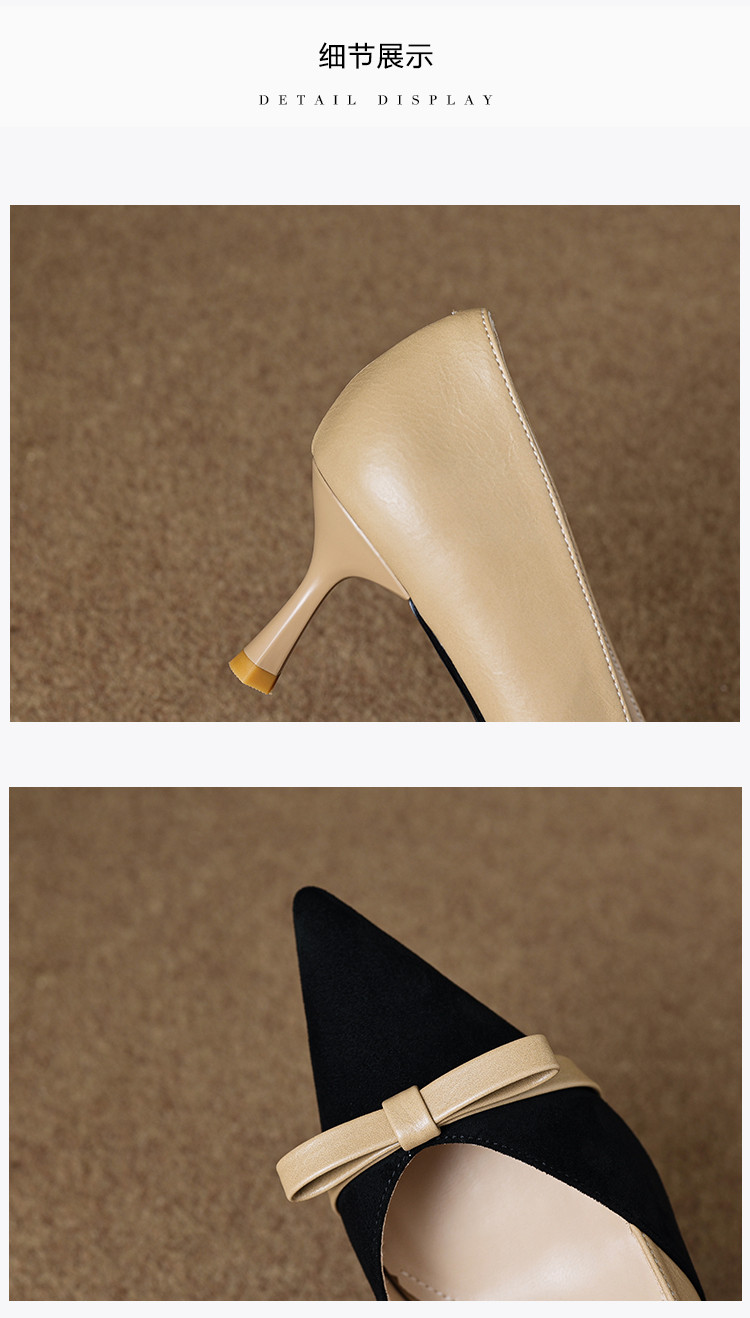 商品名称:2024年秋季简约百搭高级感气质女人绒面拼接精致蝴蝶结细跟女 176257