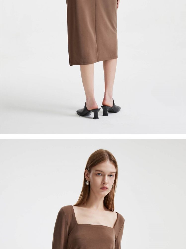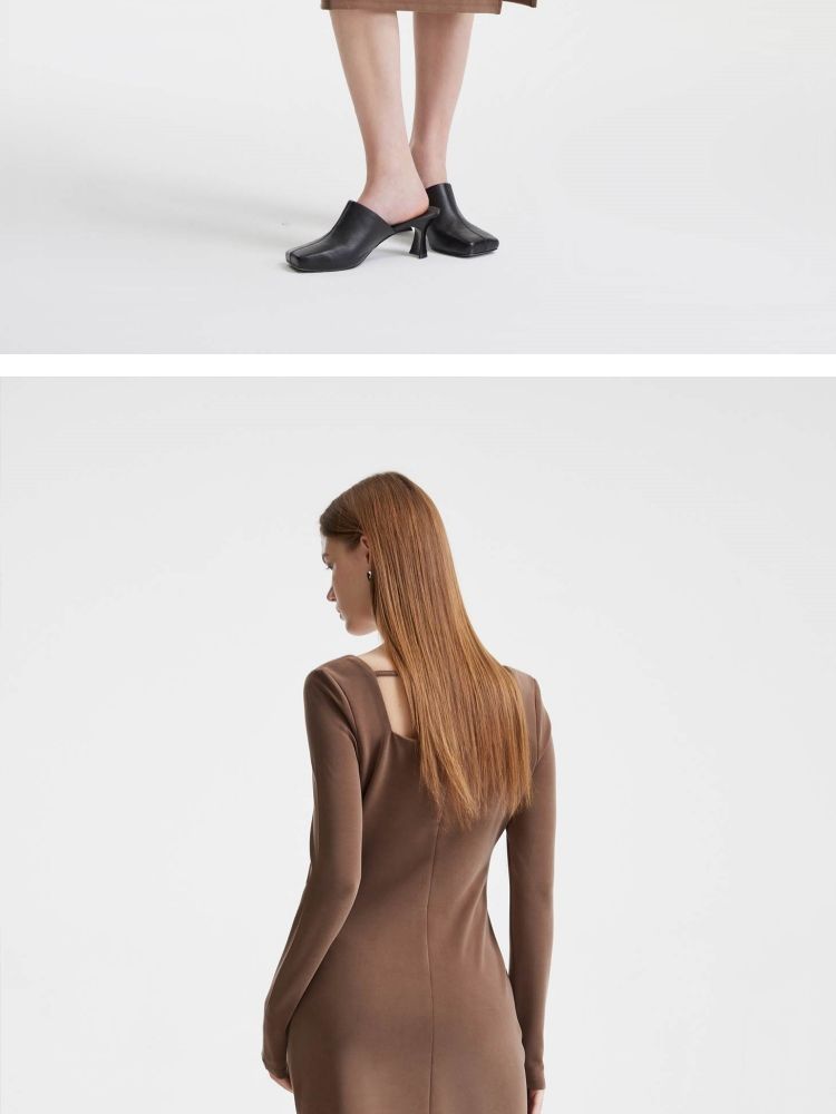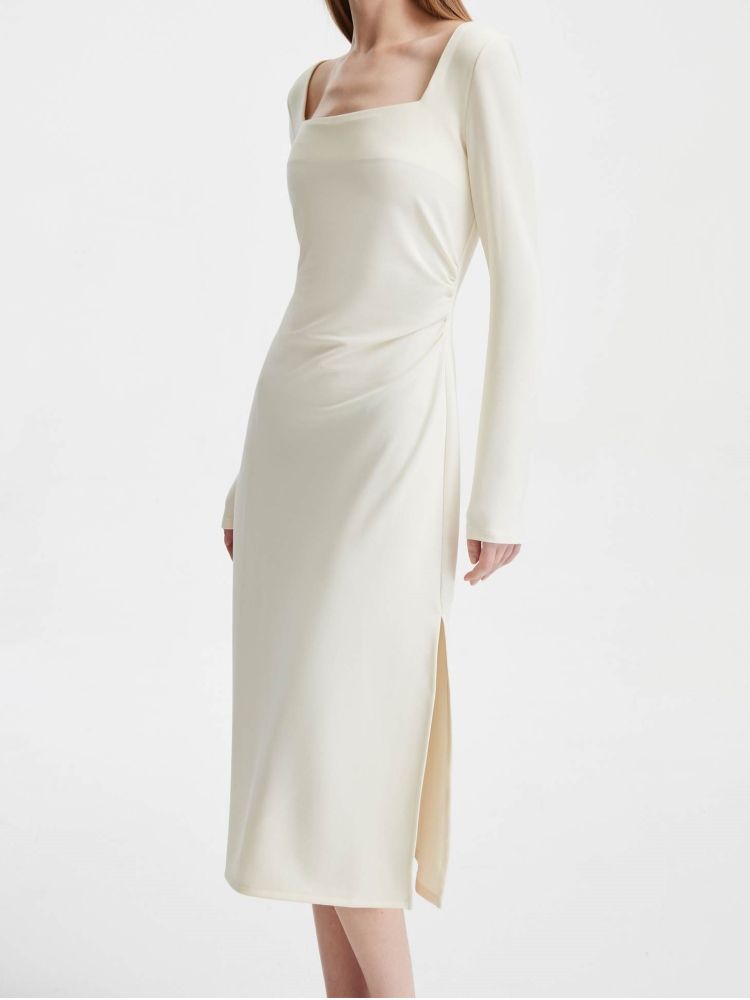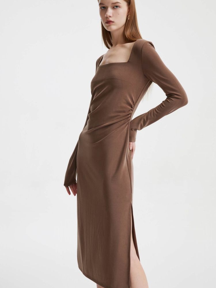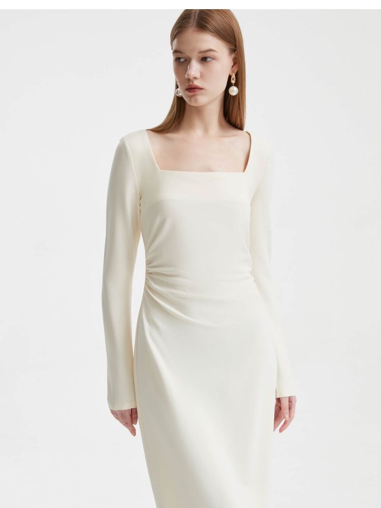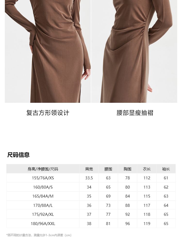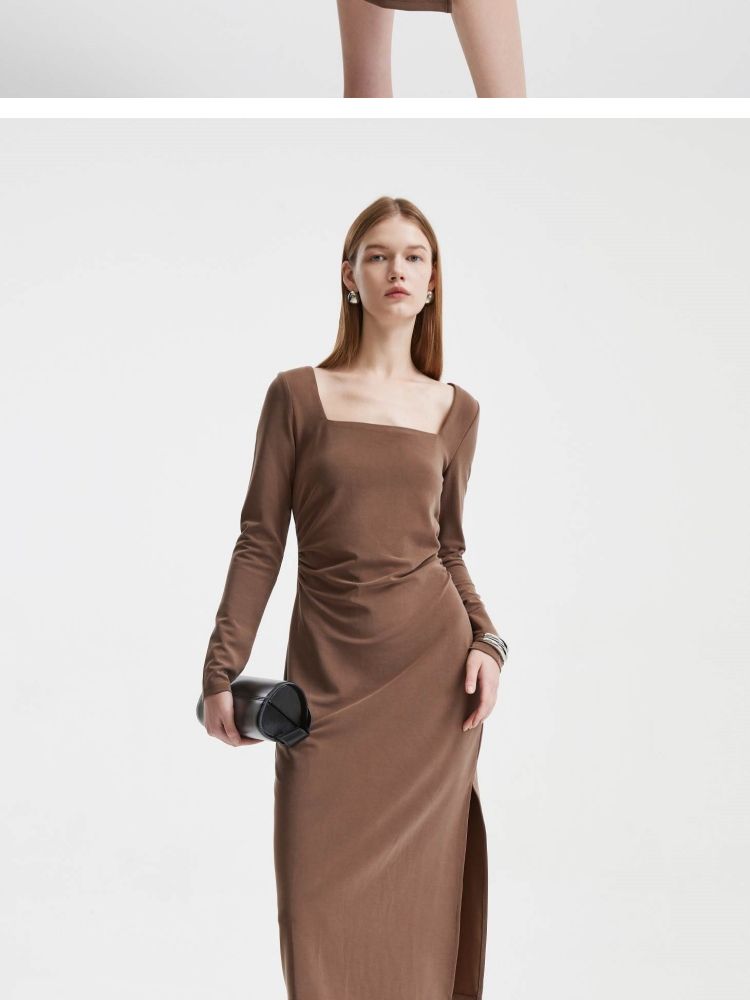 【腰部显瘦抽褶】夏季简约复古方领垂感开衩长裙连衣裙女 606426