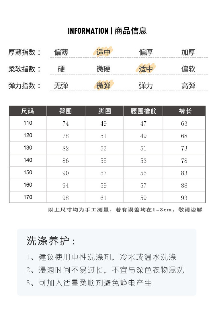 | 尺码 | 身高(cm) | 腰围(cm) | 裤长(cm) | 臀围(cm) | 适合年龄 | 号型 |