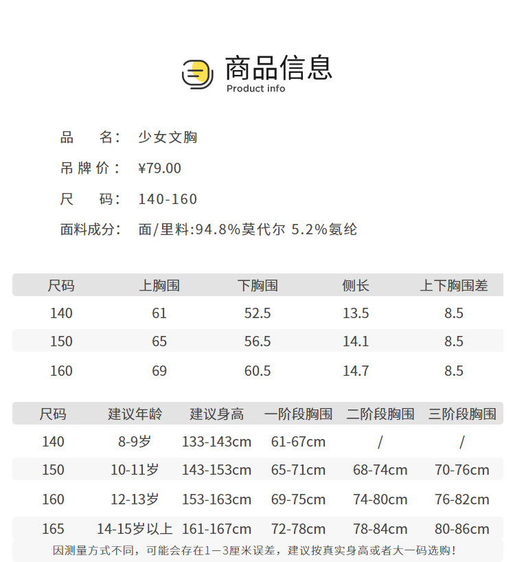 商品名称:女童内衣莫代尔小背心一阶段发育期儿童胸衣防走光凸点少女文胸 150597