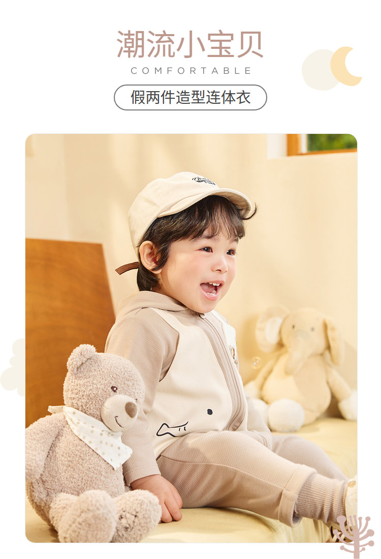 商品名称:拼接假两件连帽婴儿外出连体衣宝宝男童女童春秋装新生儿哈衣爬服 361029