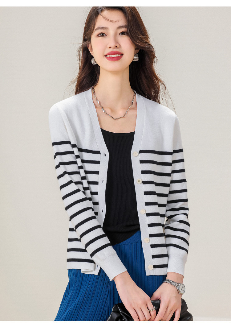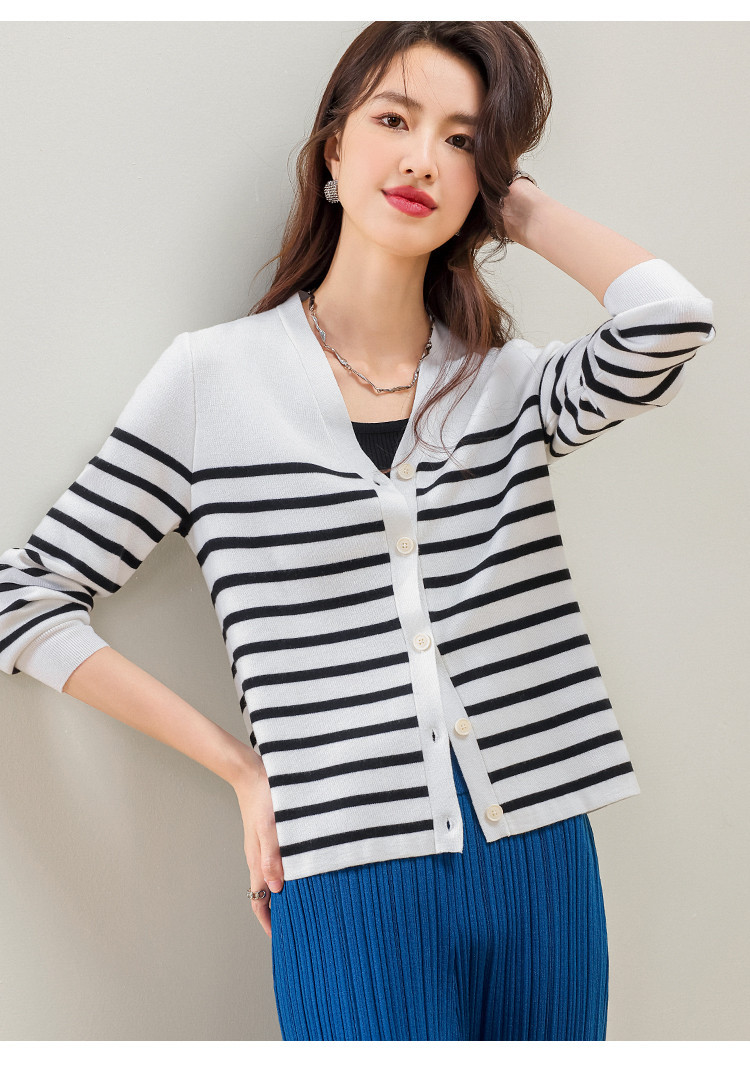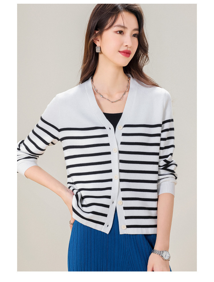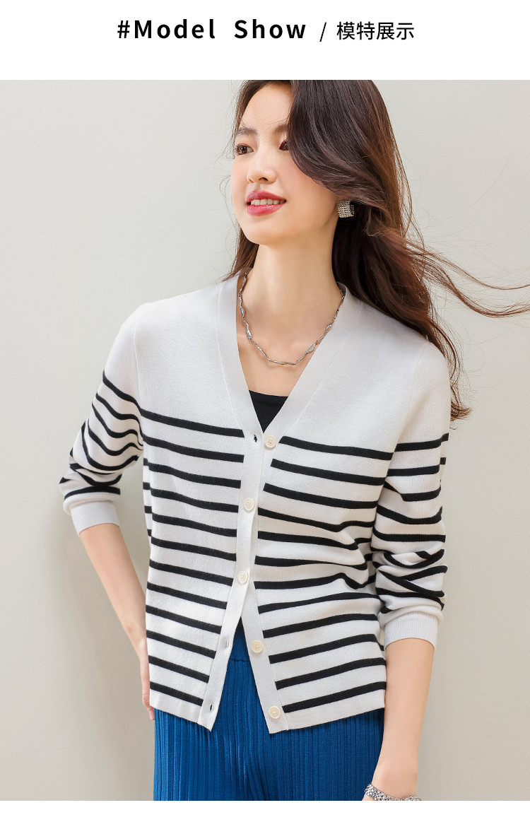 V领含羊毛针织打底开衫女条纹女式毛衣外套 720147