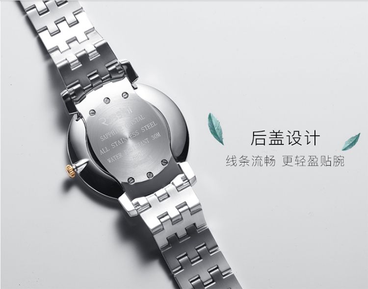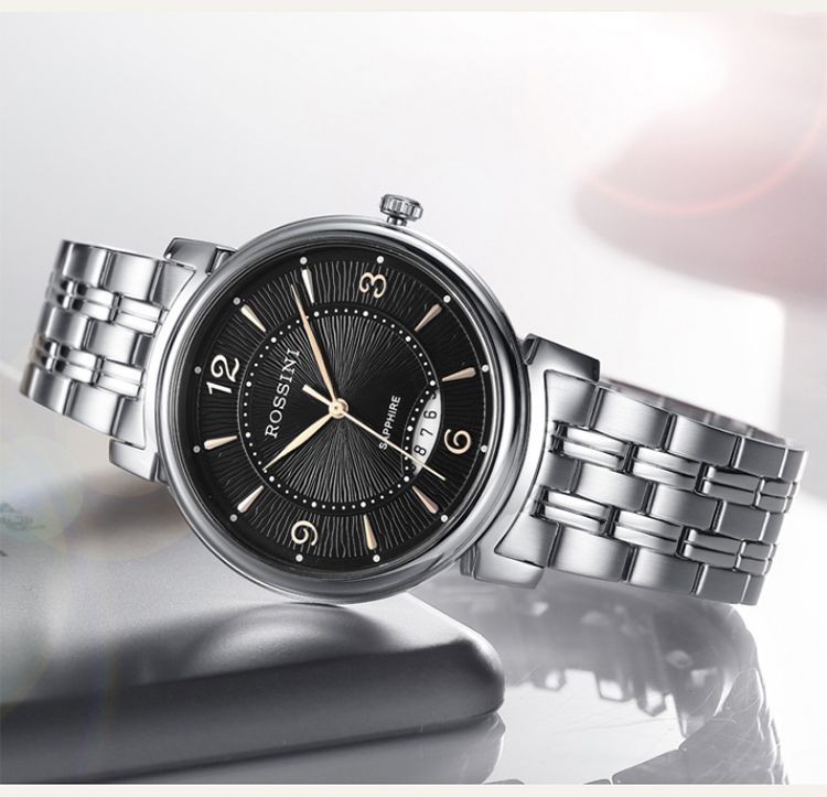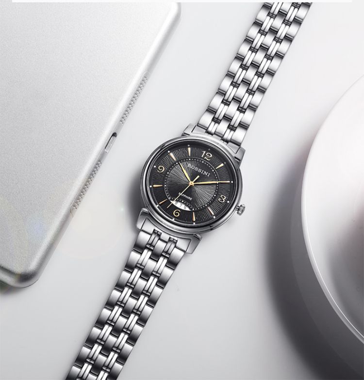 关注举报 罗西尼(ROSSINI)手表 石英表男表商务时尚休闲防水日历男士女士腕表情侣表 黑盘钢带石英女表5804W04