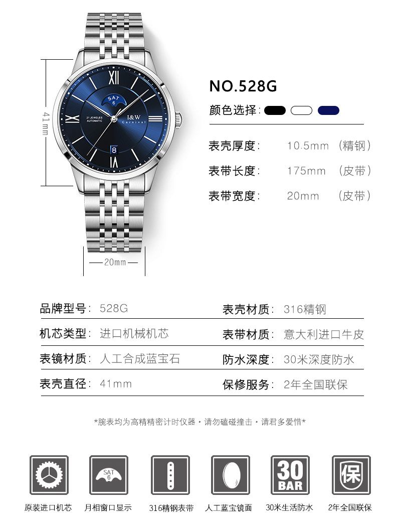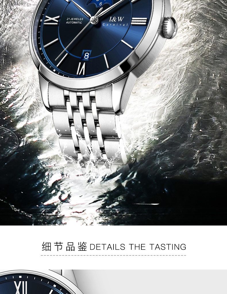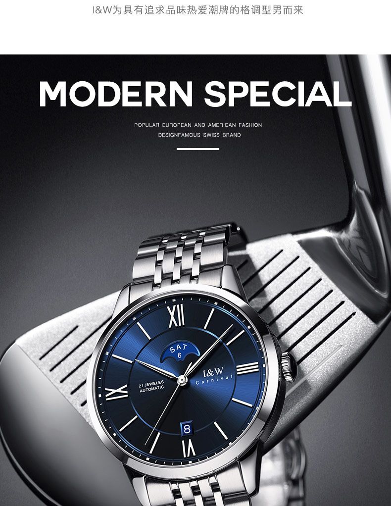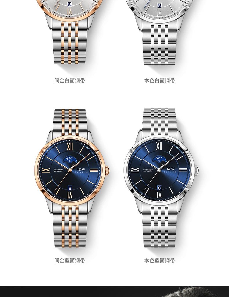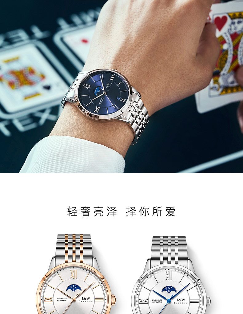 商品名称:I&W品牌手表男机械表休闲时尚钢带男表间金防水机械表男士528G