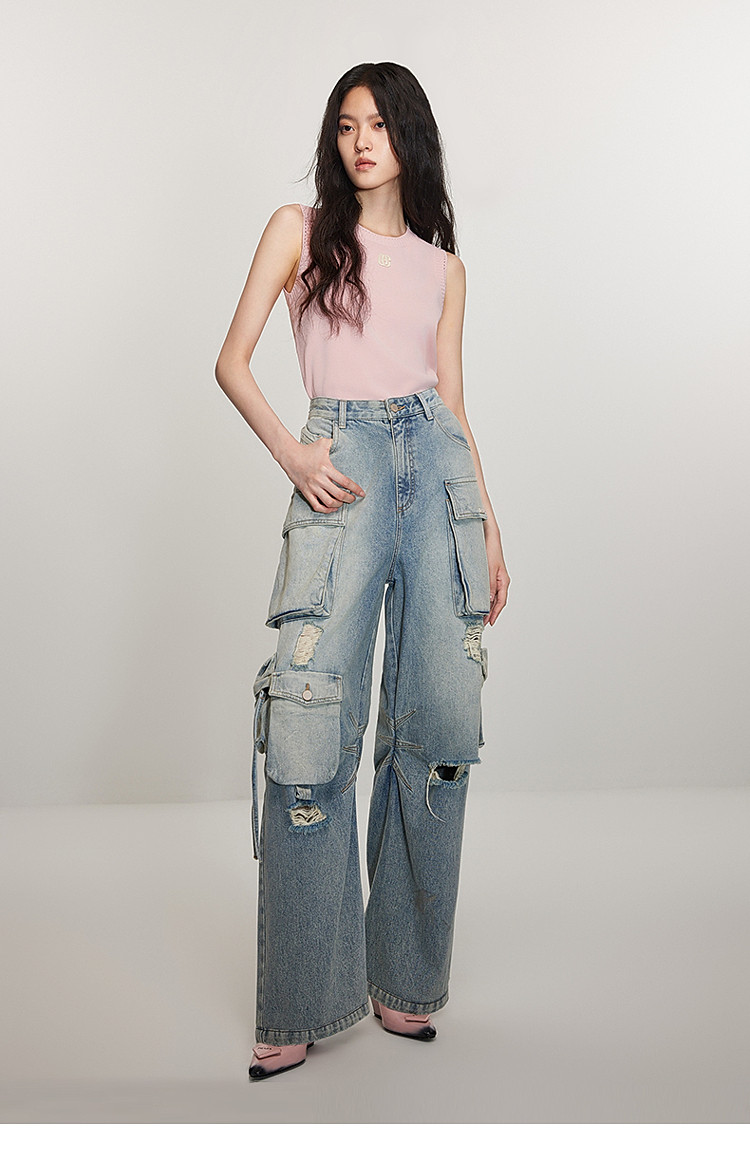 春装 工装裤阔腿牛仔裤女初破洞直筒宽松显瘦 940815