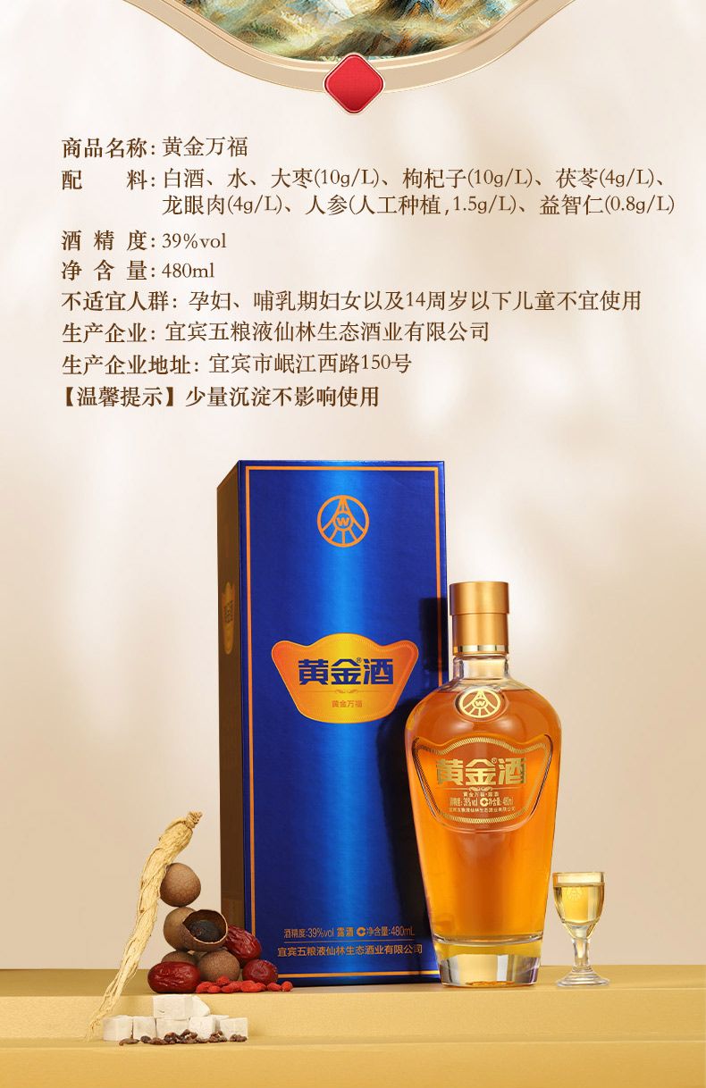 商品名称:【送长辈 黄金酒】五粮液集团出品39度黄金万福酒经典款送礼自饮草本露酒 白酒基酒480mL*2