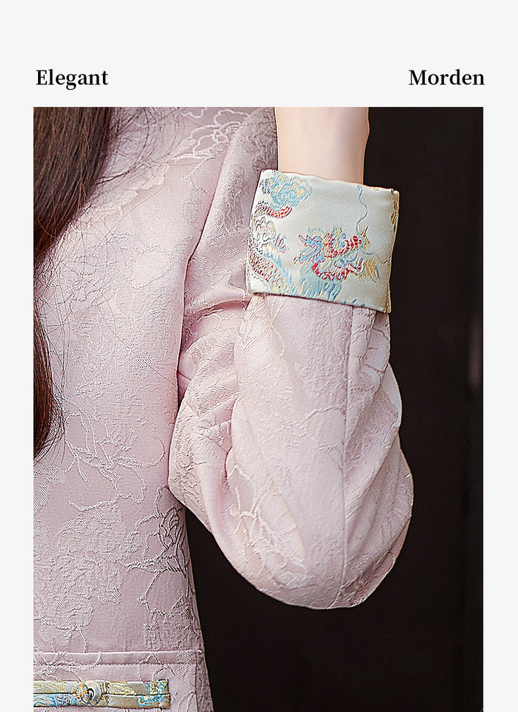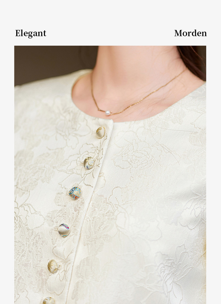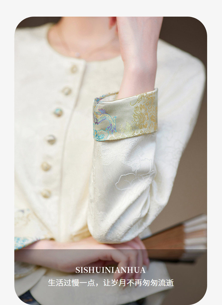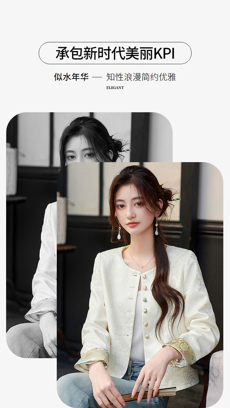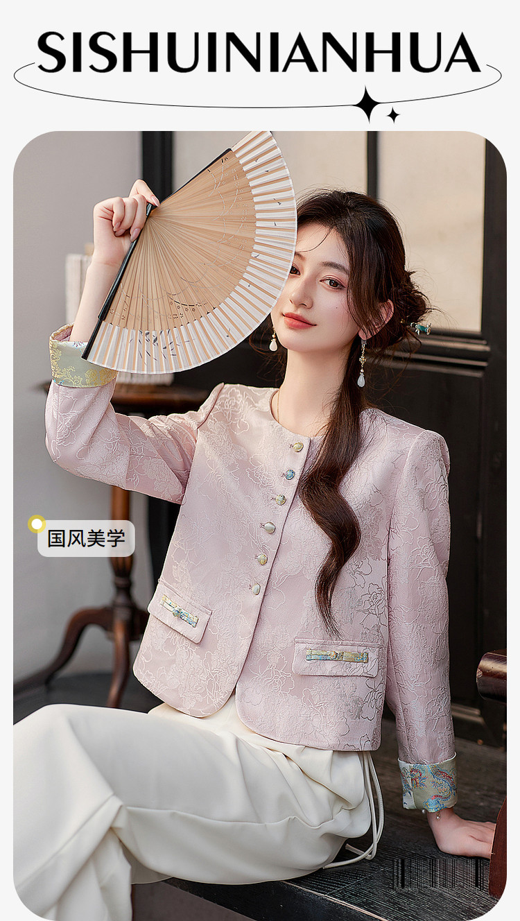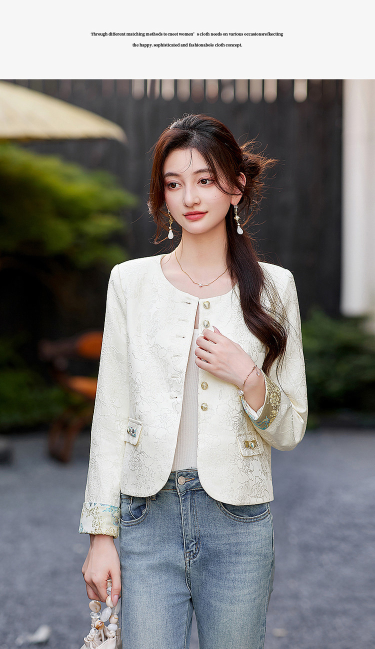 商品名称:春单排扣圆领袖口拼色提花国风短外套女上衣 607064