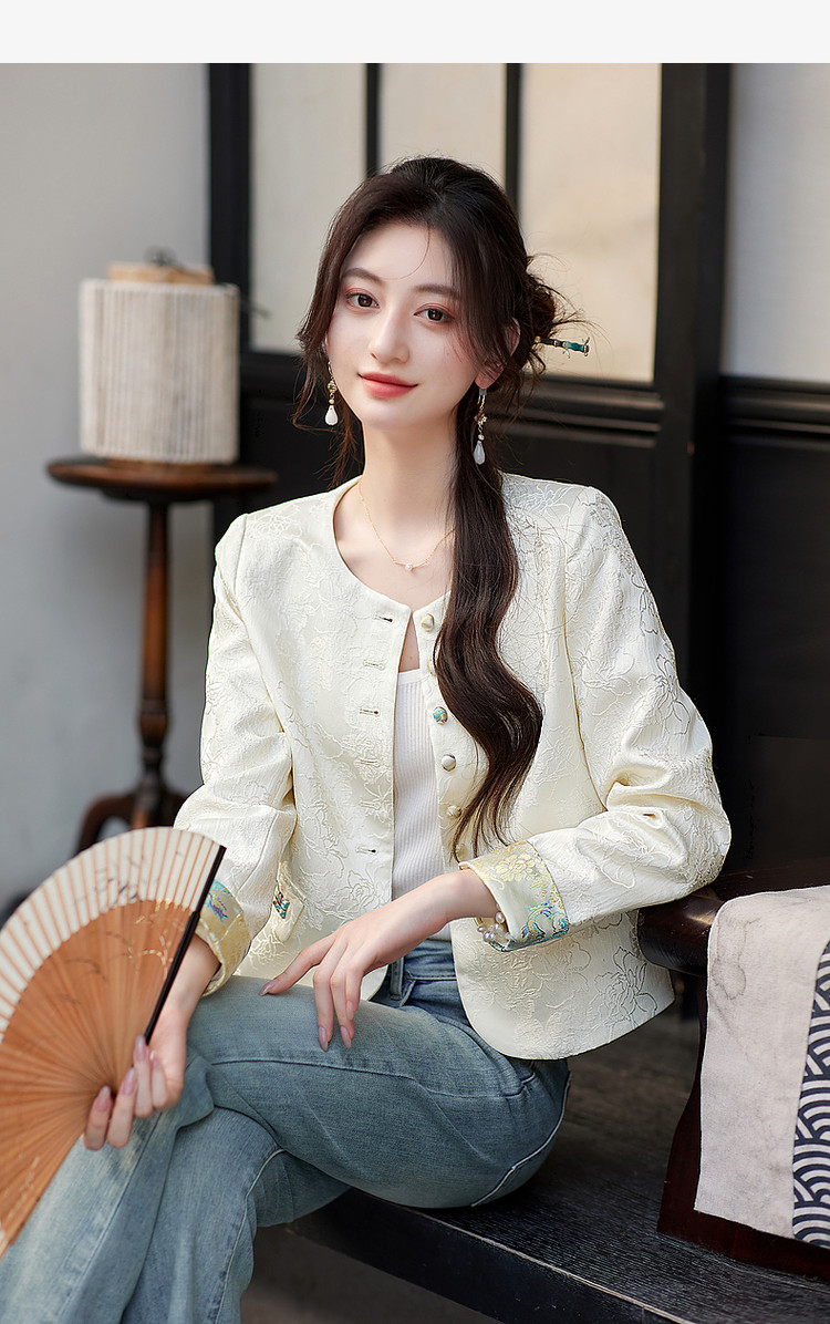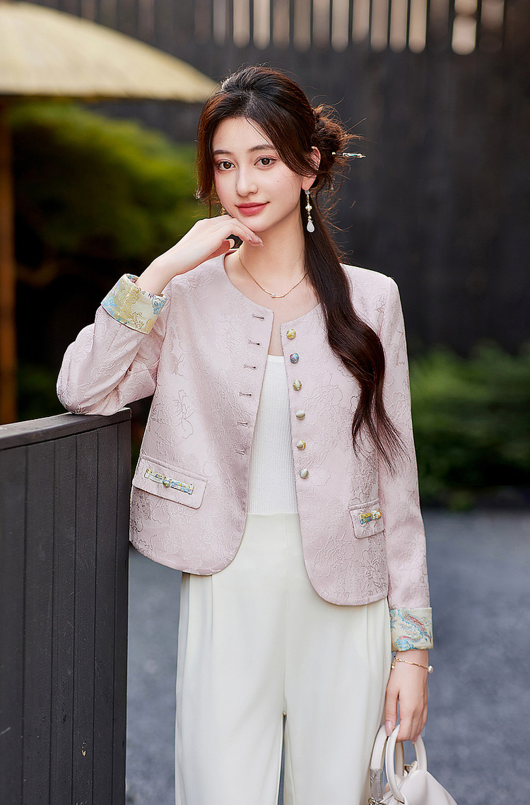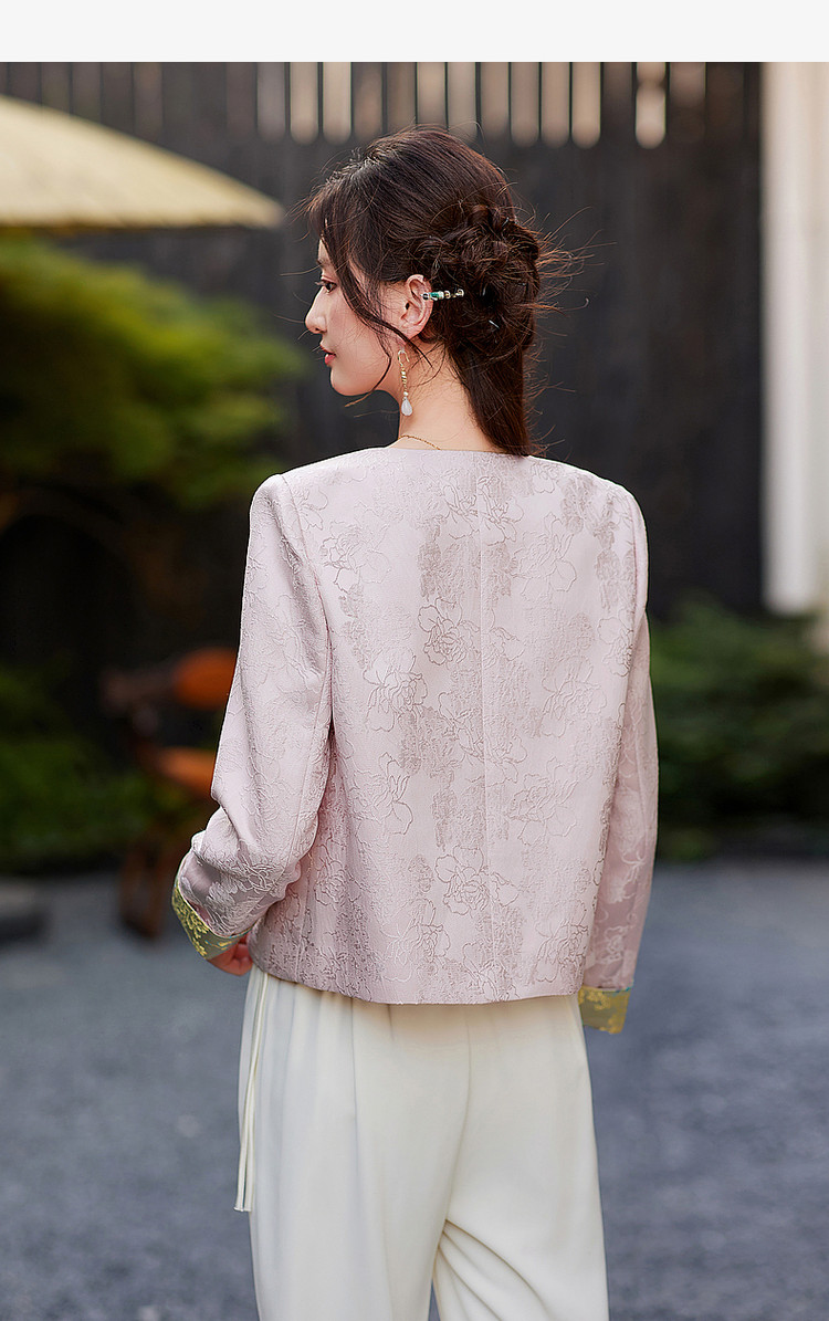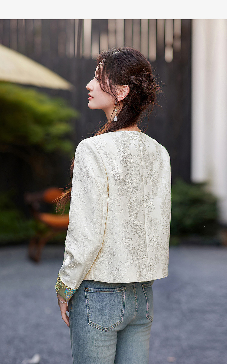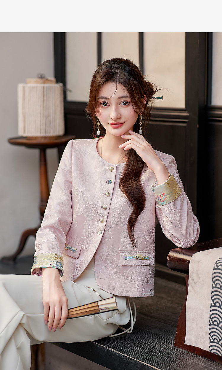 春单排扣圆领袖口拼色提花国风短外套女上衣 607064