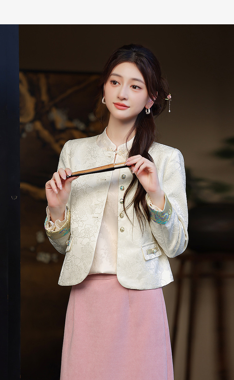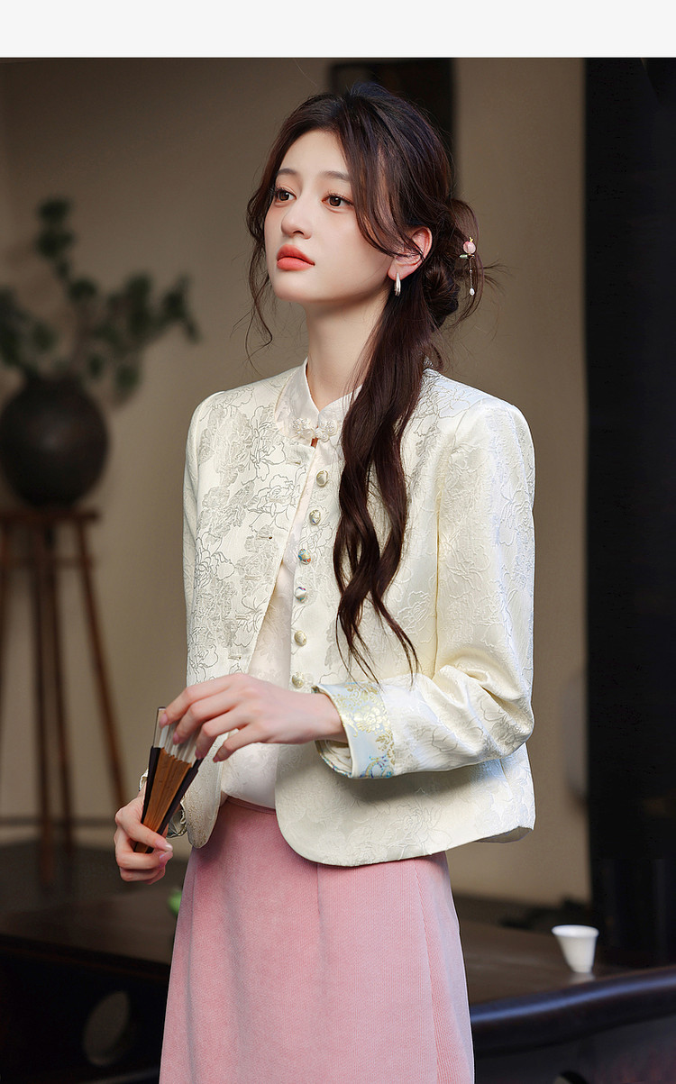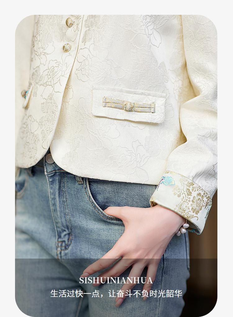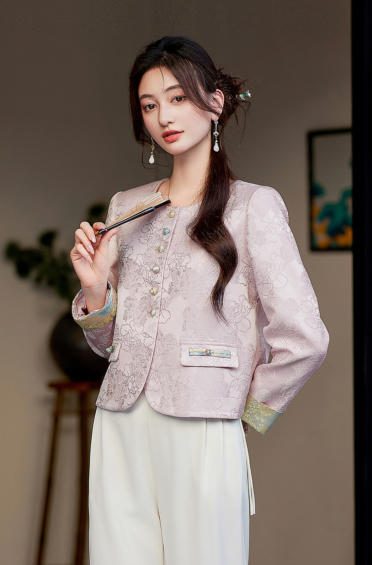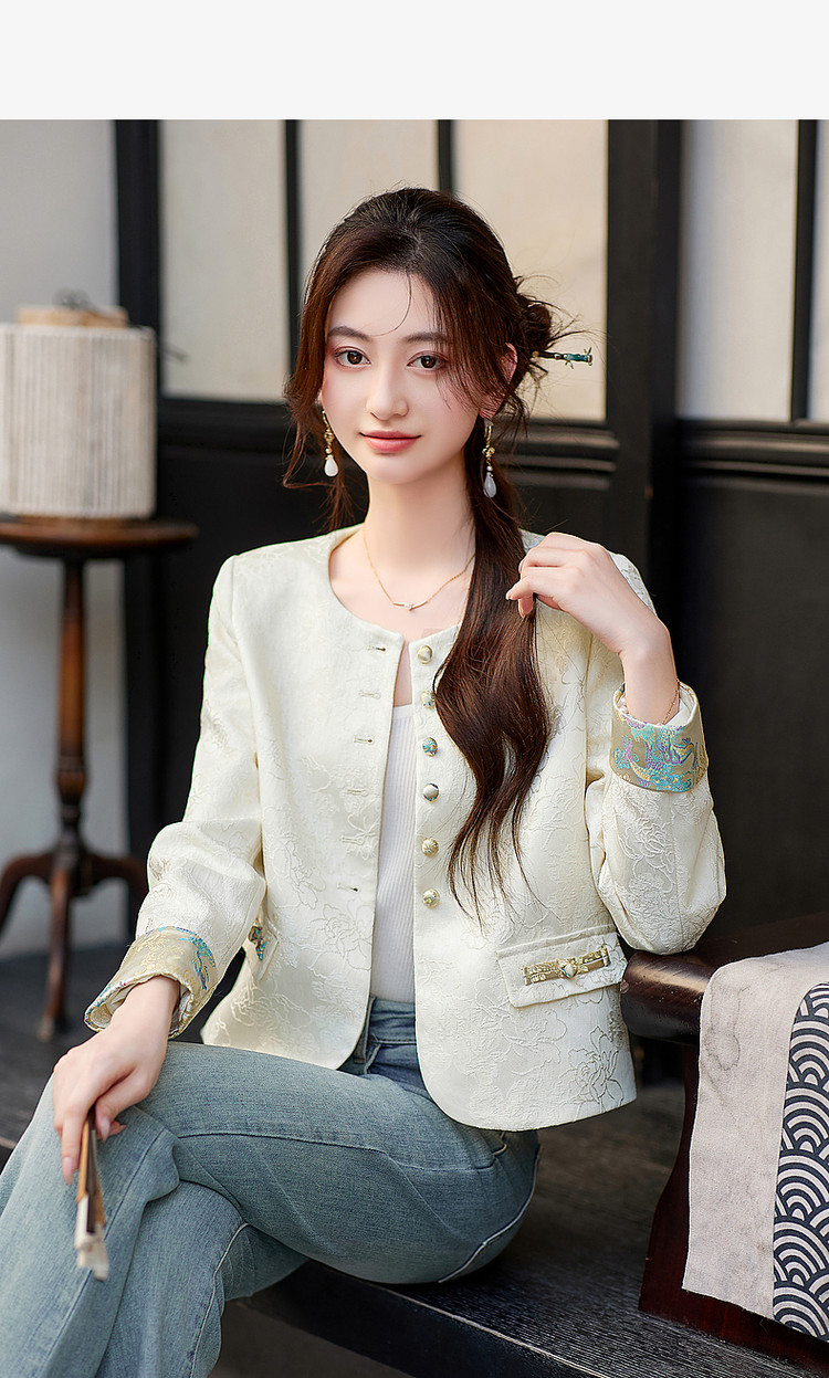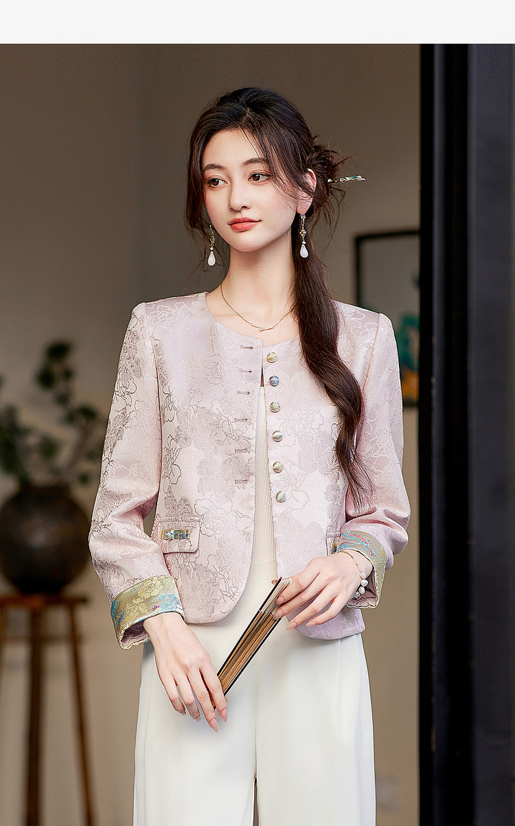 春单排扣圆领袖口拼色提花国风短外套女上衣 607064