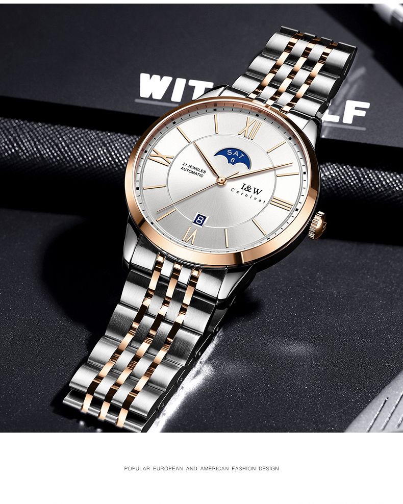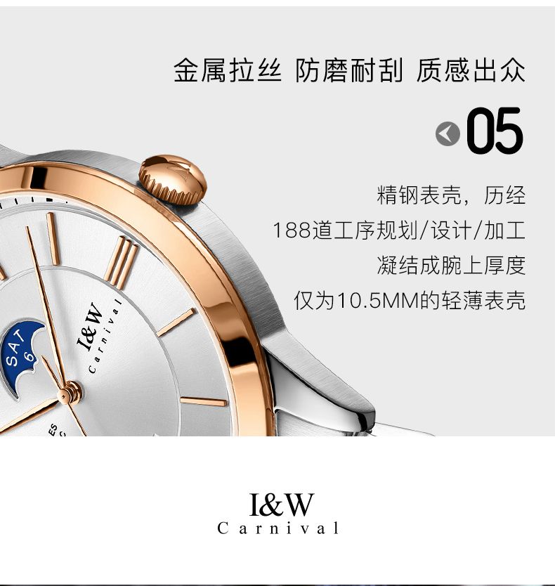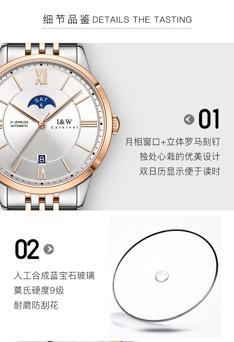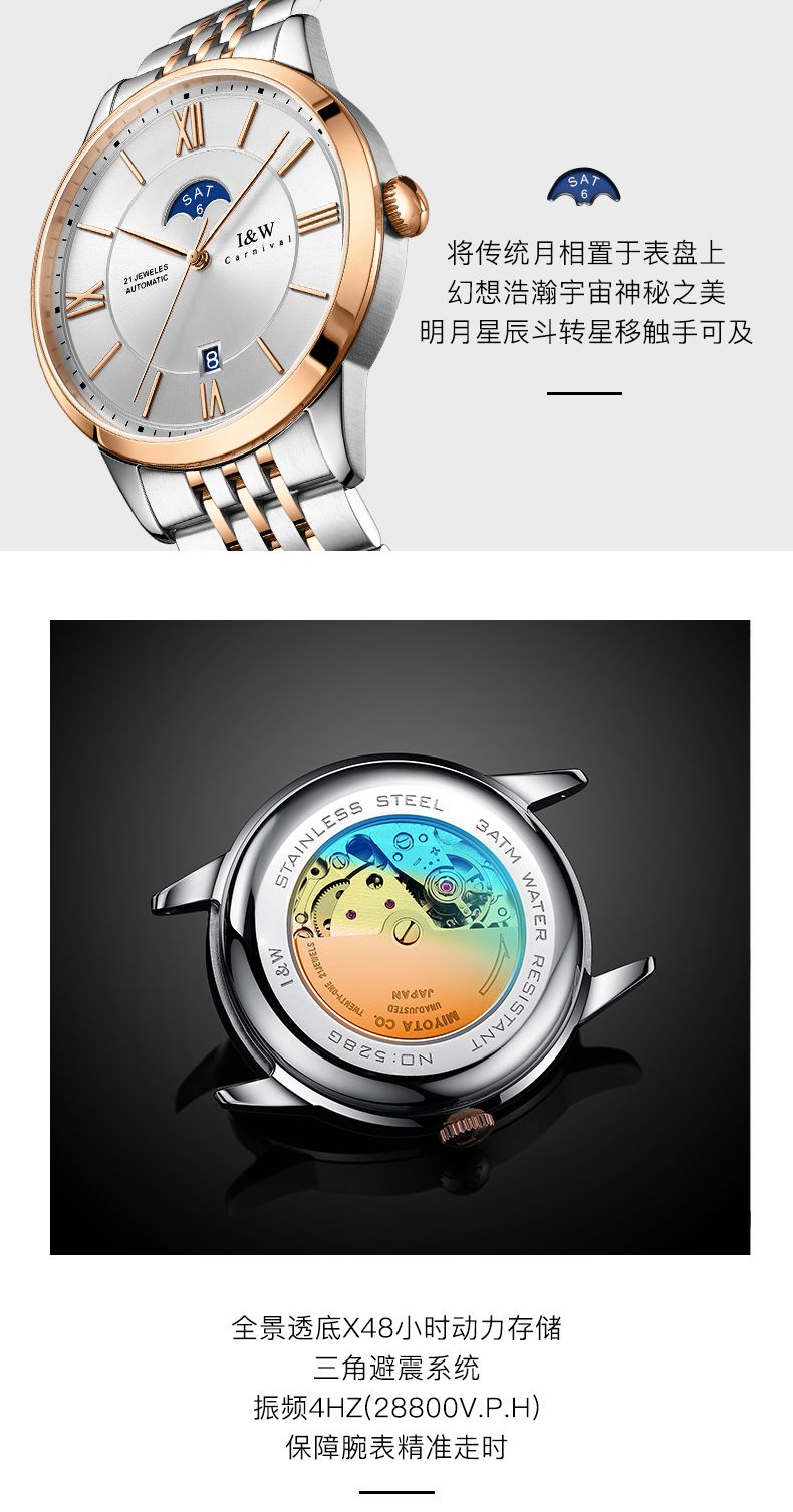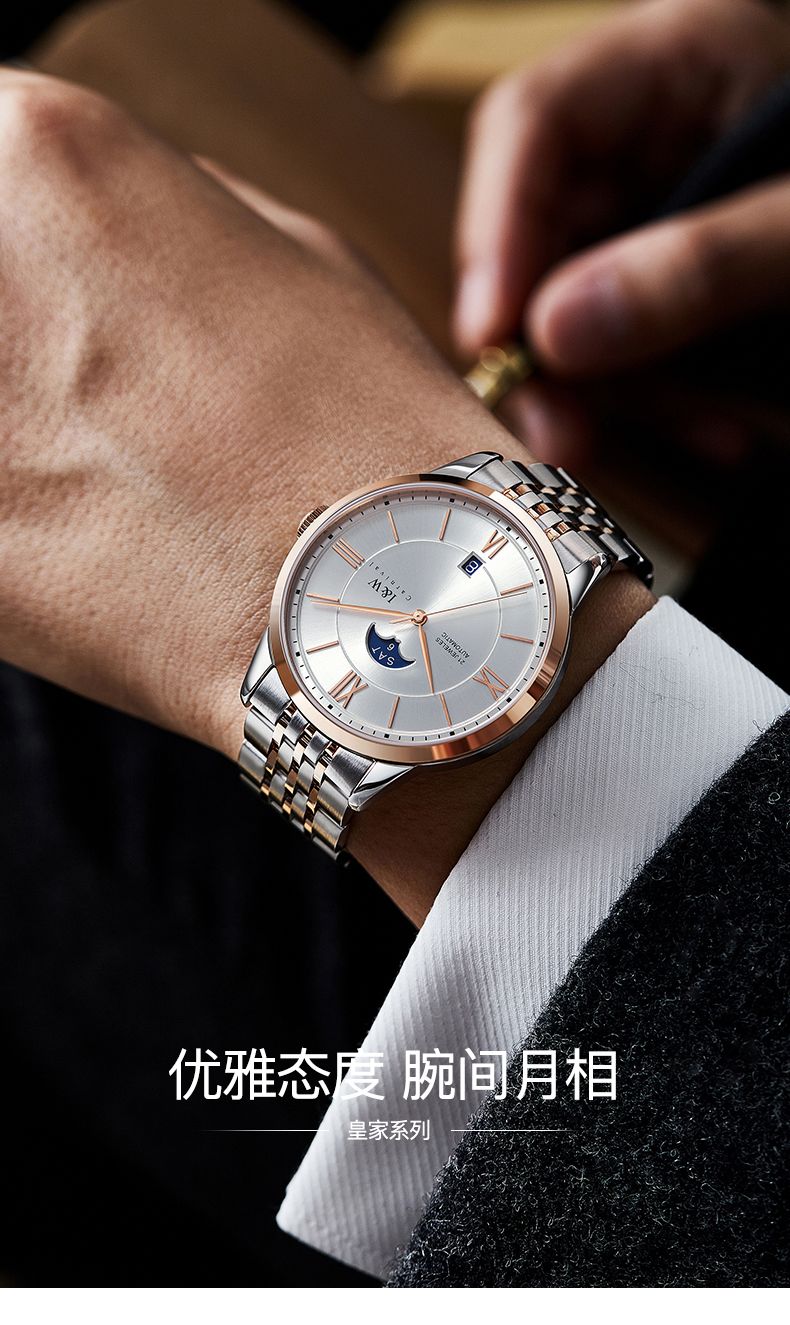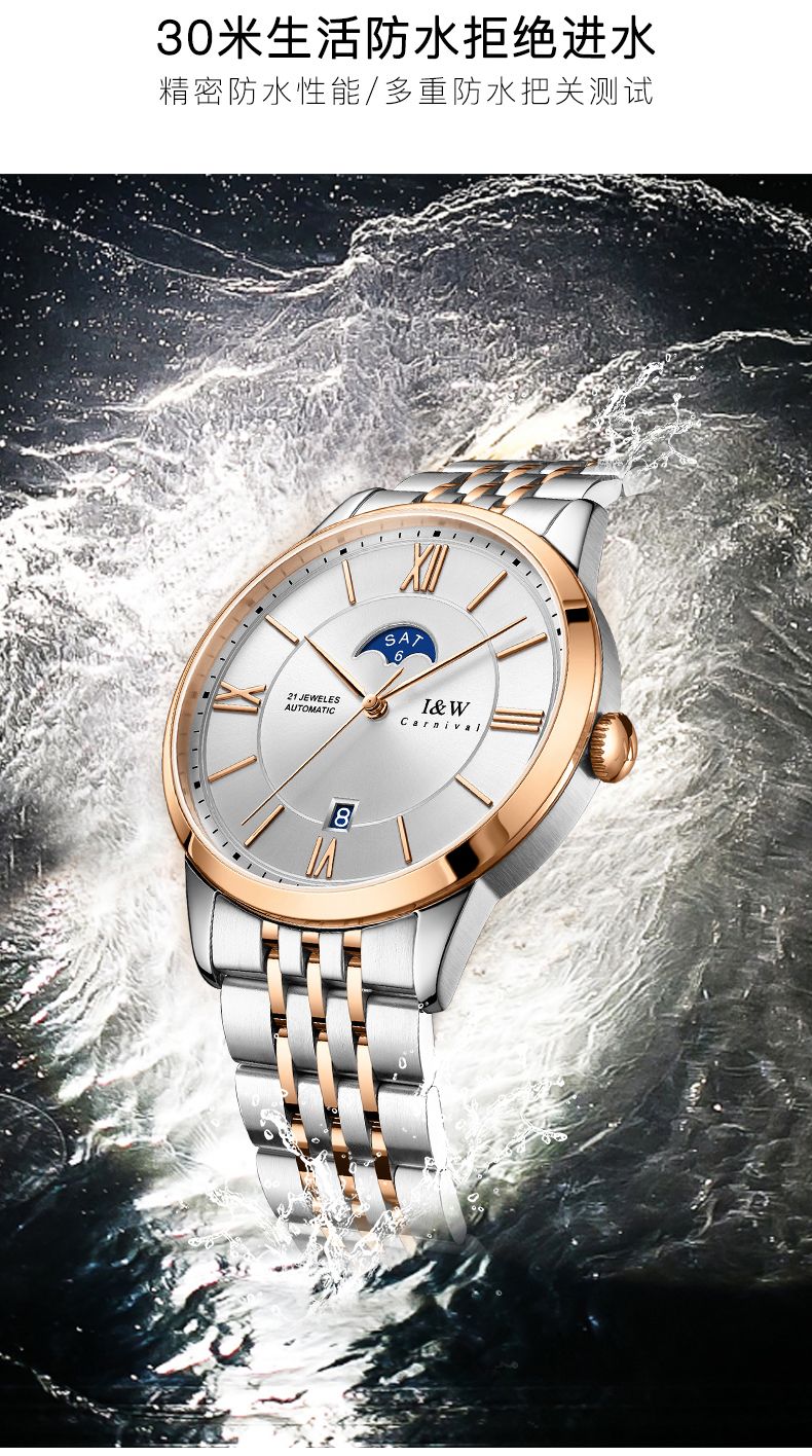 商品名称:I&W手表男士自动机械表男表皇家系列双日历镂空防水腕表IW528G