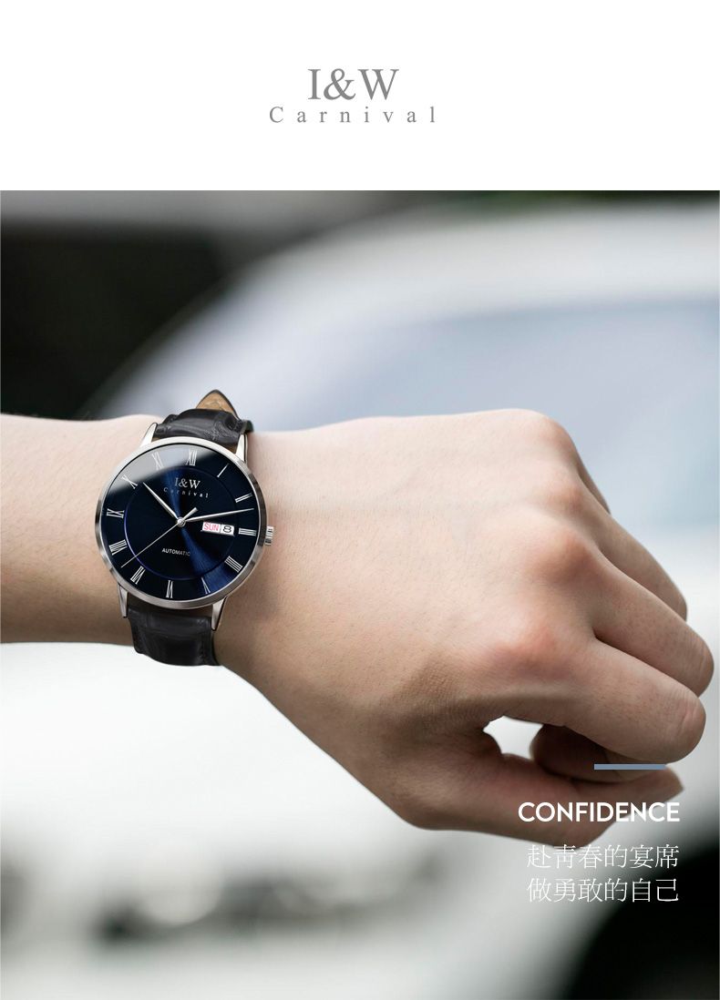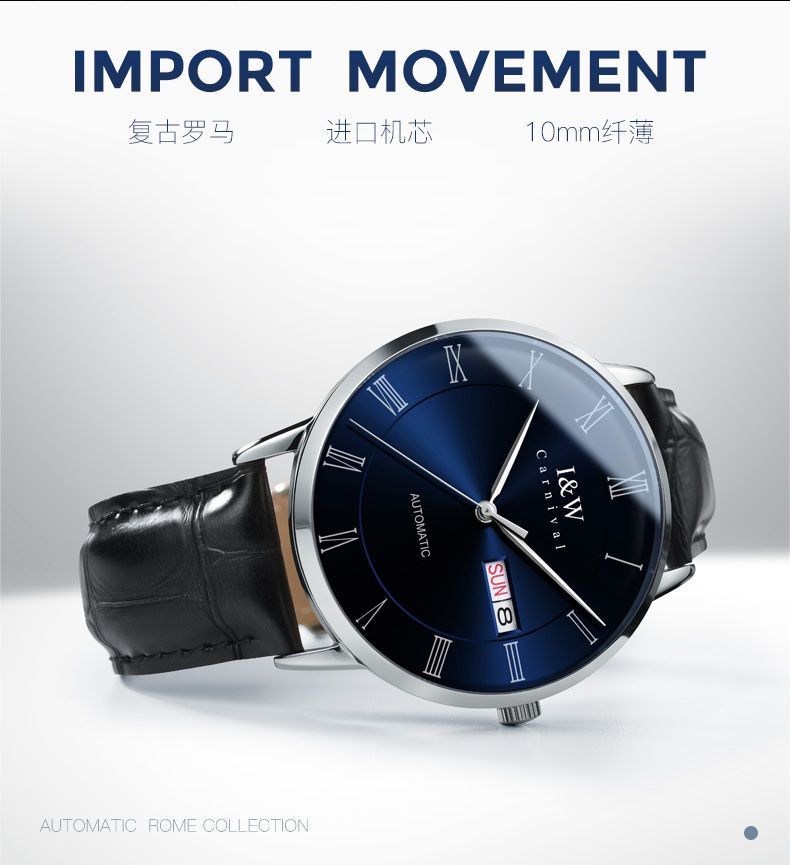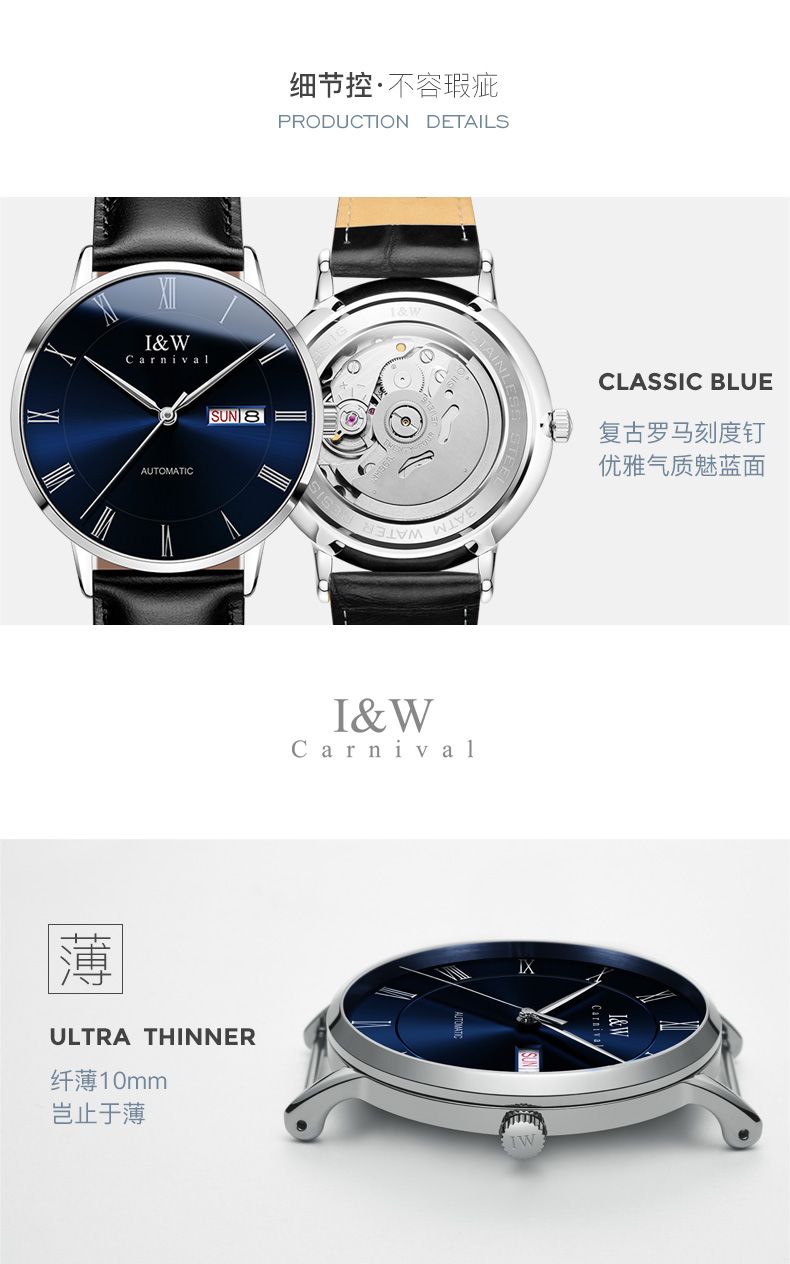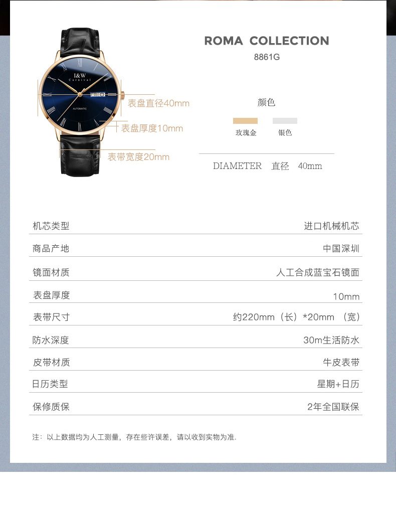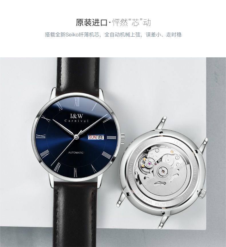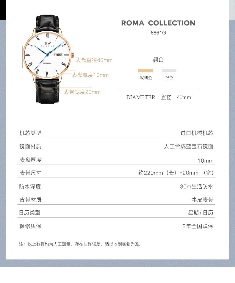 商品名称:I&W手表男士机械表全自动超薄进口机芯时尚简约商务罗马蓝宝石玻璃防水腕表IW8861G