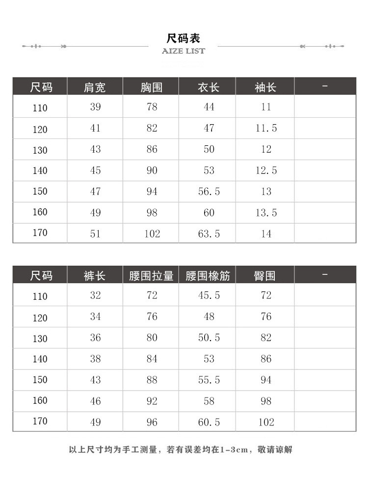 尺码 肩宽(cm) 袖长(cm) 上装号型 适合年龄 下装号型 衣长(cm) 身高(cm) 腰围(cm) 裤长(cm) 臀围(cm) 胸围(cm) 号型
