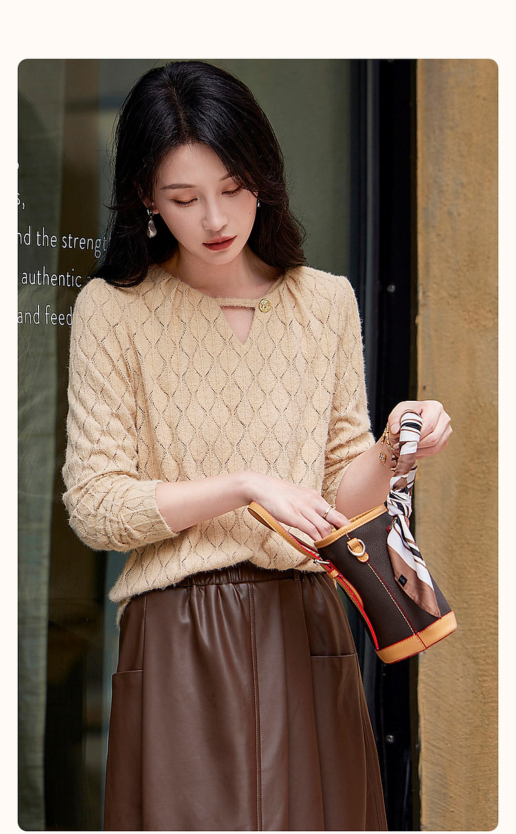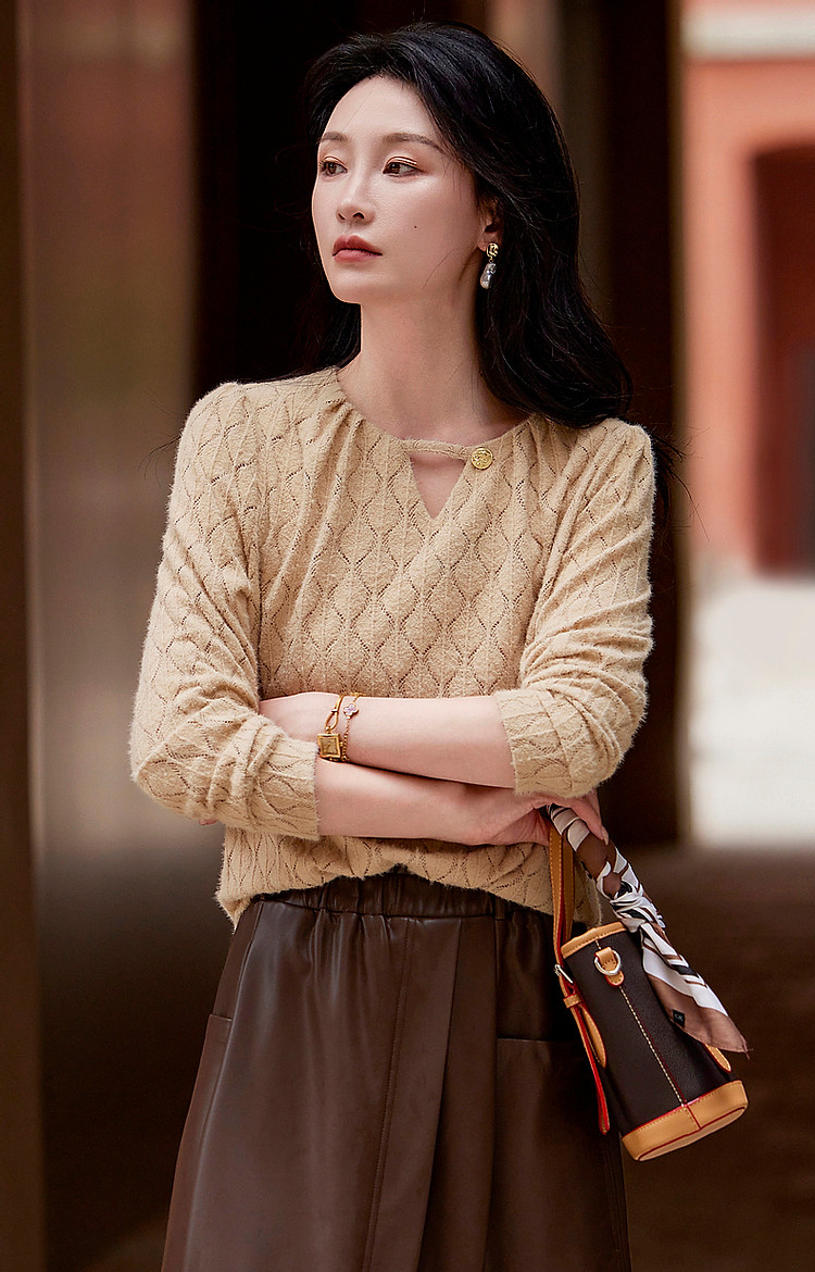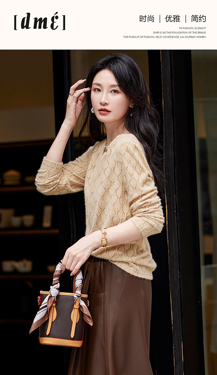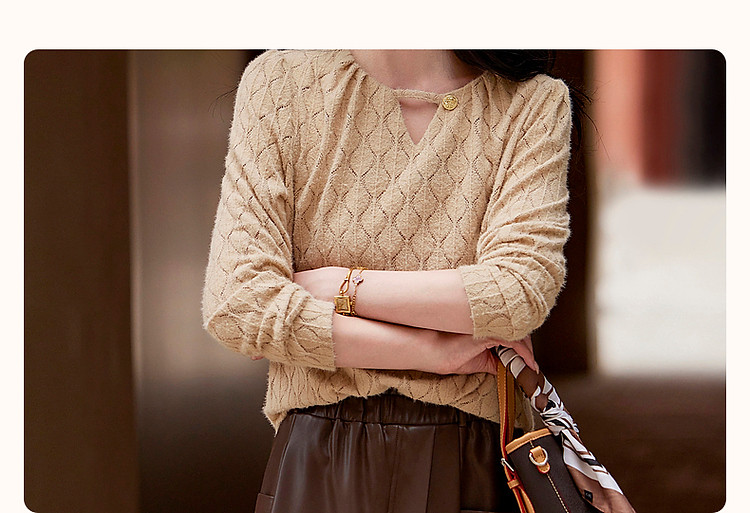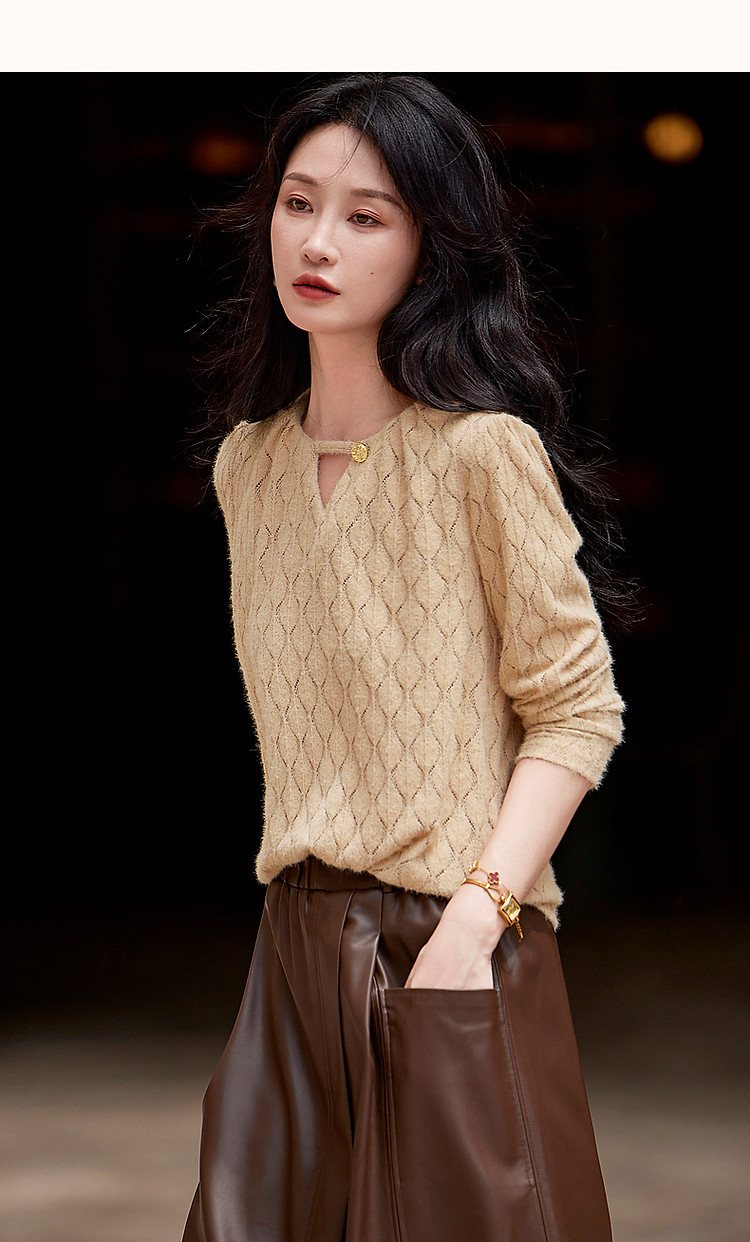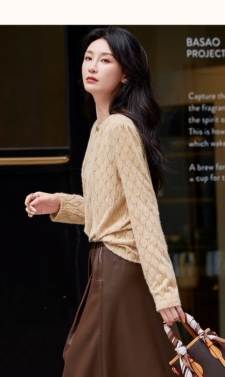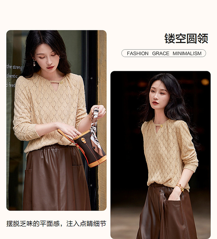 商品名称:【读懂她的温柔】秋季云感柔雾镂空线衫舒适遮肉圆领针织衫女上衣 543873
