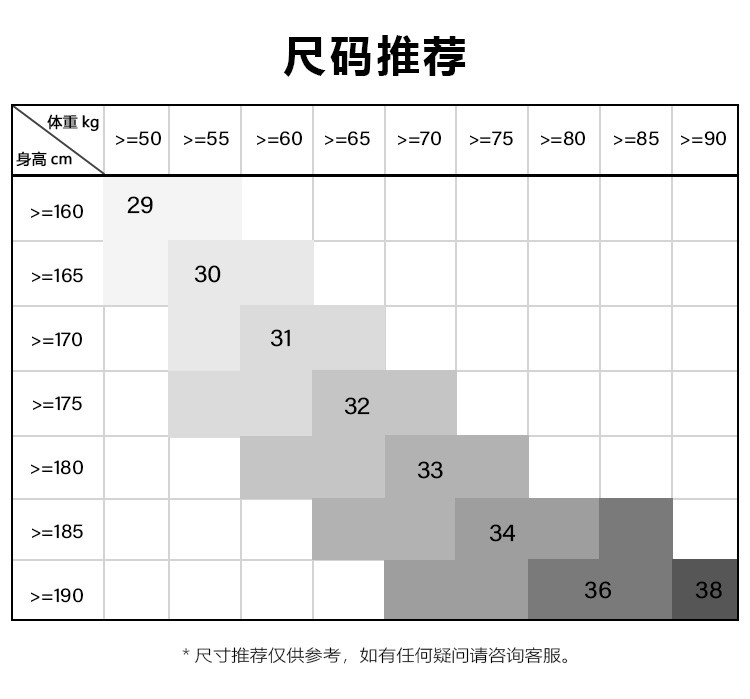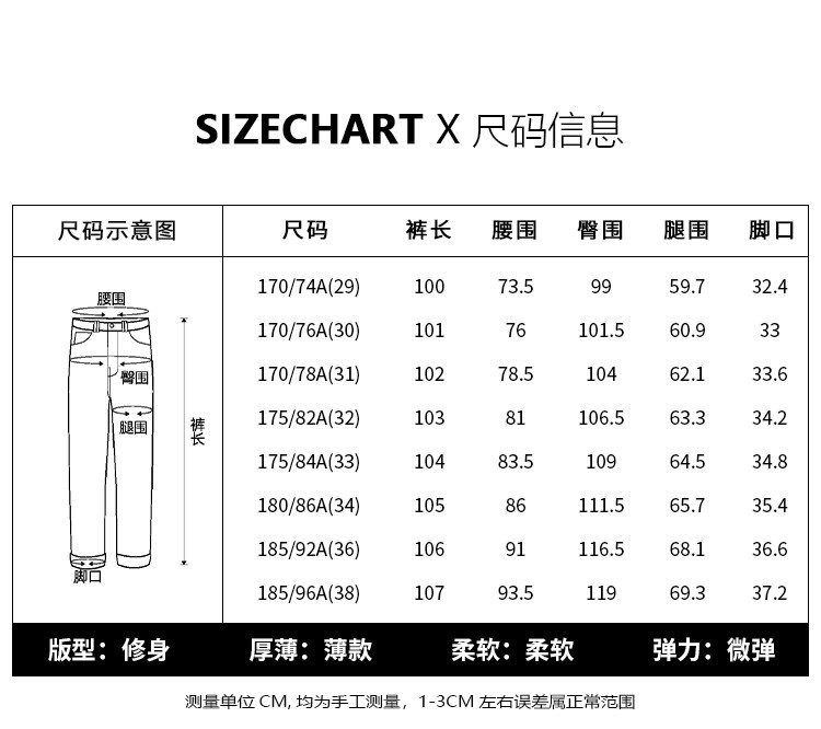 | 尺码 | 大腿围(cm) | 裤脚围(cm) | 前浪(cm) | 后浪(cm) | 腰围(cm) | 裤长(cm) | 膝围(cm) | 臀围(cm) | 号型 |