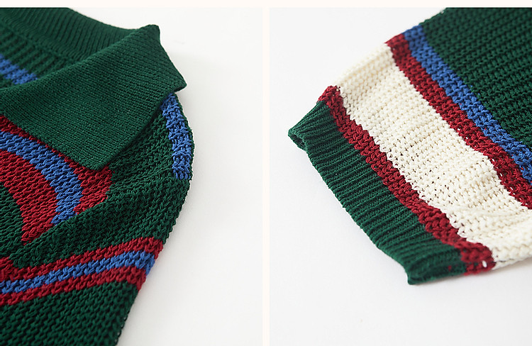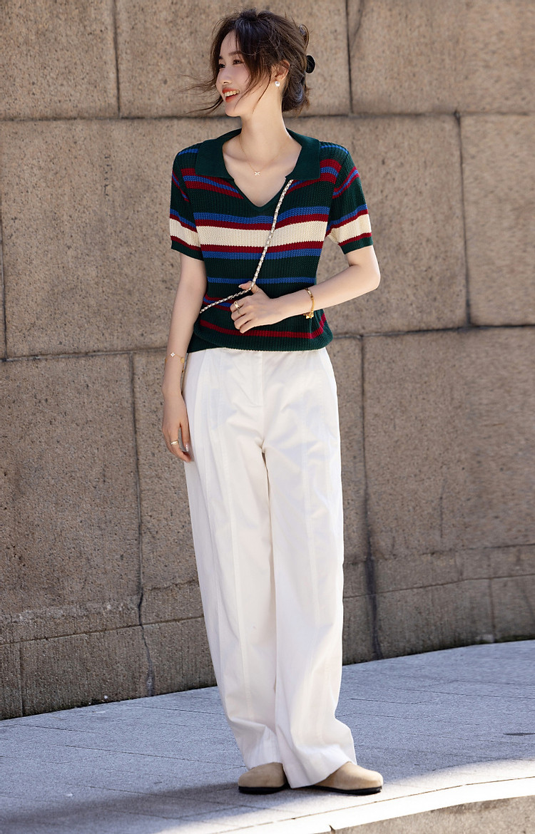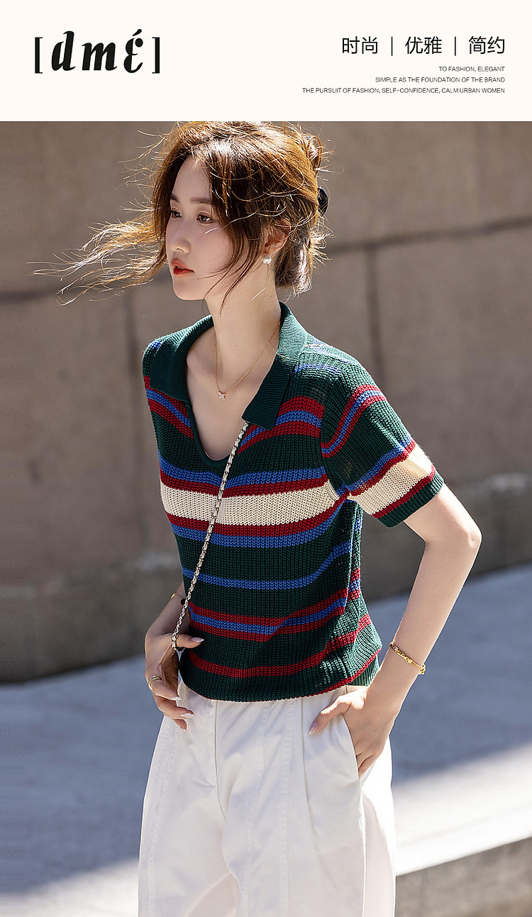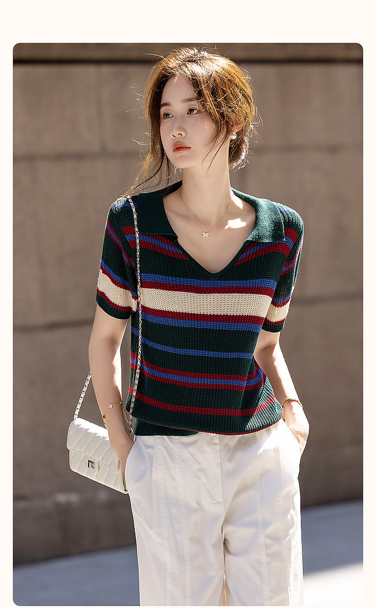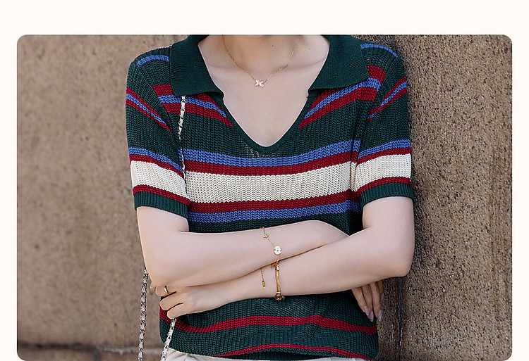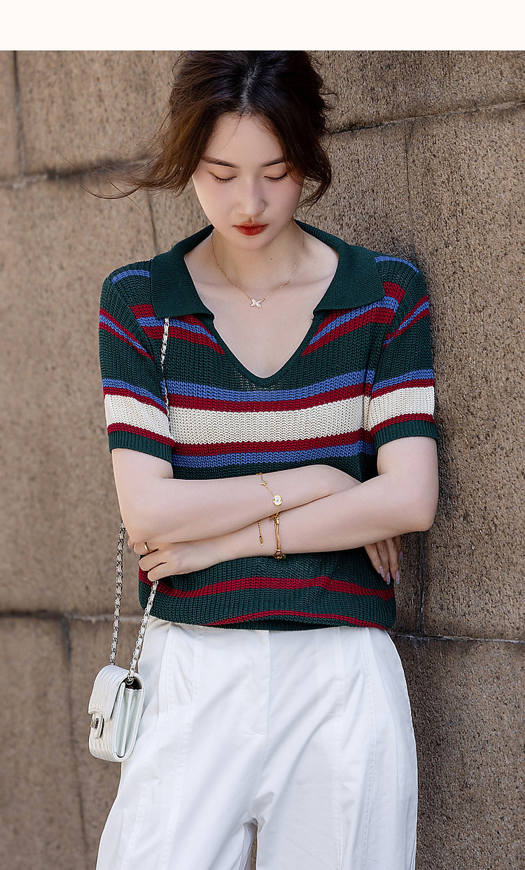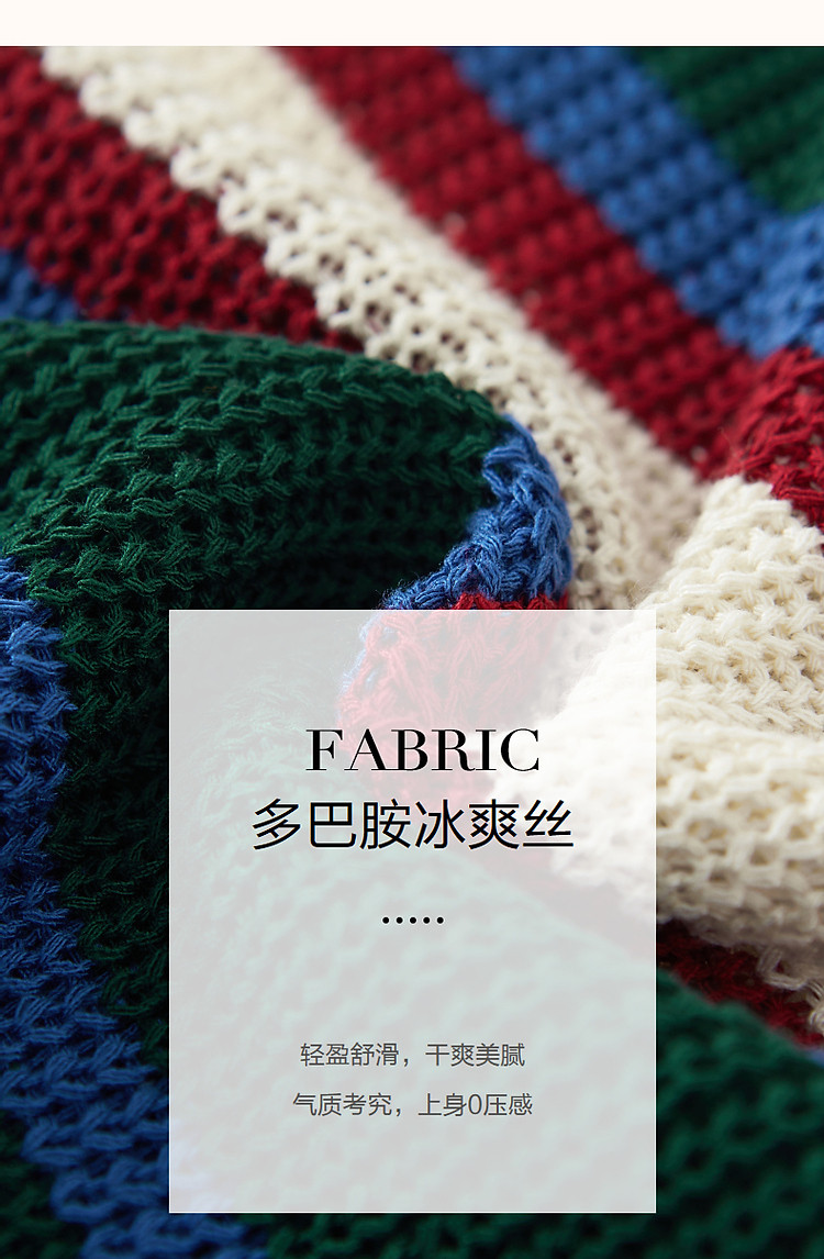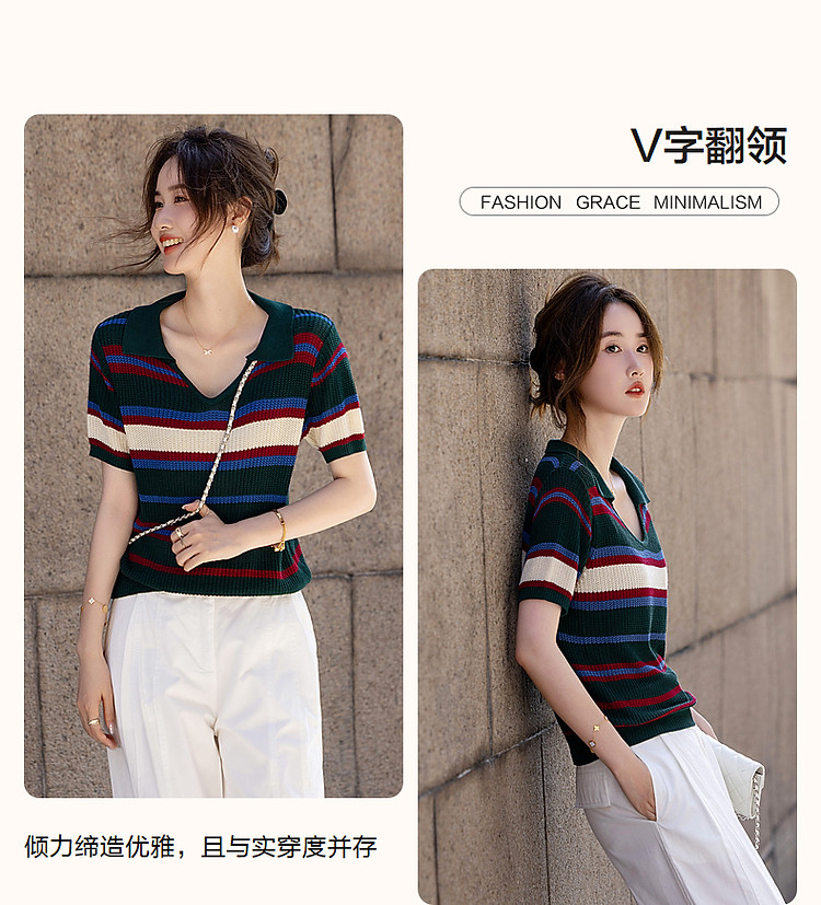 商品名称:【糖果多巴胺】夏轻龄感冰爽丝撞色条纹线衫V字翻领针织衫女上衣 334977