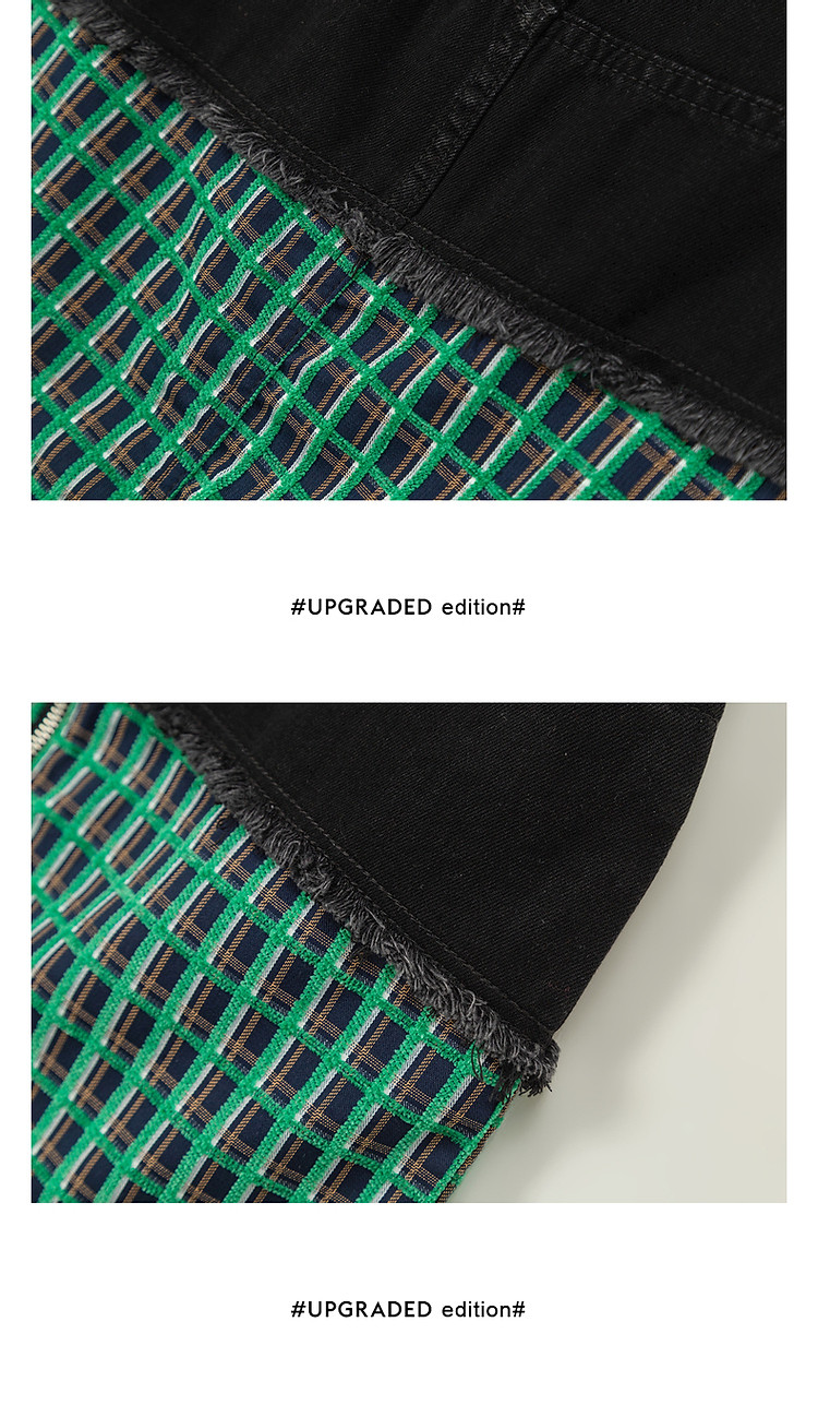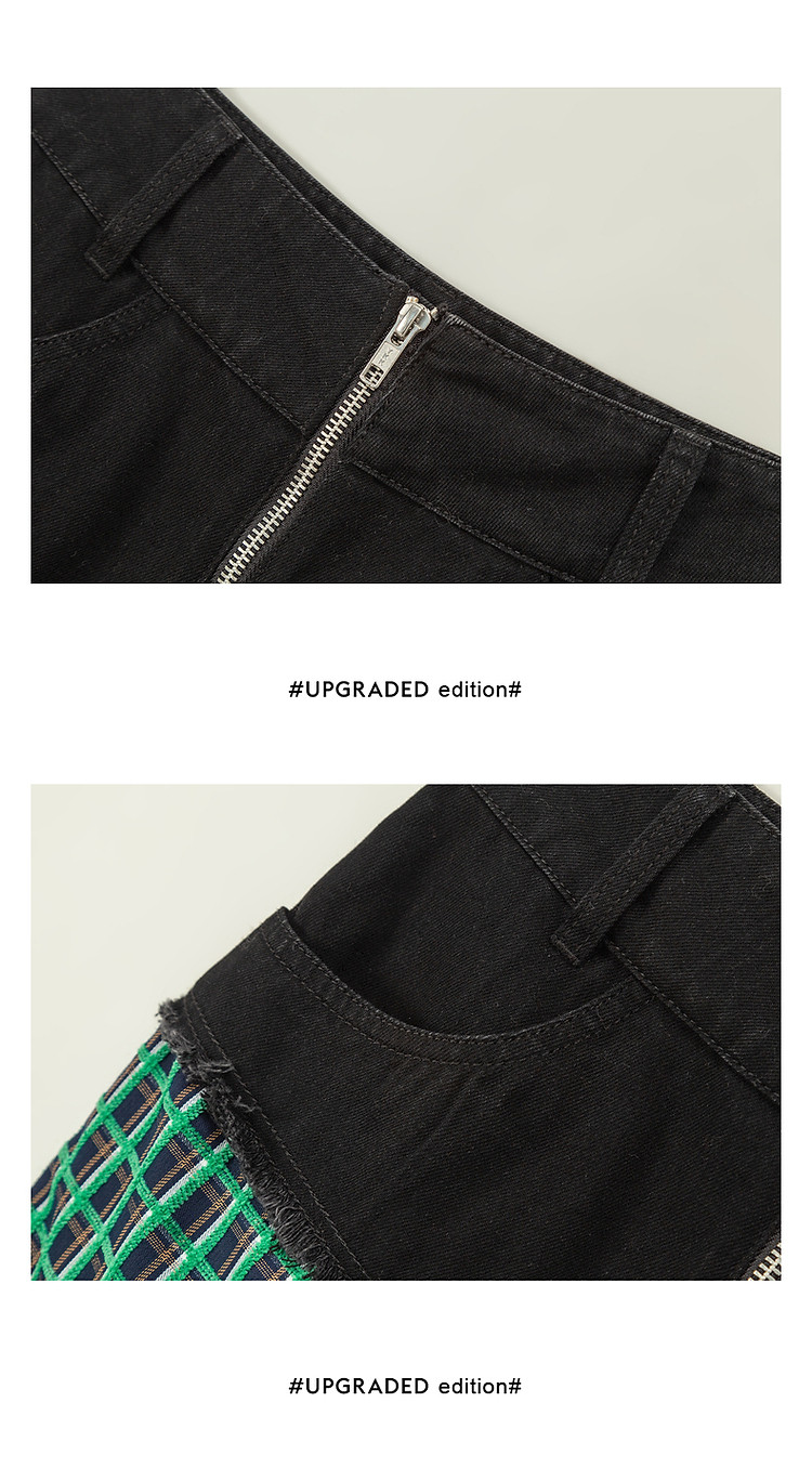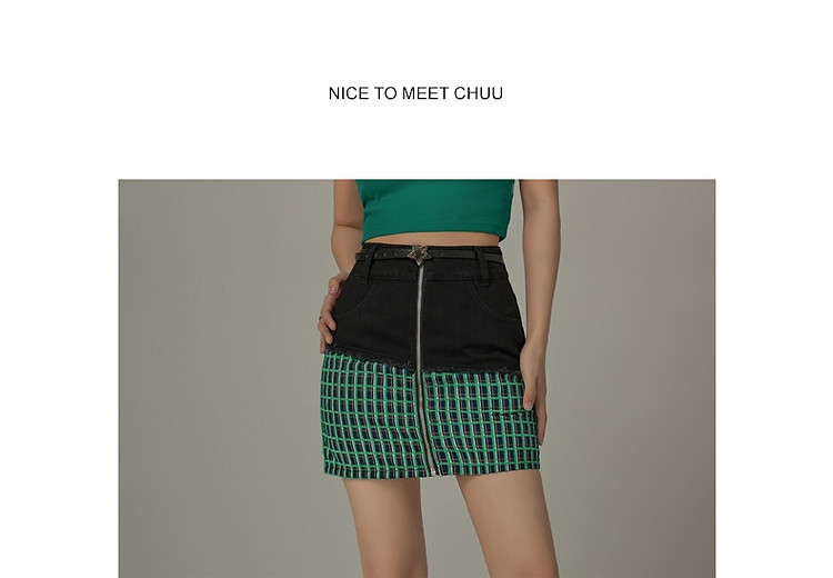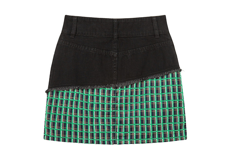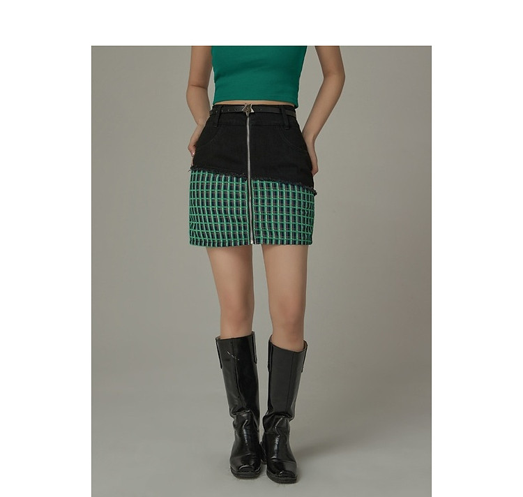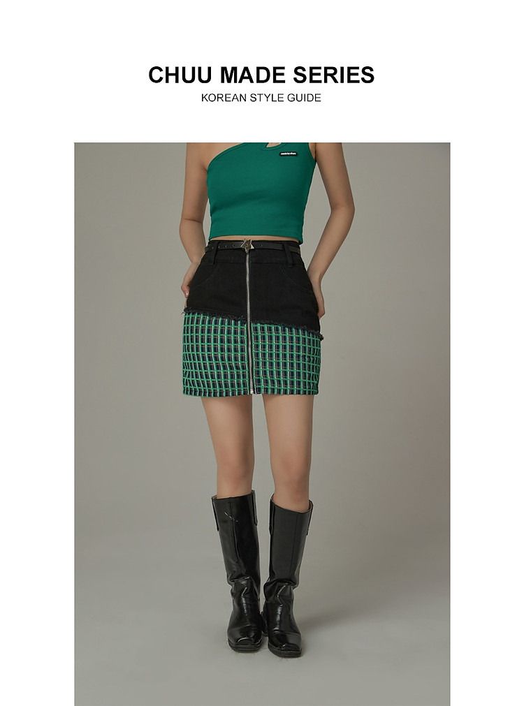 拉链拼接半身裙女士秋季设计感毛边格纹撞色短裙子 834195