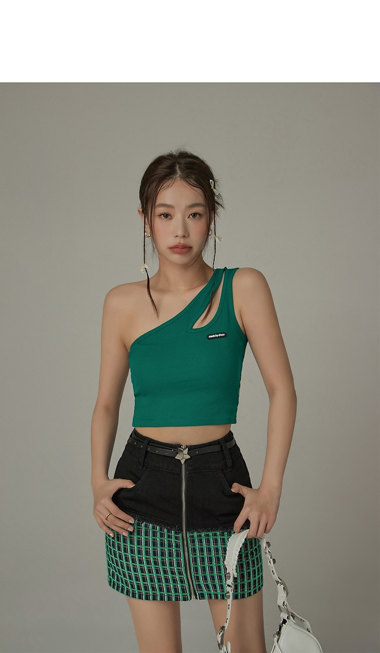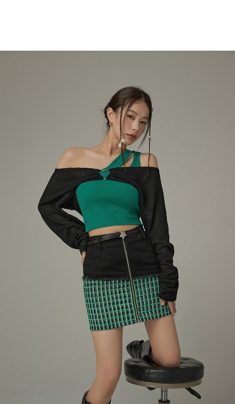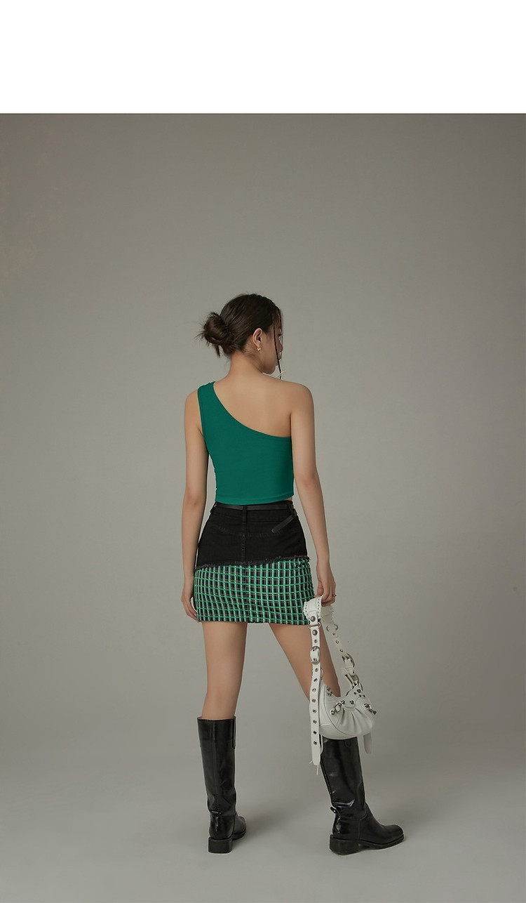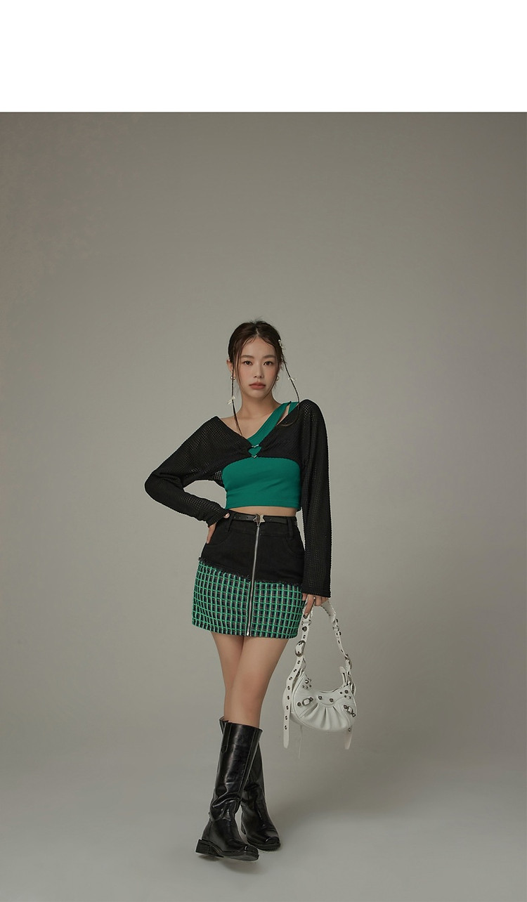 拉链拼接半身裙女士秋季设计感毛边格纹撞色短裙子 834195