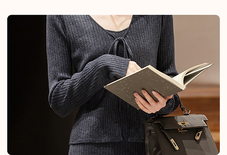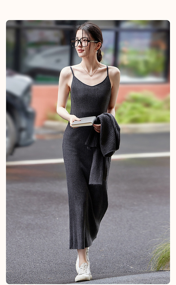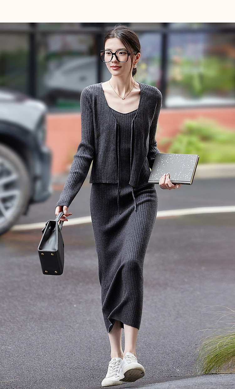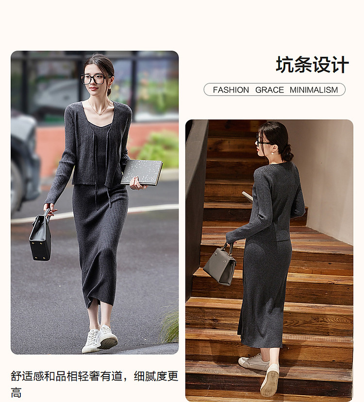 商品名称:【那时的此刻】春秋淑女绑带开衫提花针织中长连衣裙两件套女套装 916353