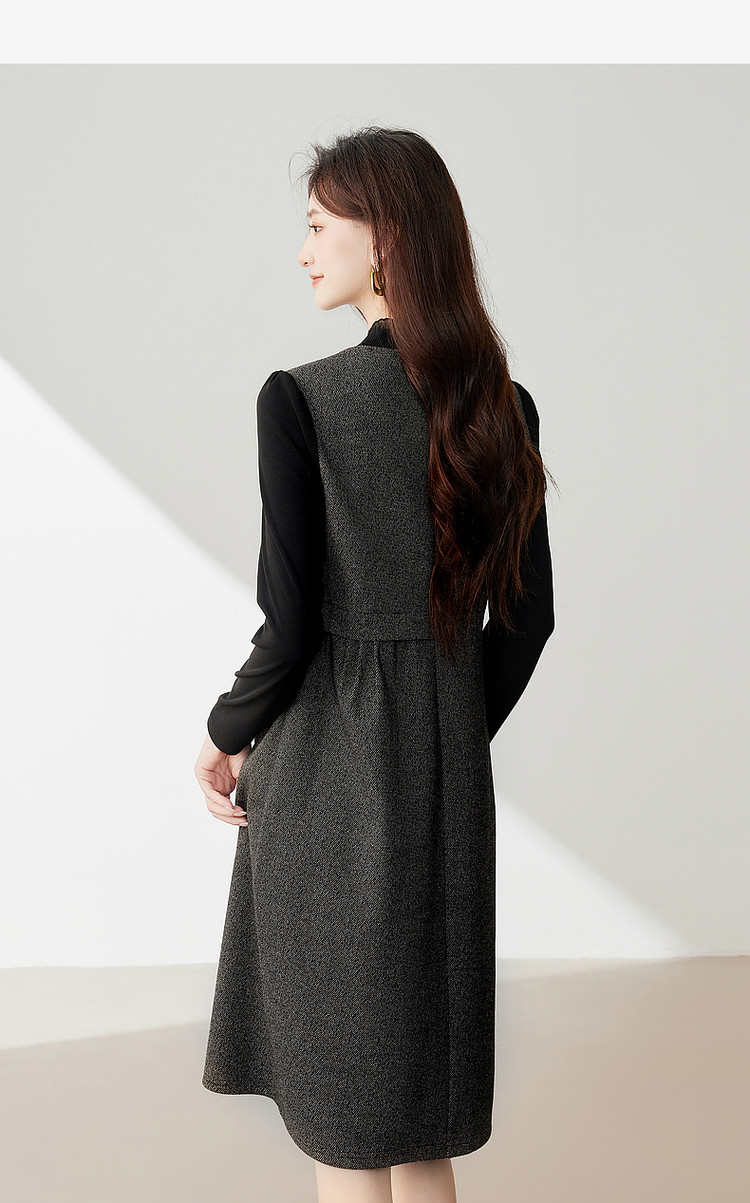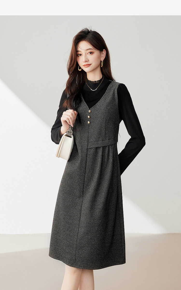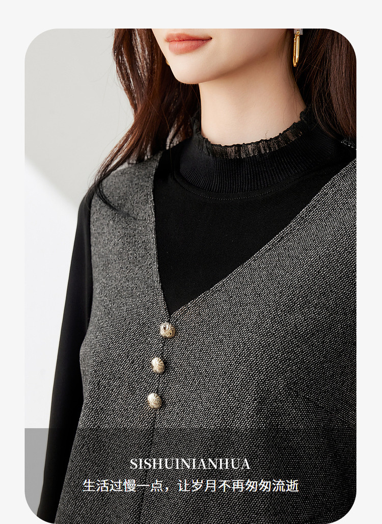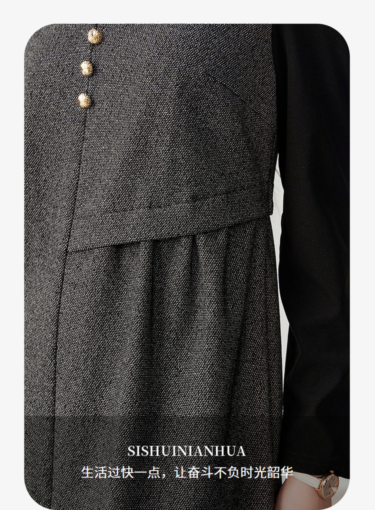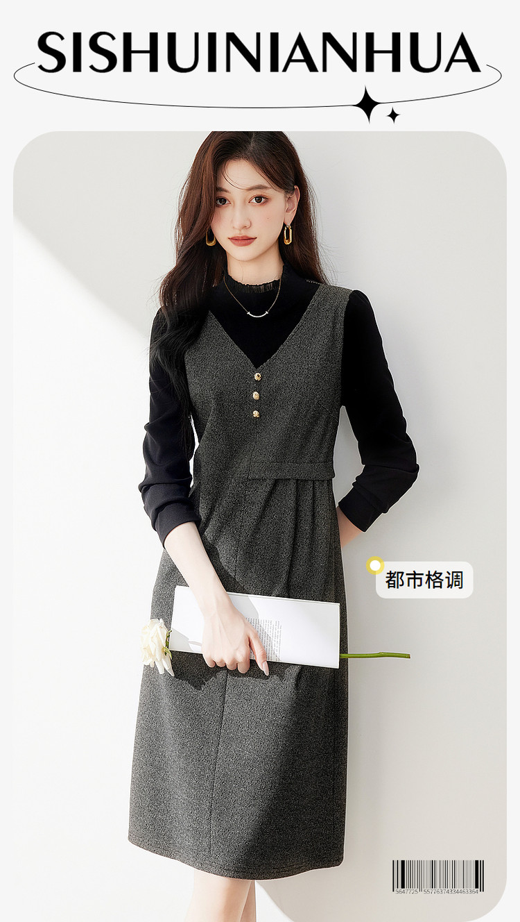 商品名称:时尚设计感连衣裙女显瘦洋气假两件遮肚子长袖打底裙 684888