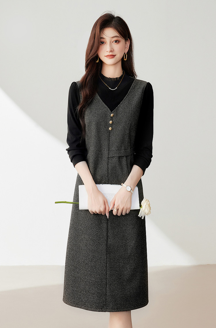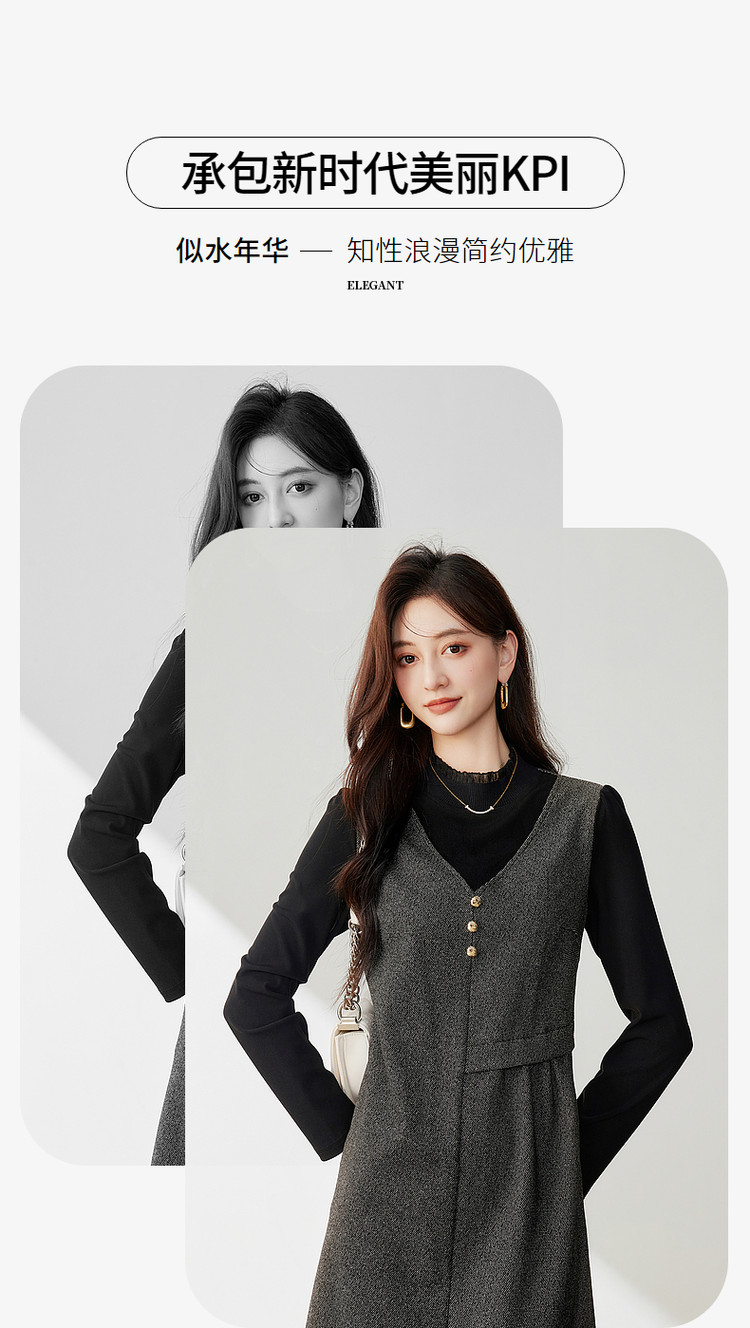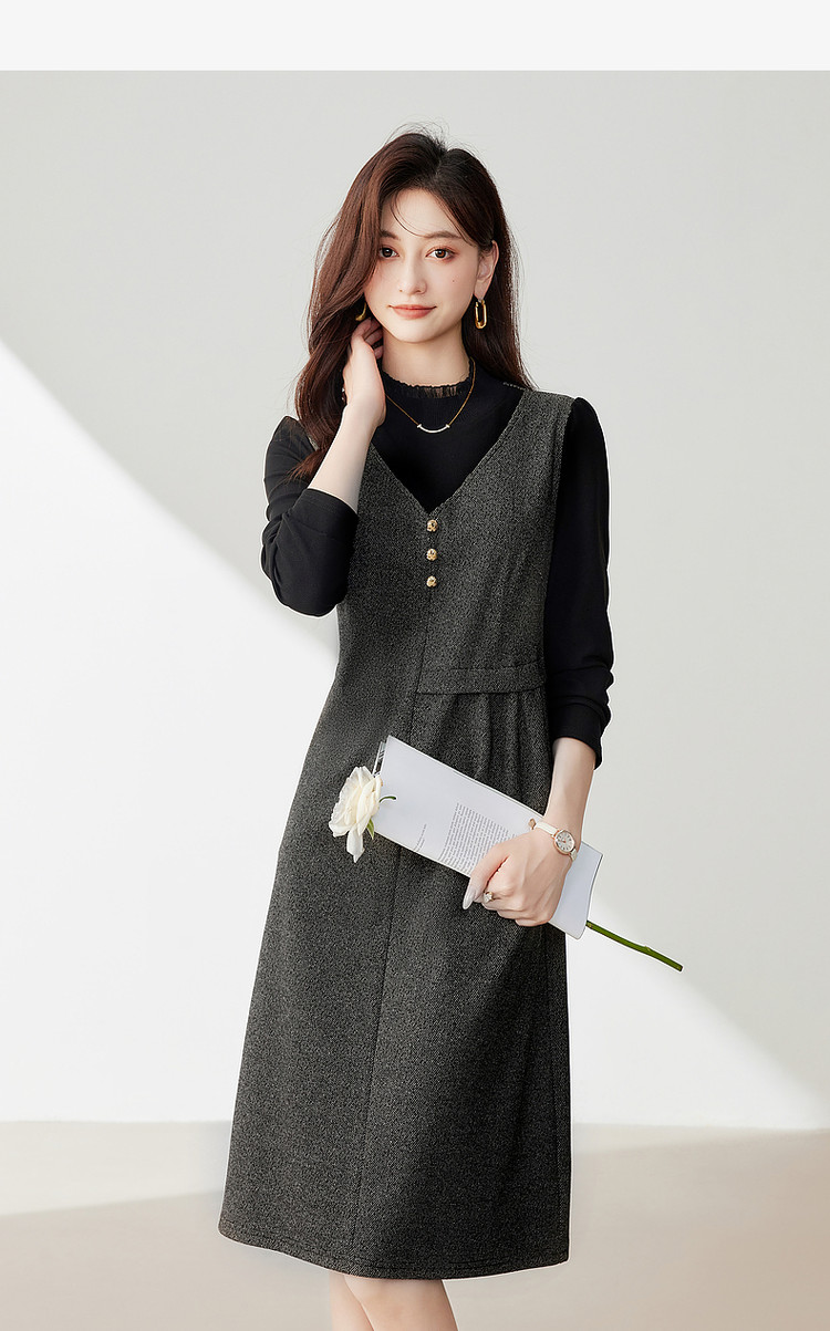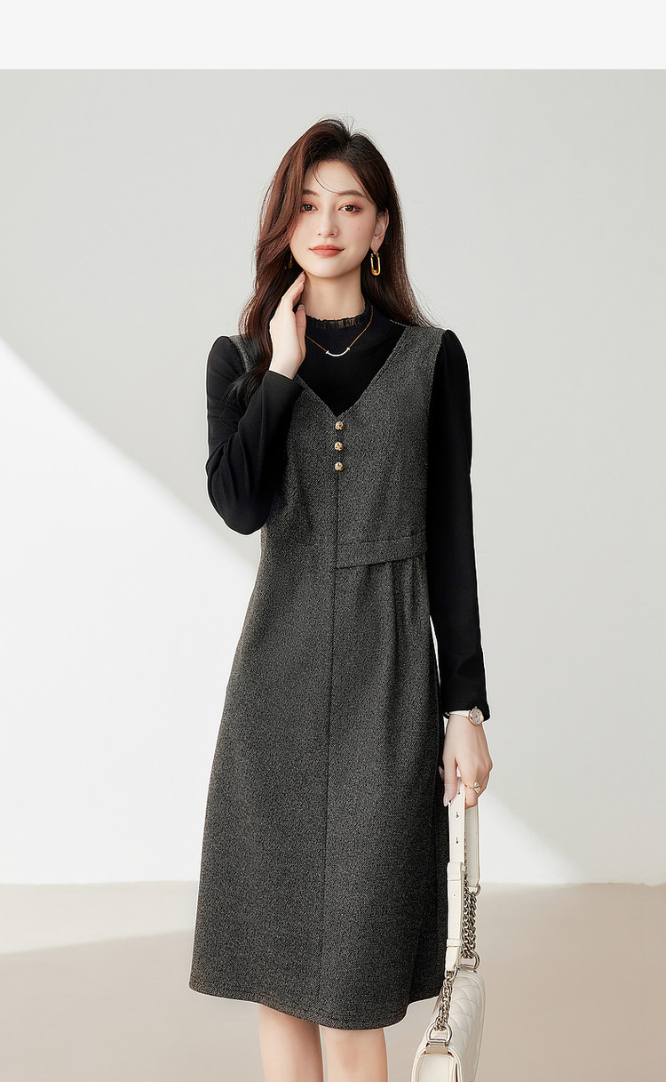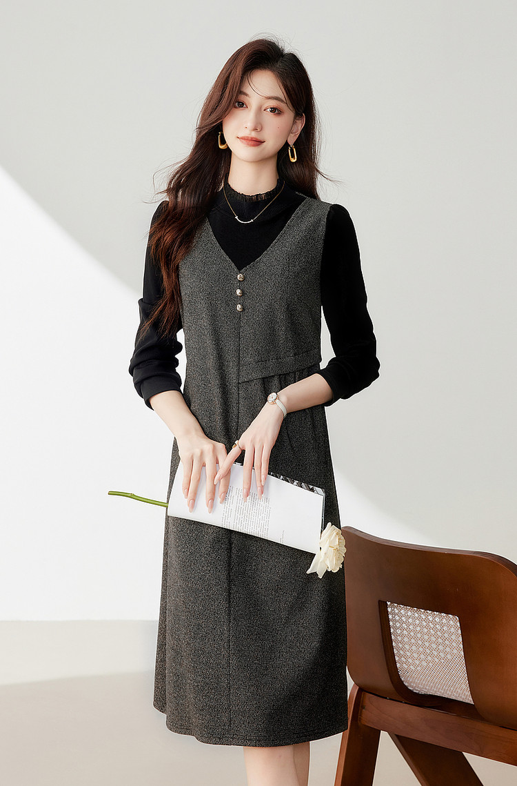 商品名称:时尚设计感连衣裙女显瘦洋气假两件遮肚子长袖打底裙 684888