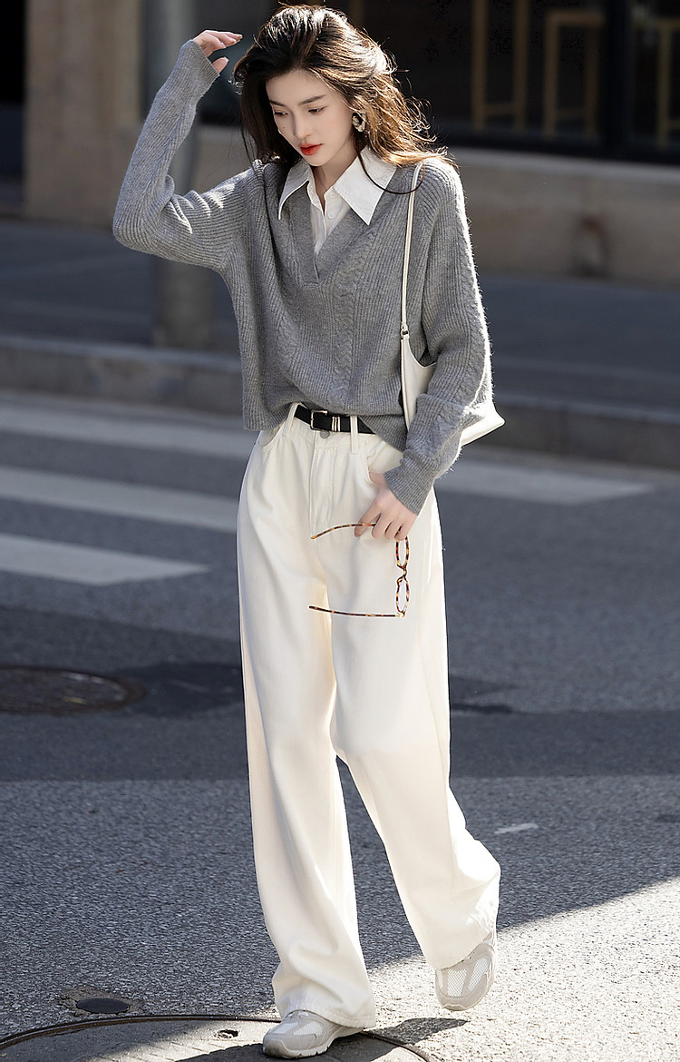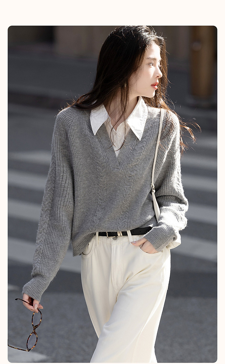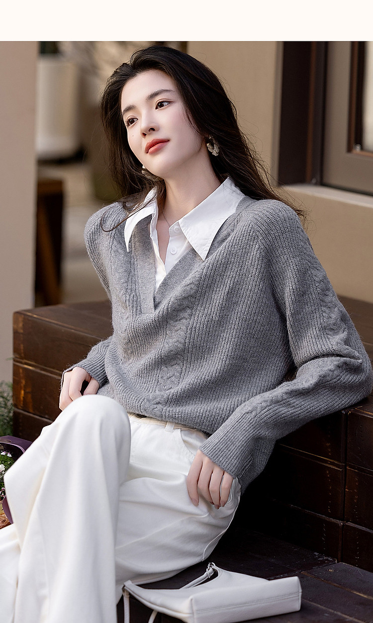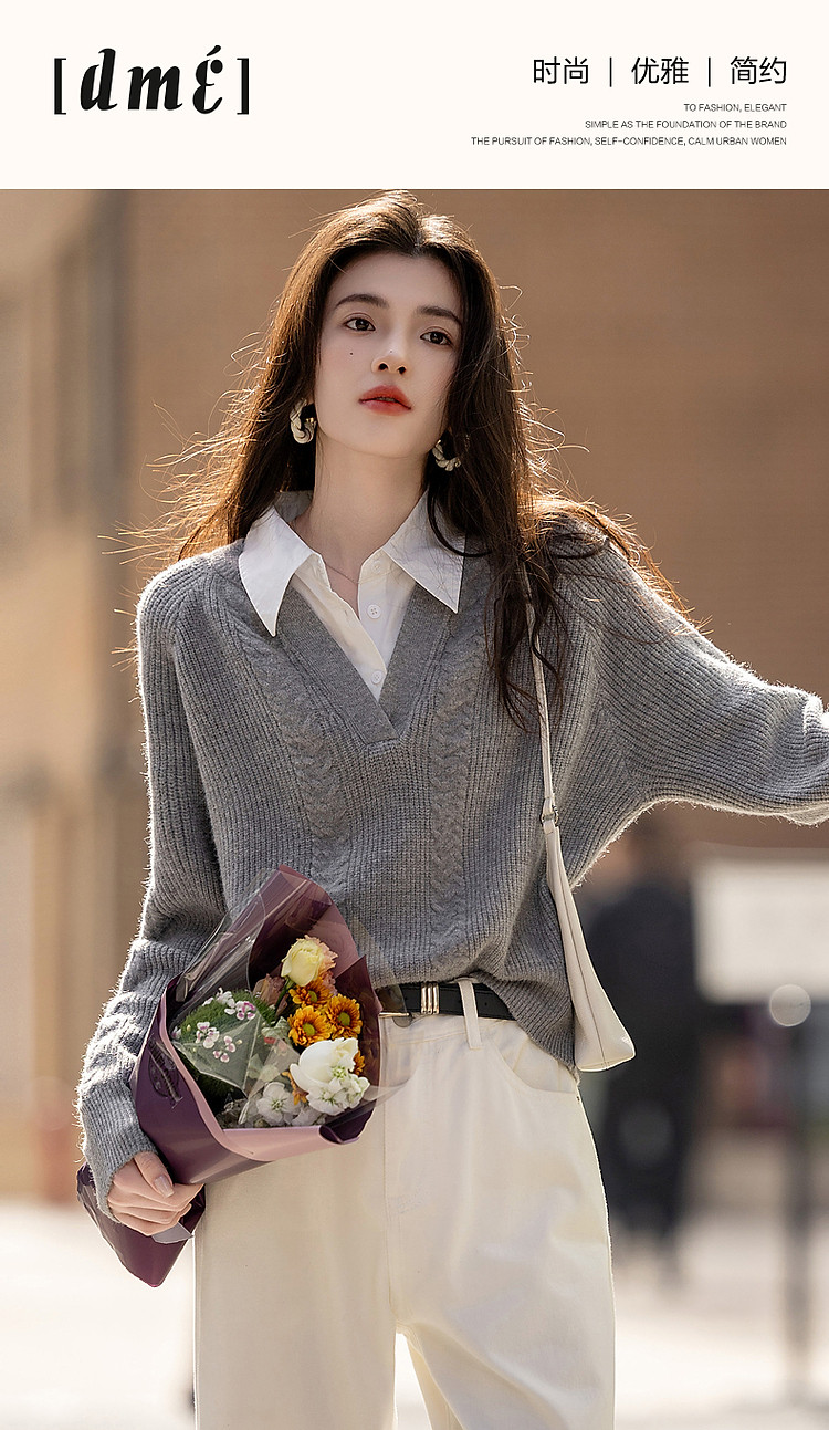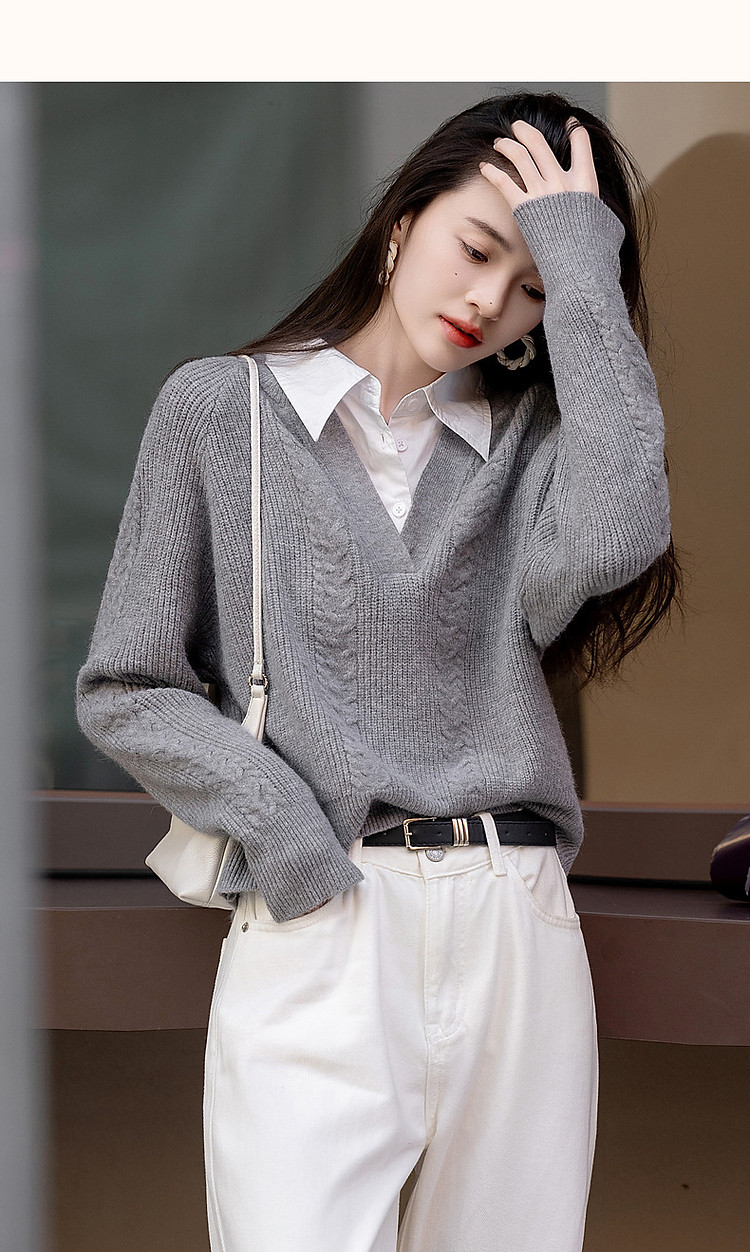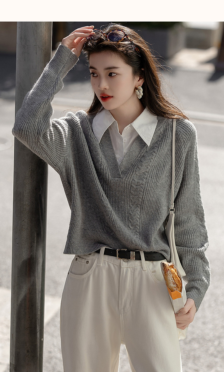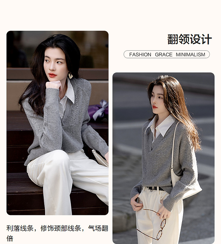 【云朵线衫】春秋简约风通勤拼接翻领舒柔纤绒纱遮肉针织衫女上衣 328385