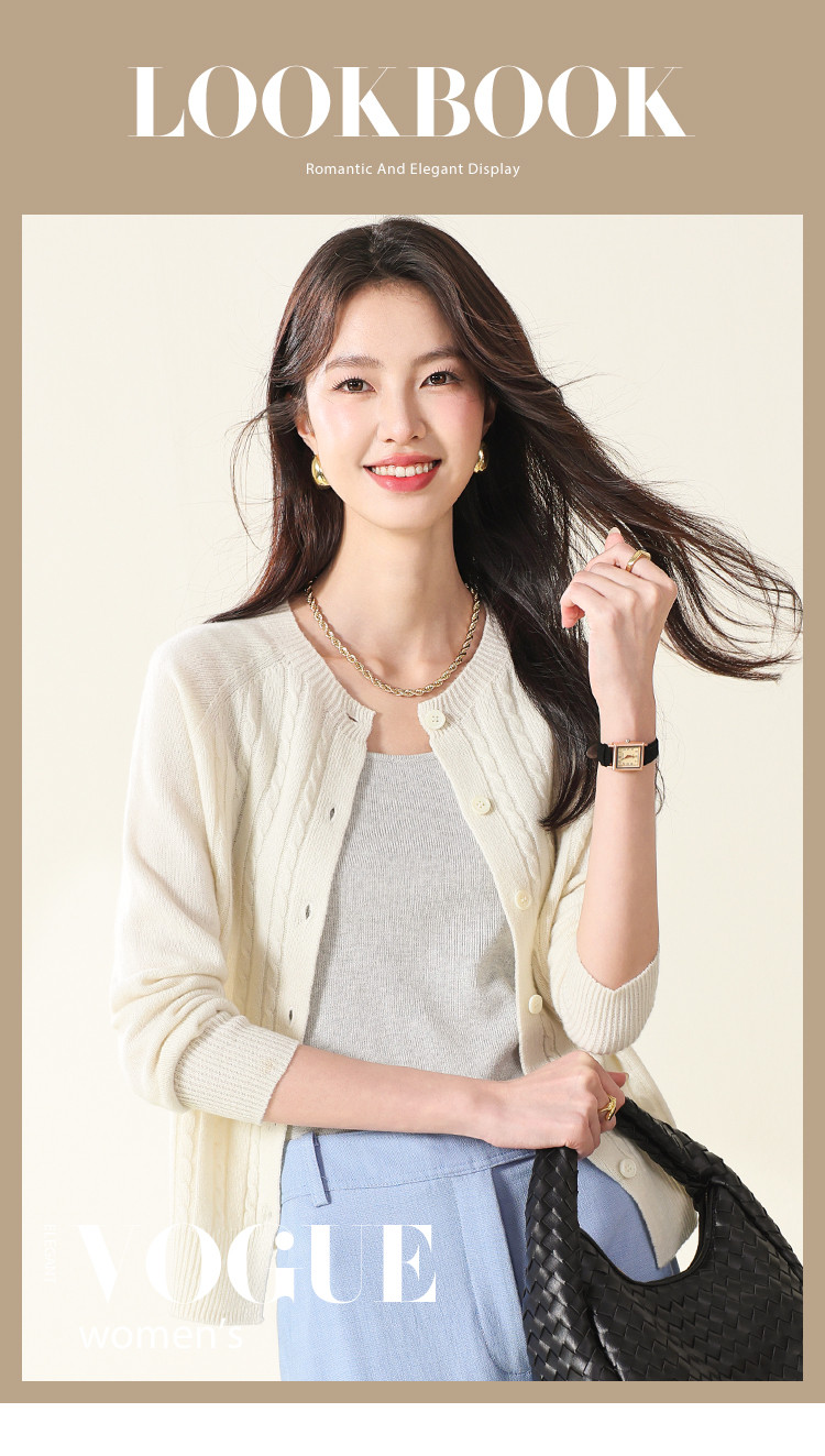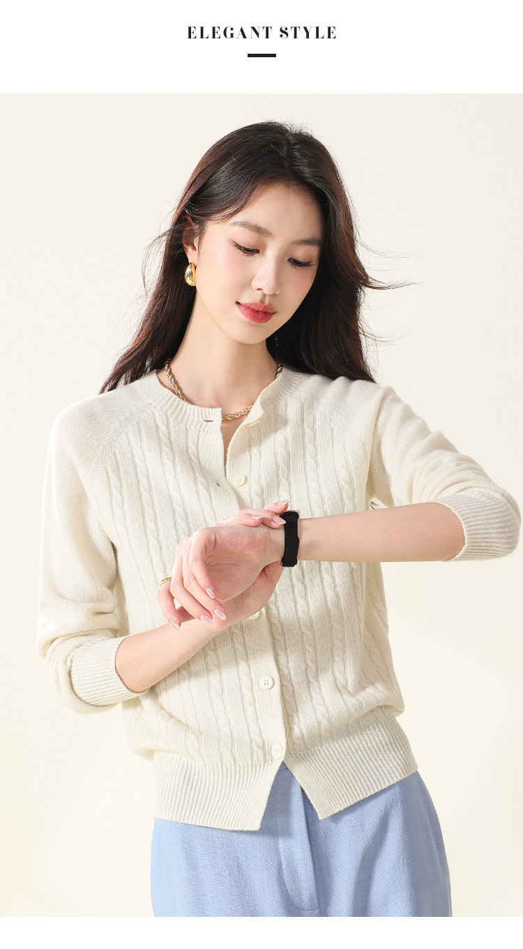 【无缝】100%羊毛圆领纯色绞花针织衫女开衫毛衣外套羊毛衫春 015059