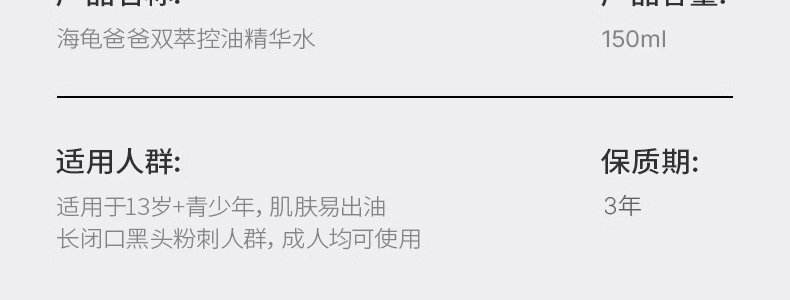 商品名称:海龟爸爸(Hipapa)双萃控油精华水 150ml 13岁+