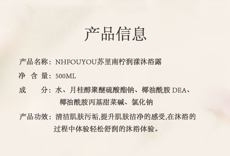 商品名称:NHFOUYOU/草本优子苏里南柠润漾沐浴露500ml