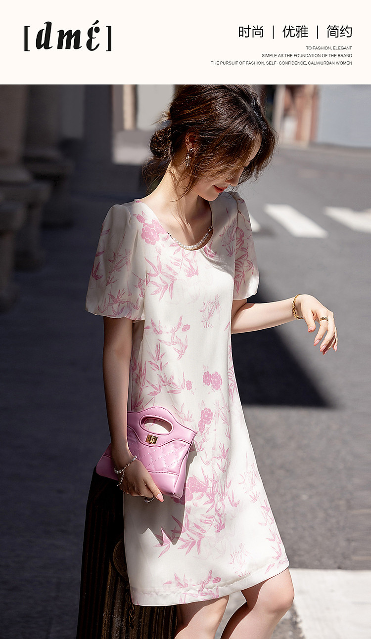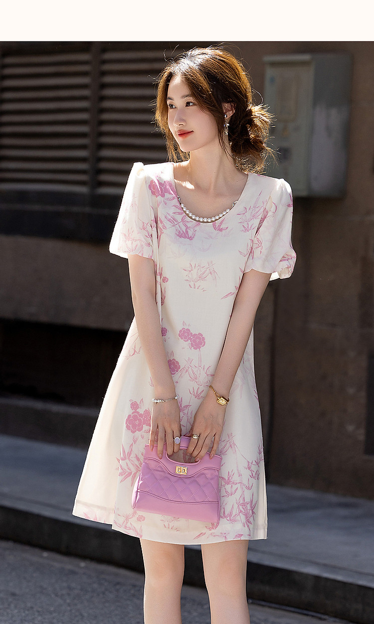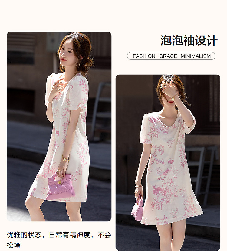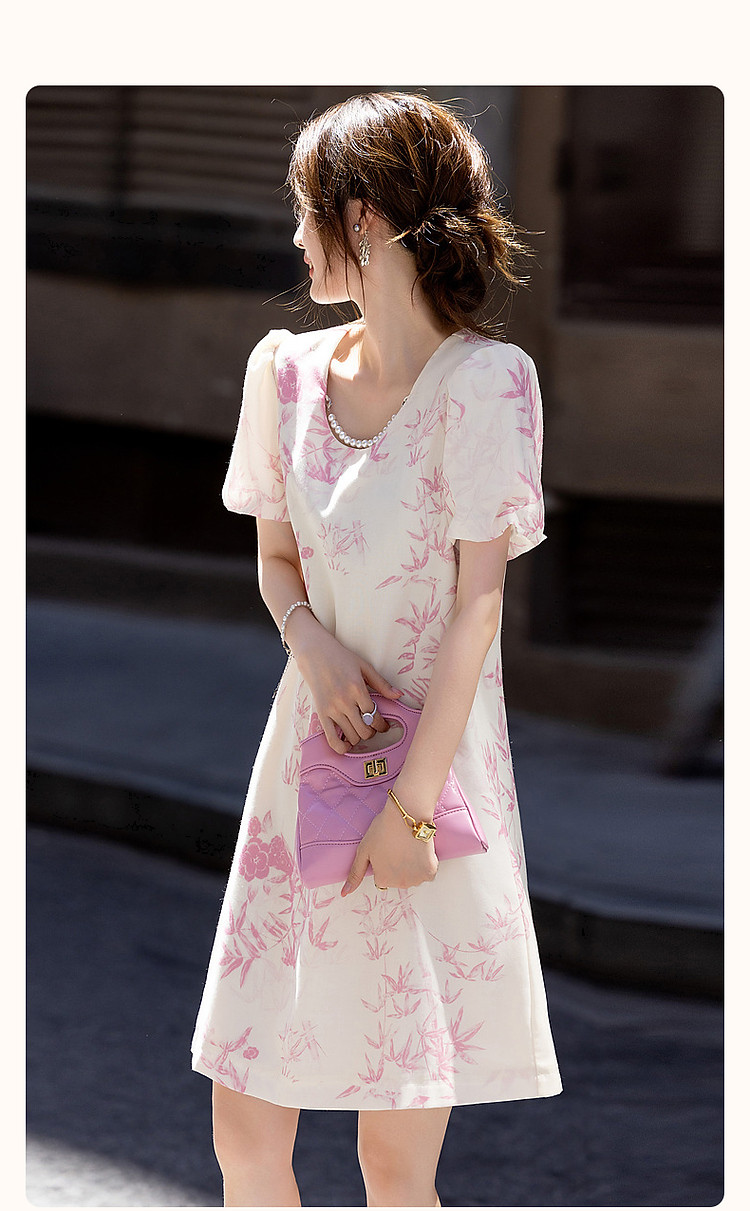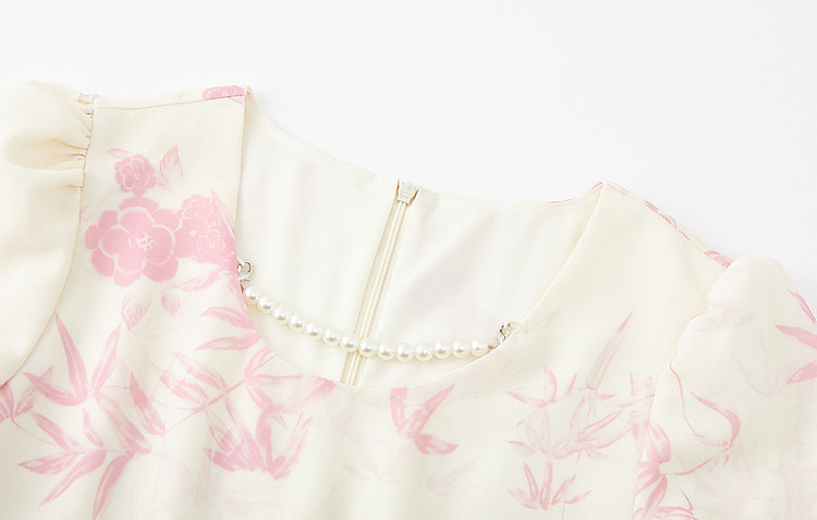 商品名称:【鸢花戏梦】春秋法式淑女可脱卸珍珠链条泡泡袖印花连衣裙女 520129