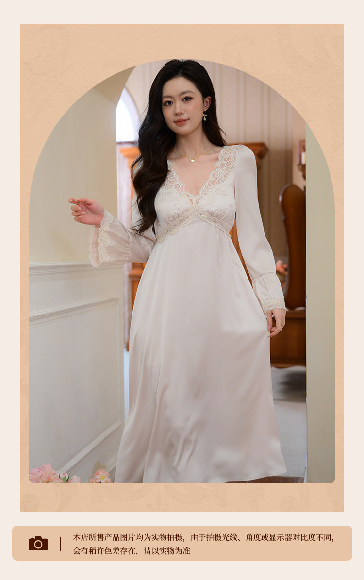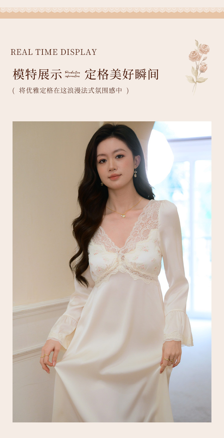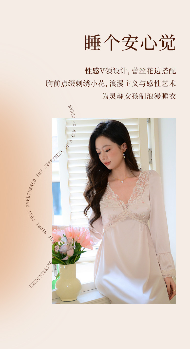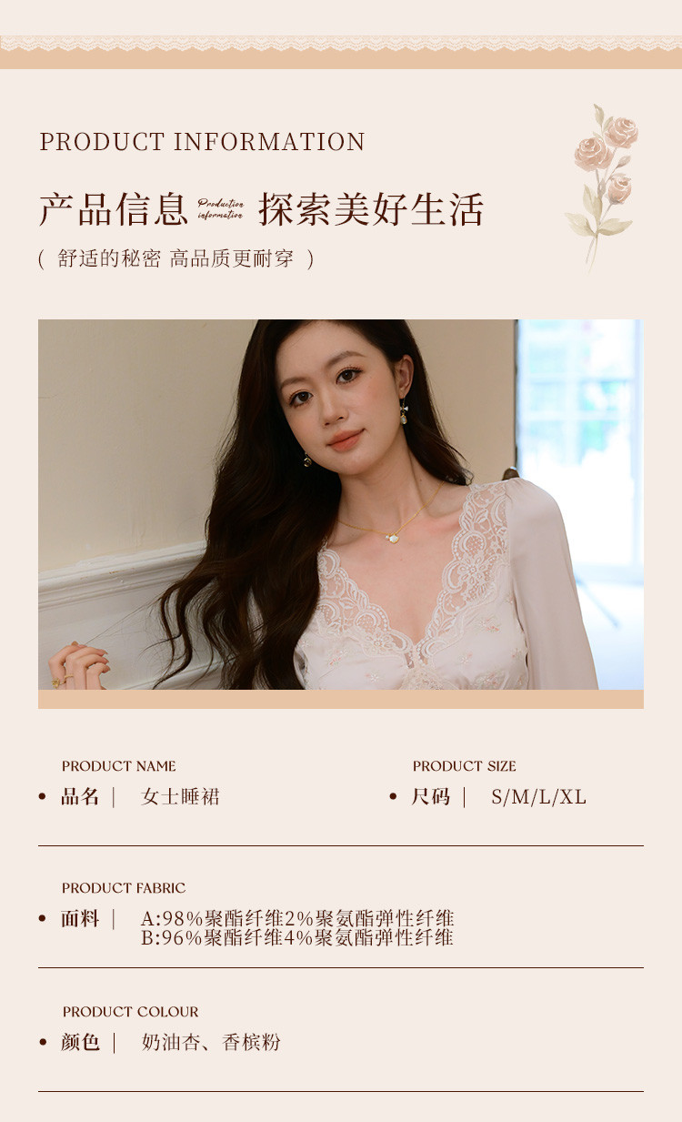 商品名称:【法式纯欲】带胸垫冰丝睡裙女士春夏性感蕾丝V领缎感家居服睡衣 955467