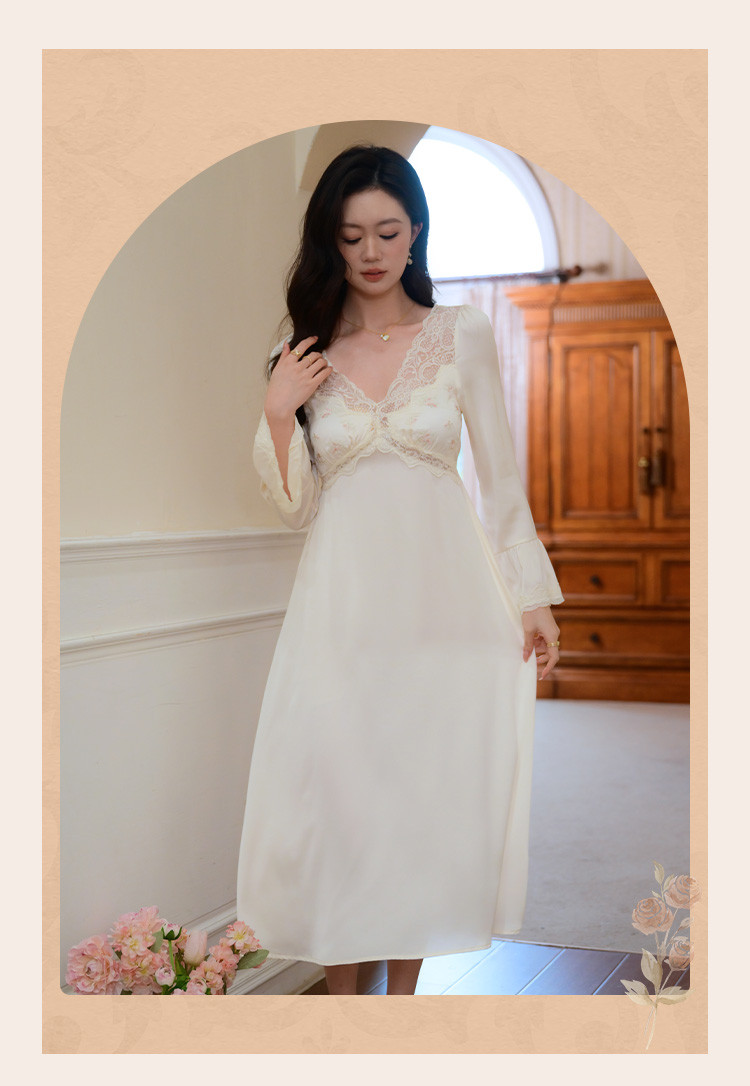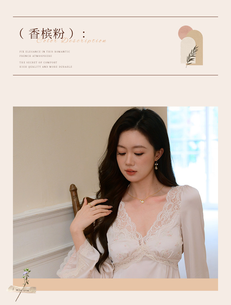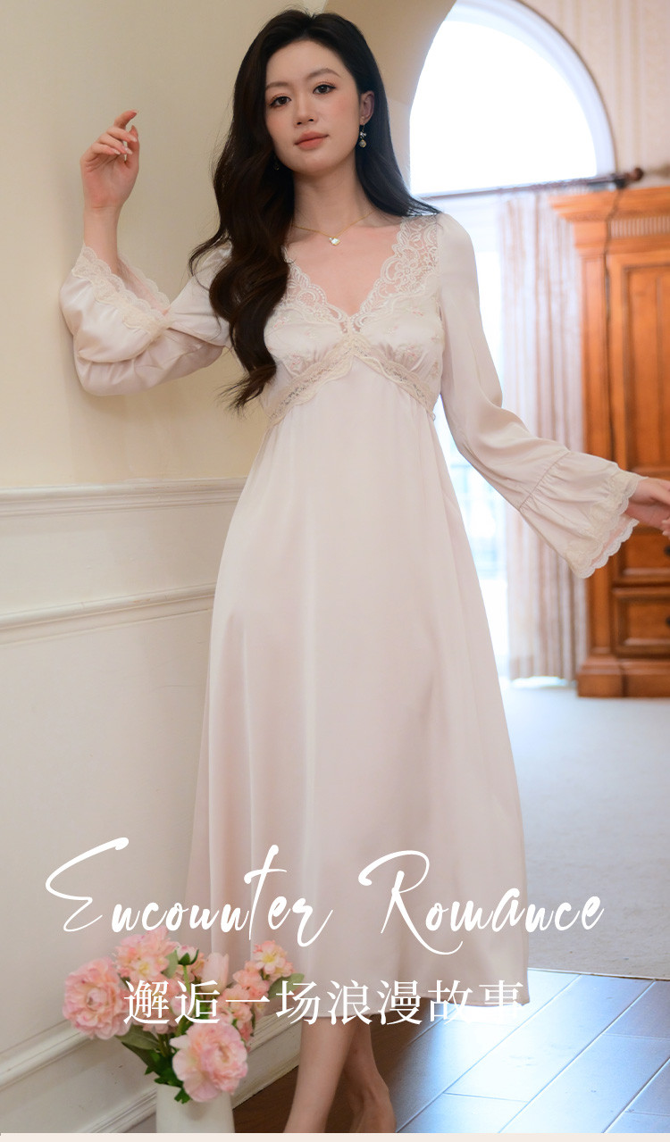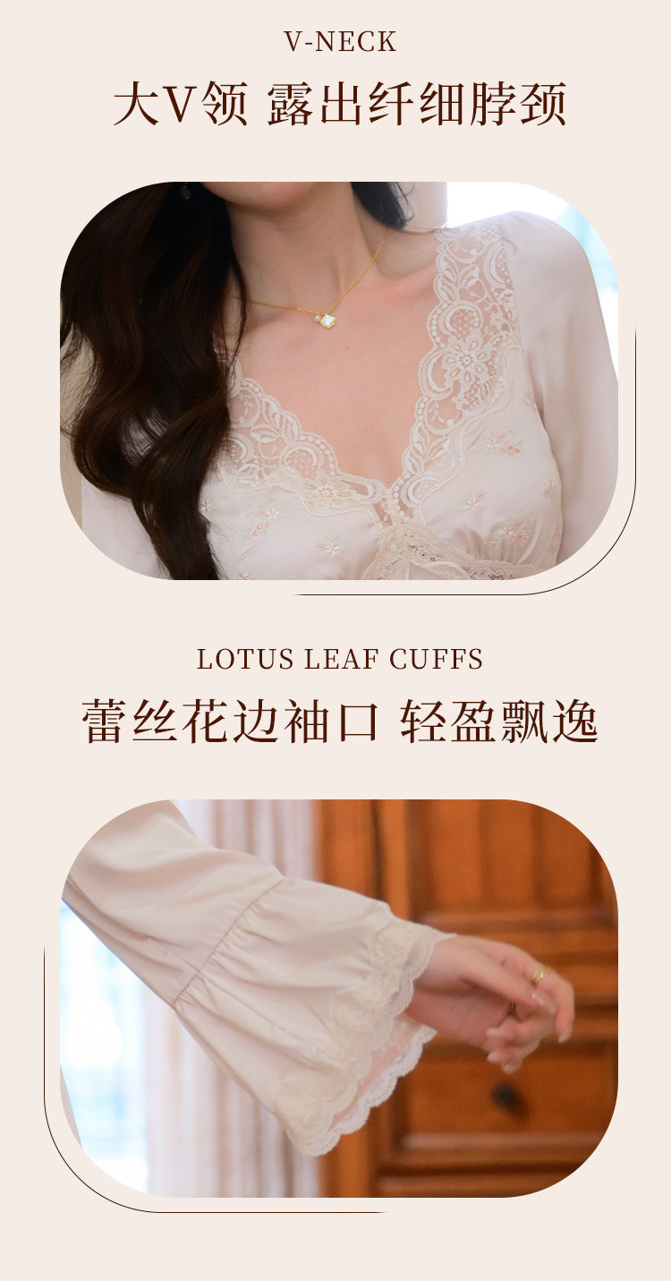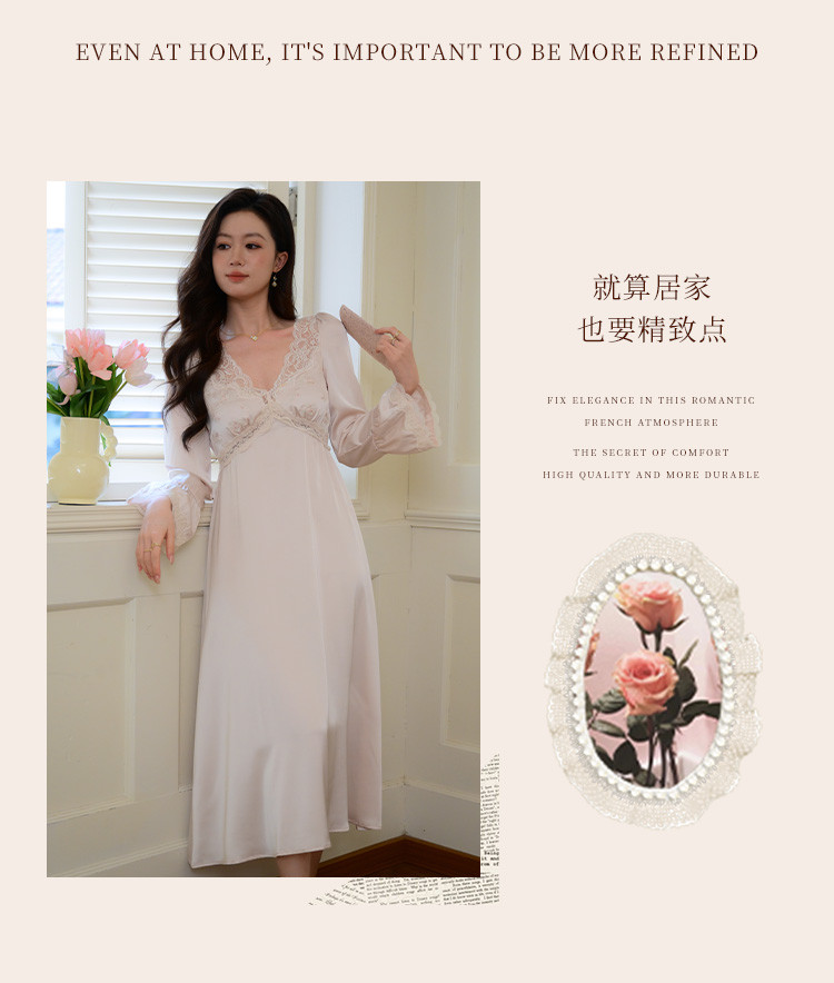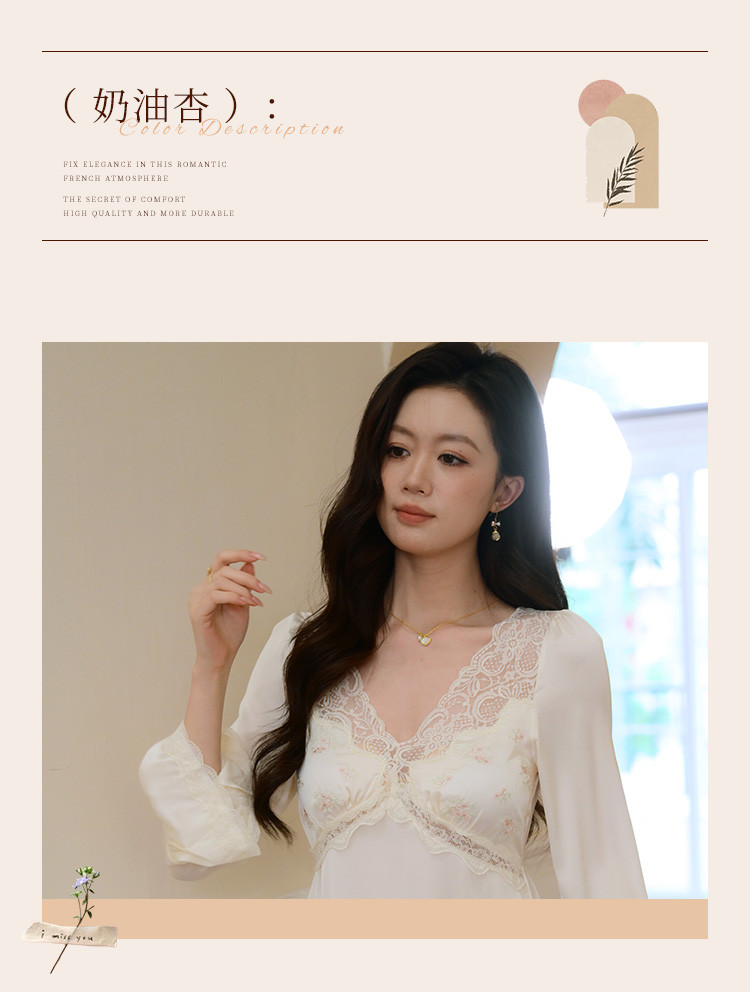 商品名称:【法式纯欲】带胸垫冰丝睡裙女士春夏性感蕾丝V领缎感家居服睡衣 955467