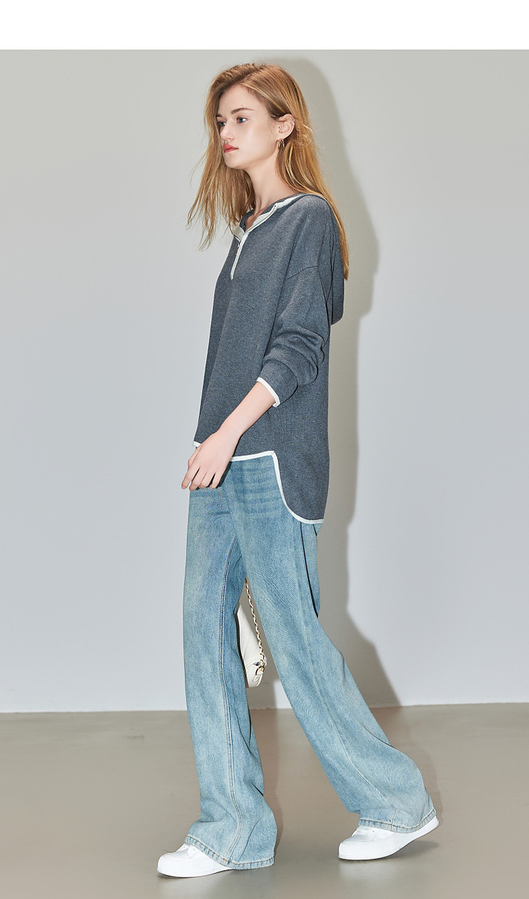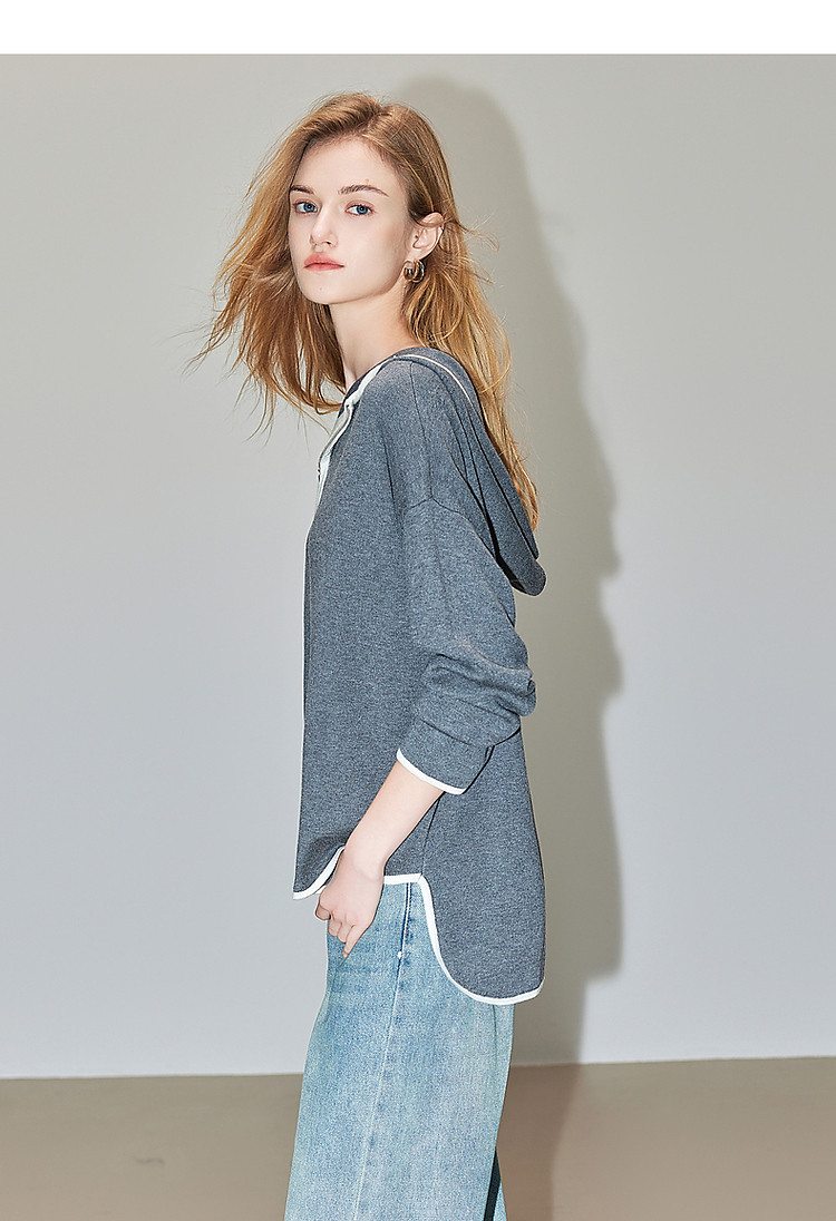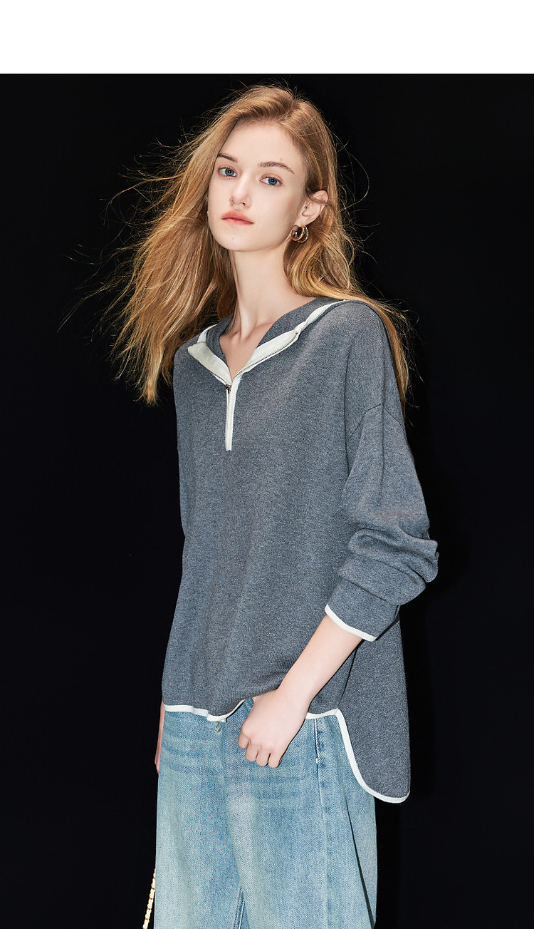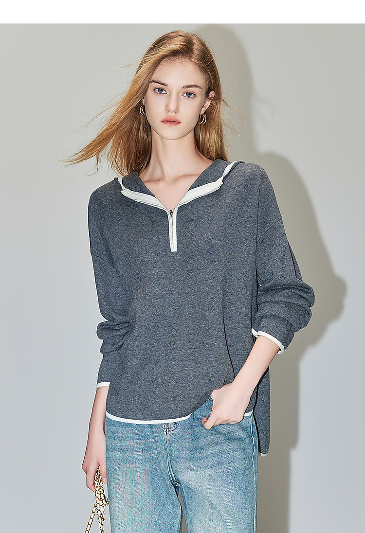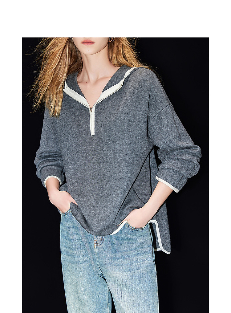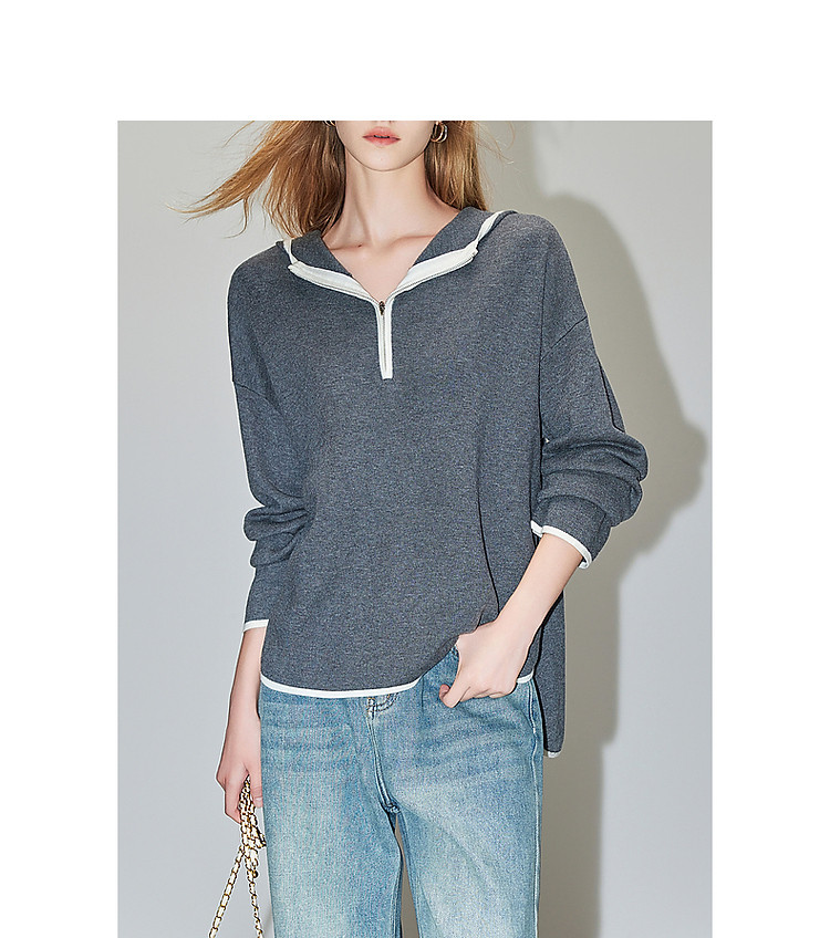 【向云端】春秋简约风连帽通勤撞色拉链线衫藏肉针织衫女上衣 956865